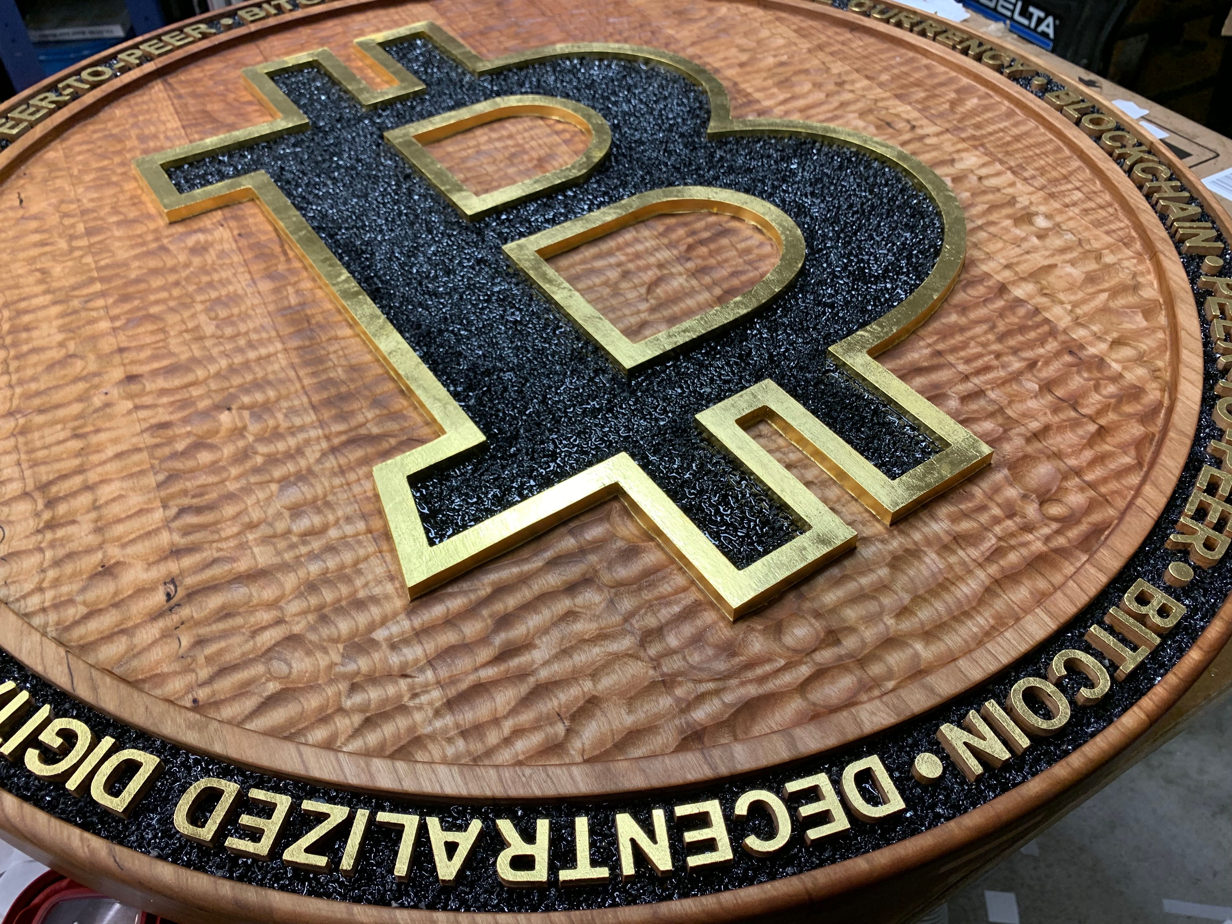 All letters and the Bitcoin outline are gilded with 99.9% pure, 24 carat triple gold leaf.