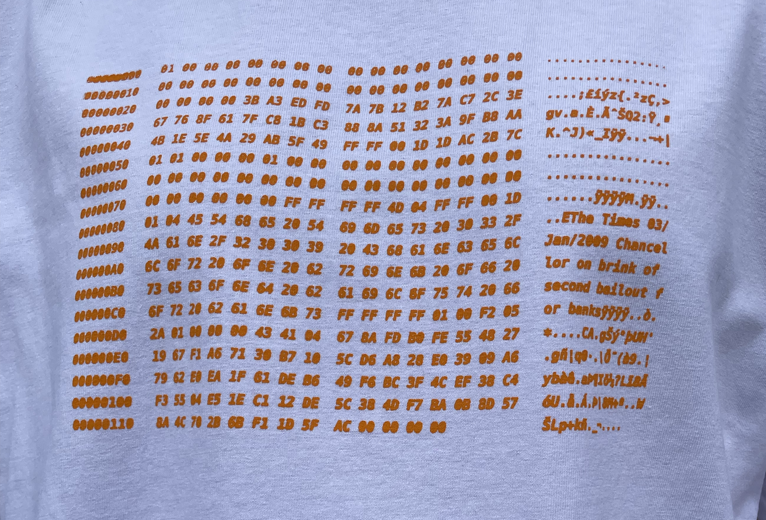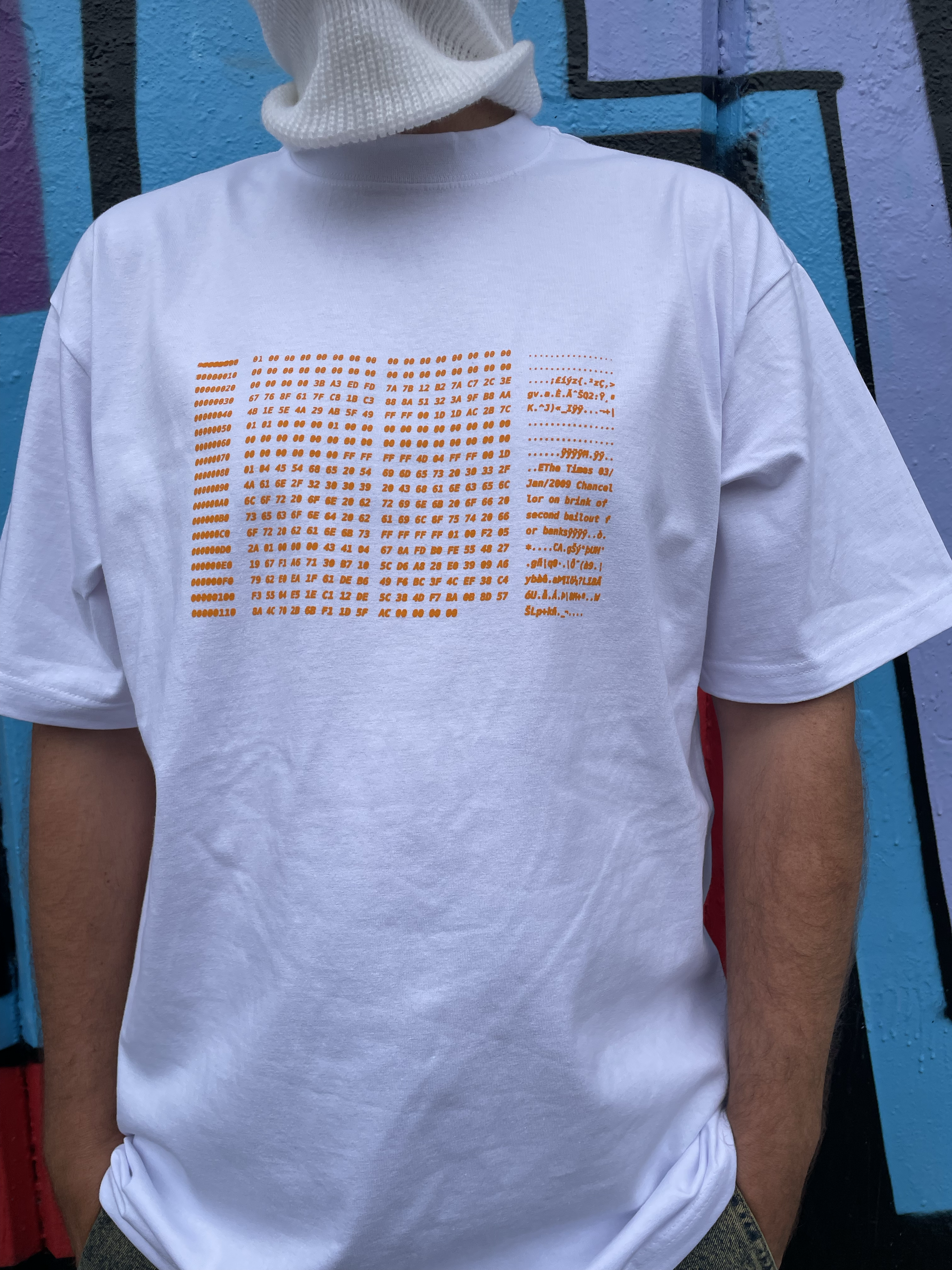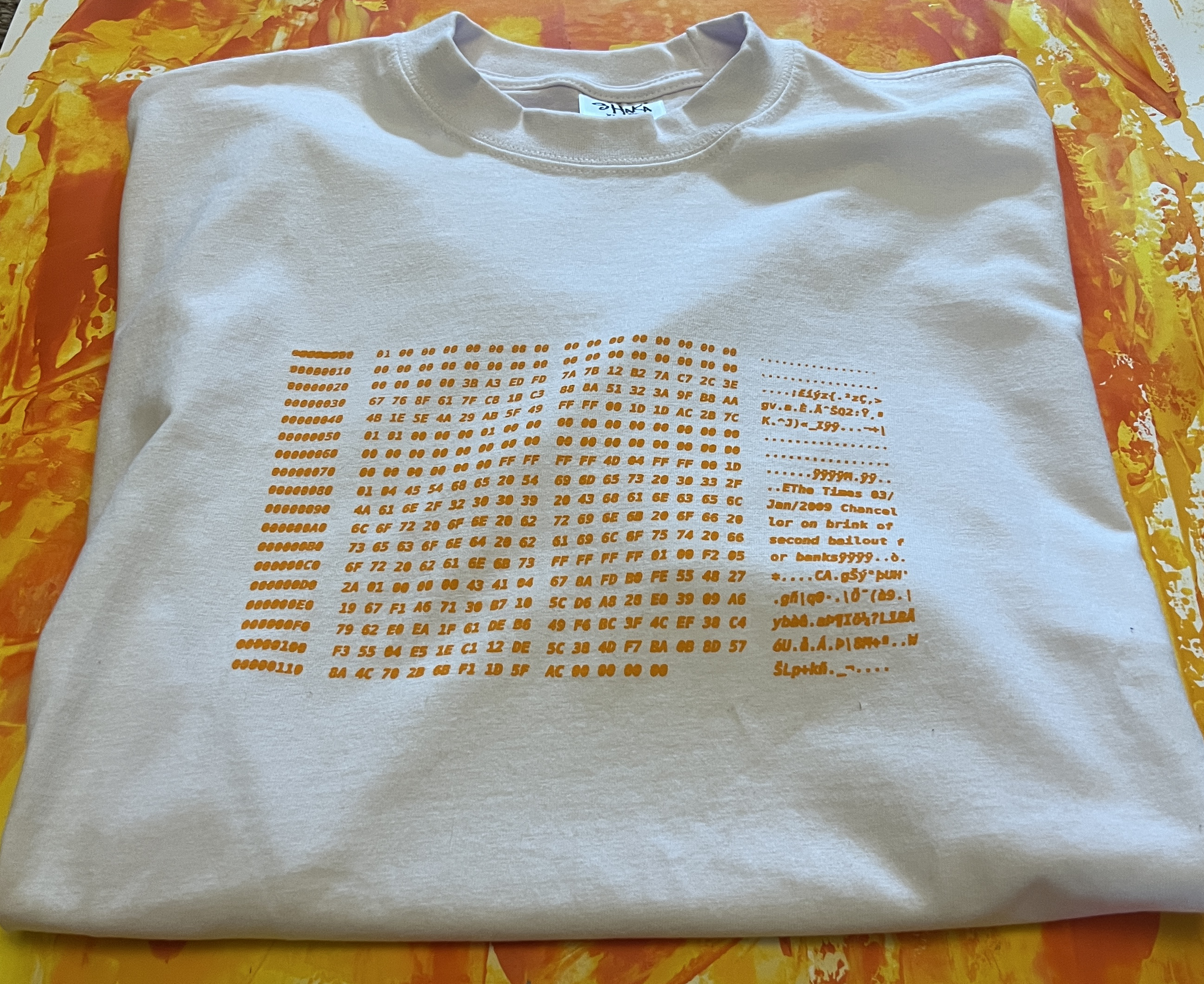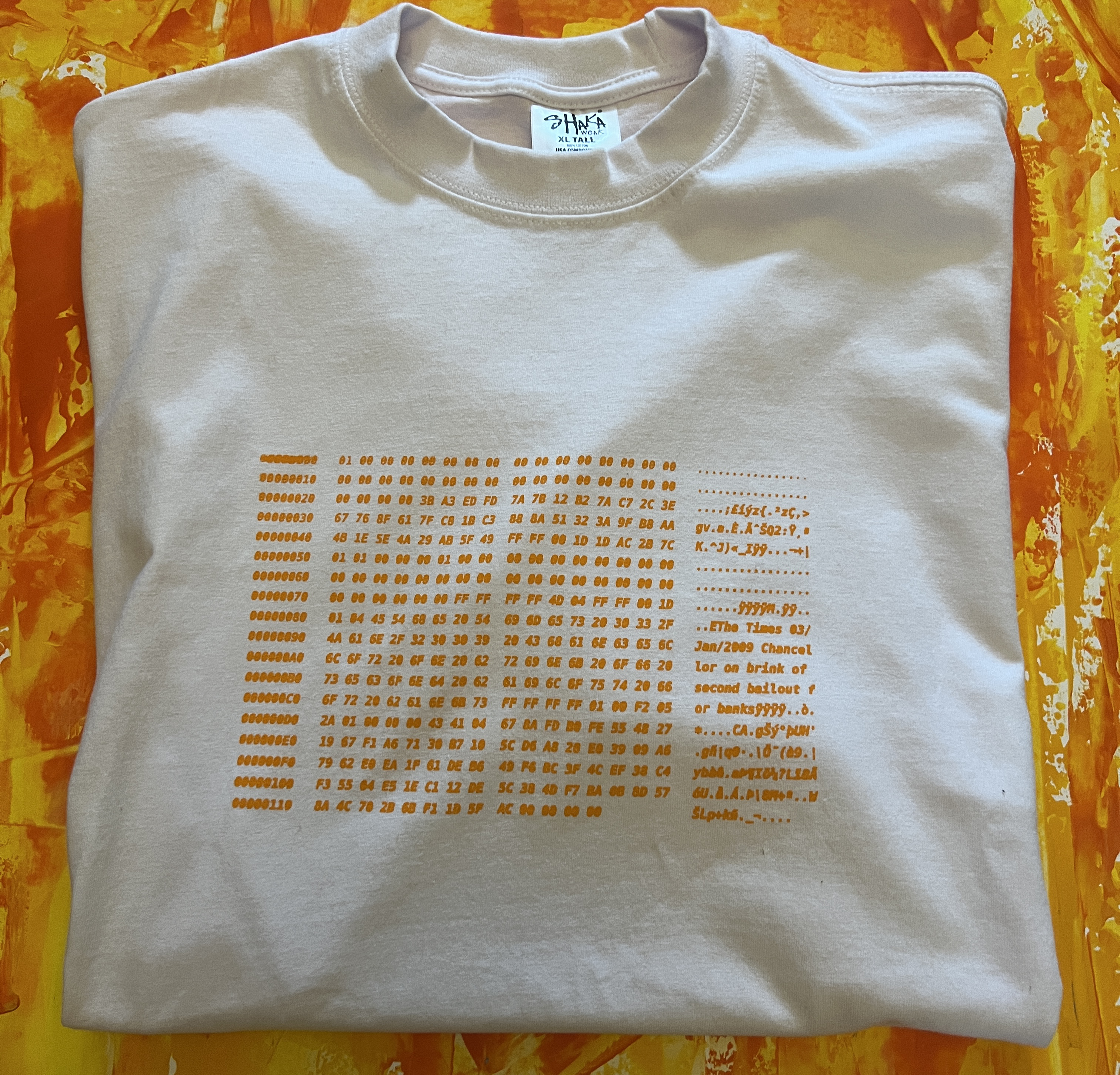 This one colour T-shirt print features the original Hex encoded genesis block and is inked in Indelible’s own mix of bitcoin orange (a tad brighter than some internet references to give a more impactful exclamation point to the design)