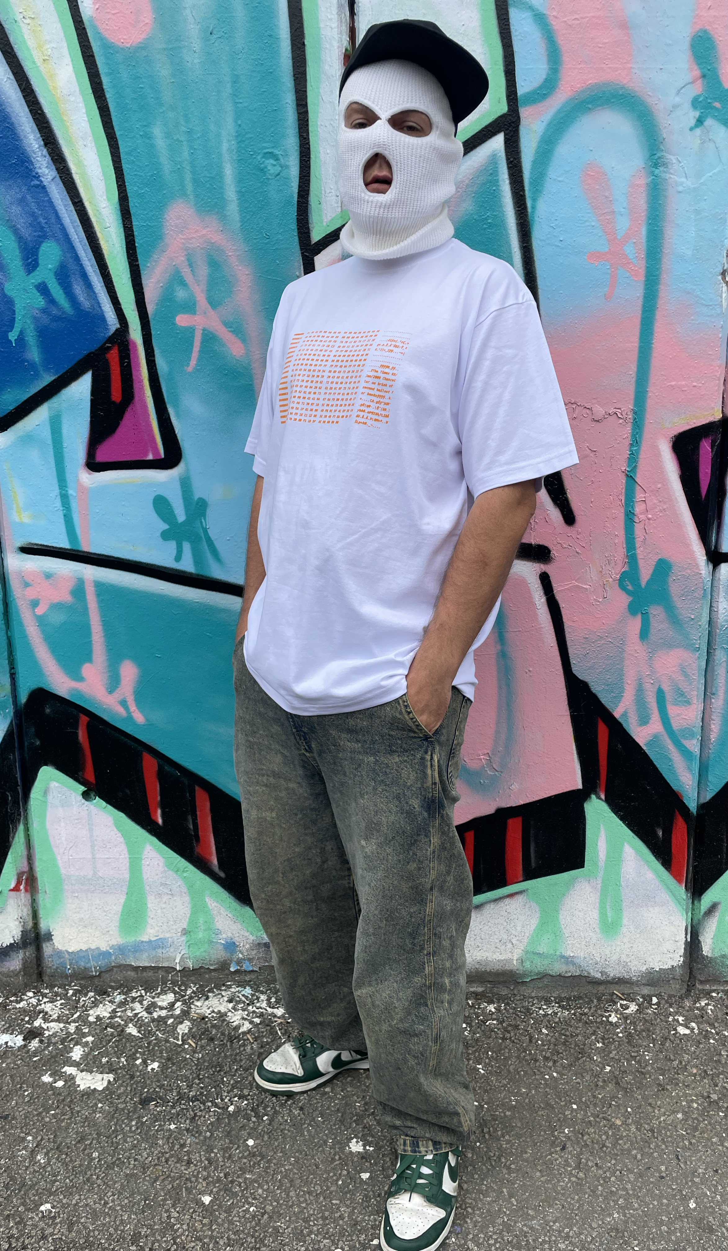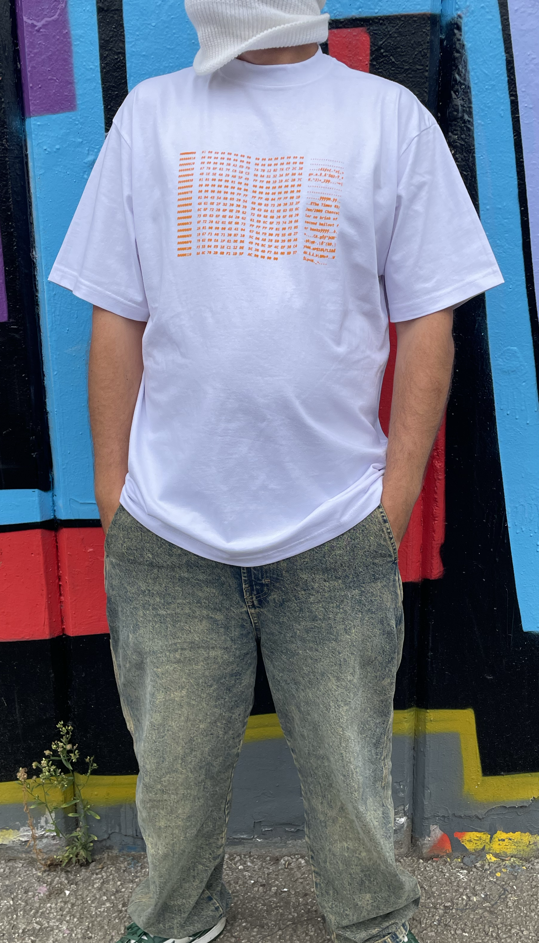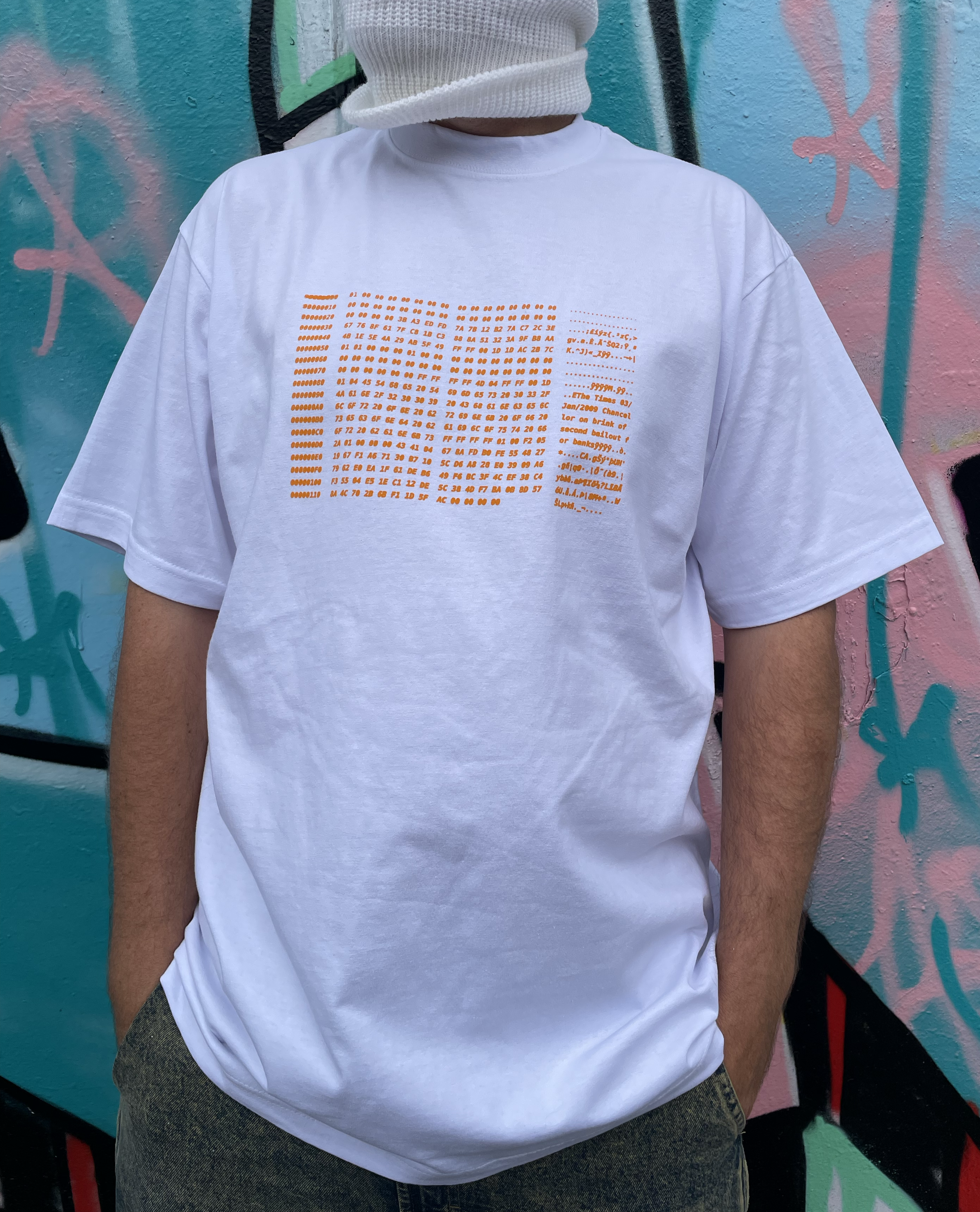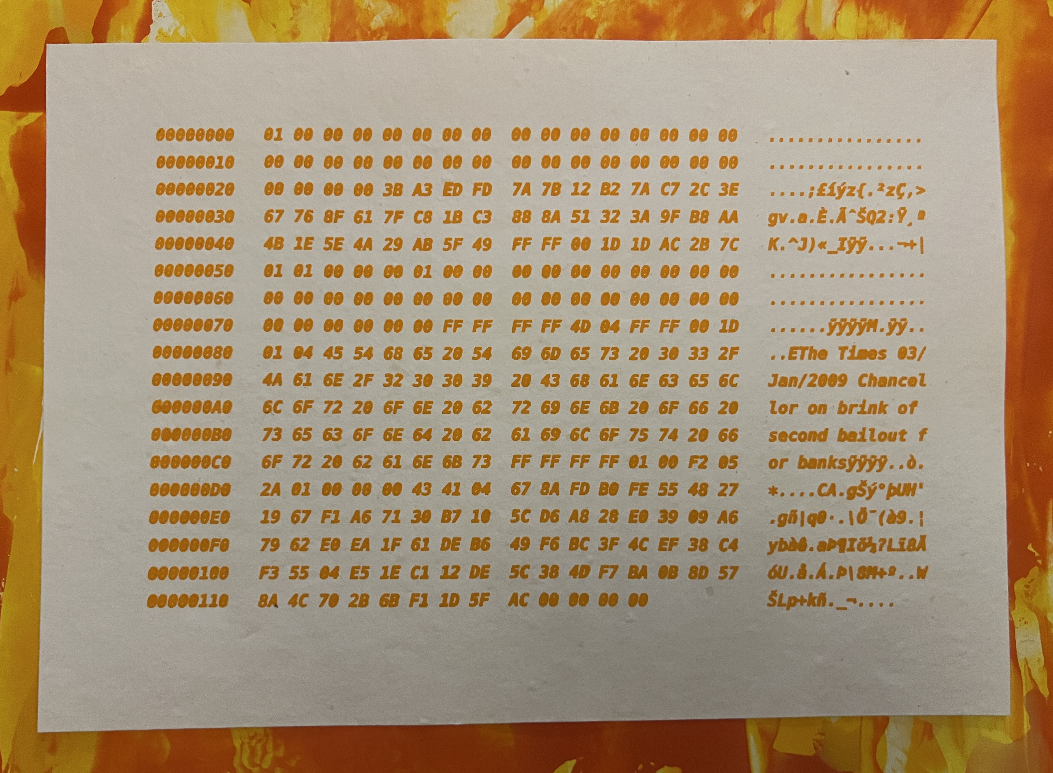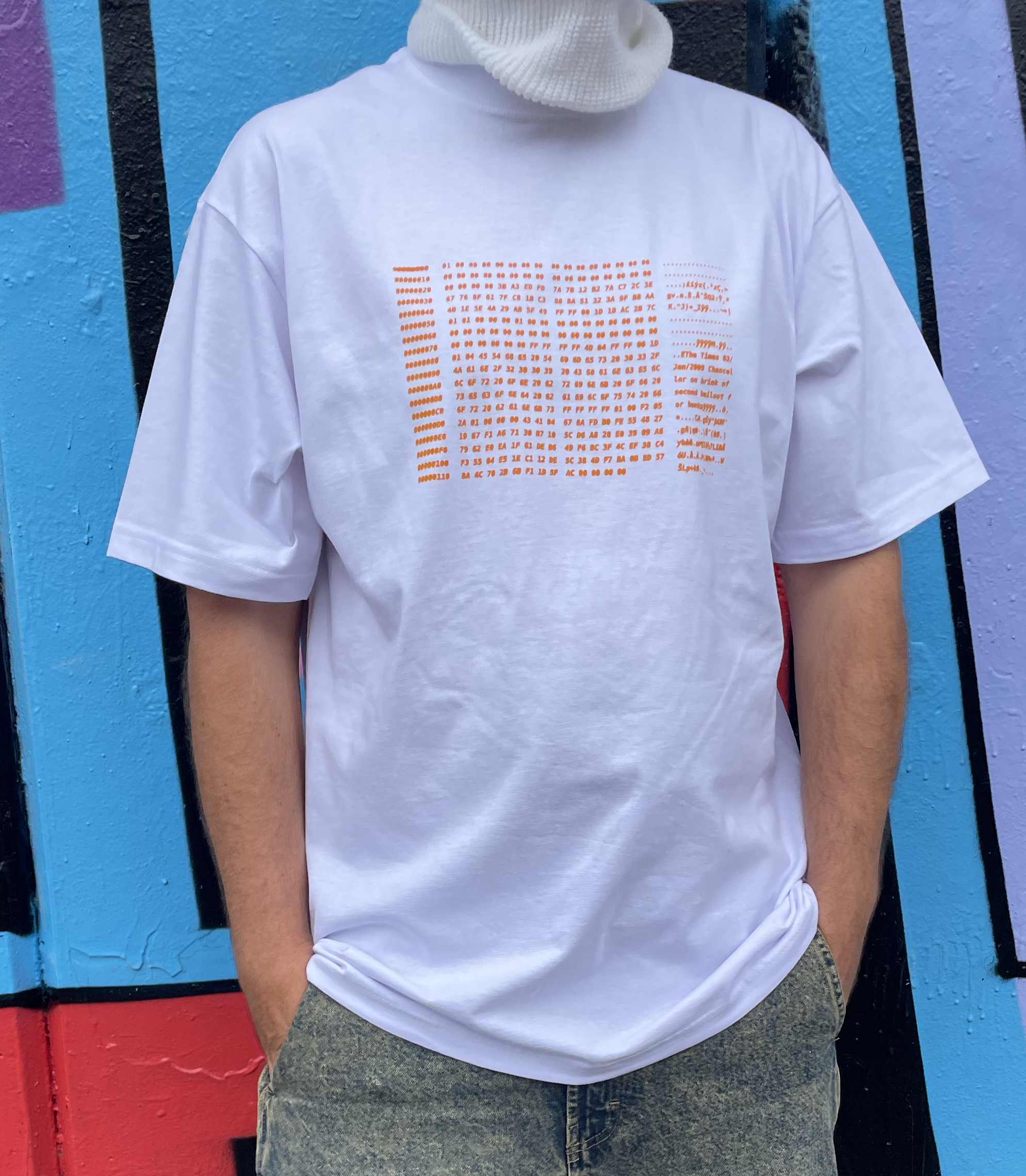 This one colour T-shirt print features the original Hex encoded genesis block and is inked in Indelible’s own mix of bitcoin orange (a tad brighter than some internet references to give a more impactful exclamation point to the design)