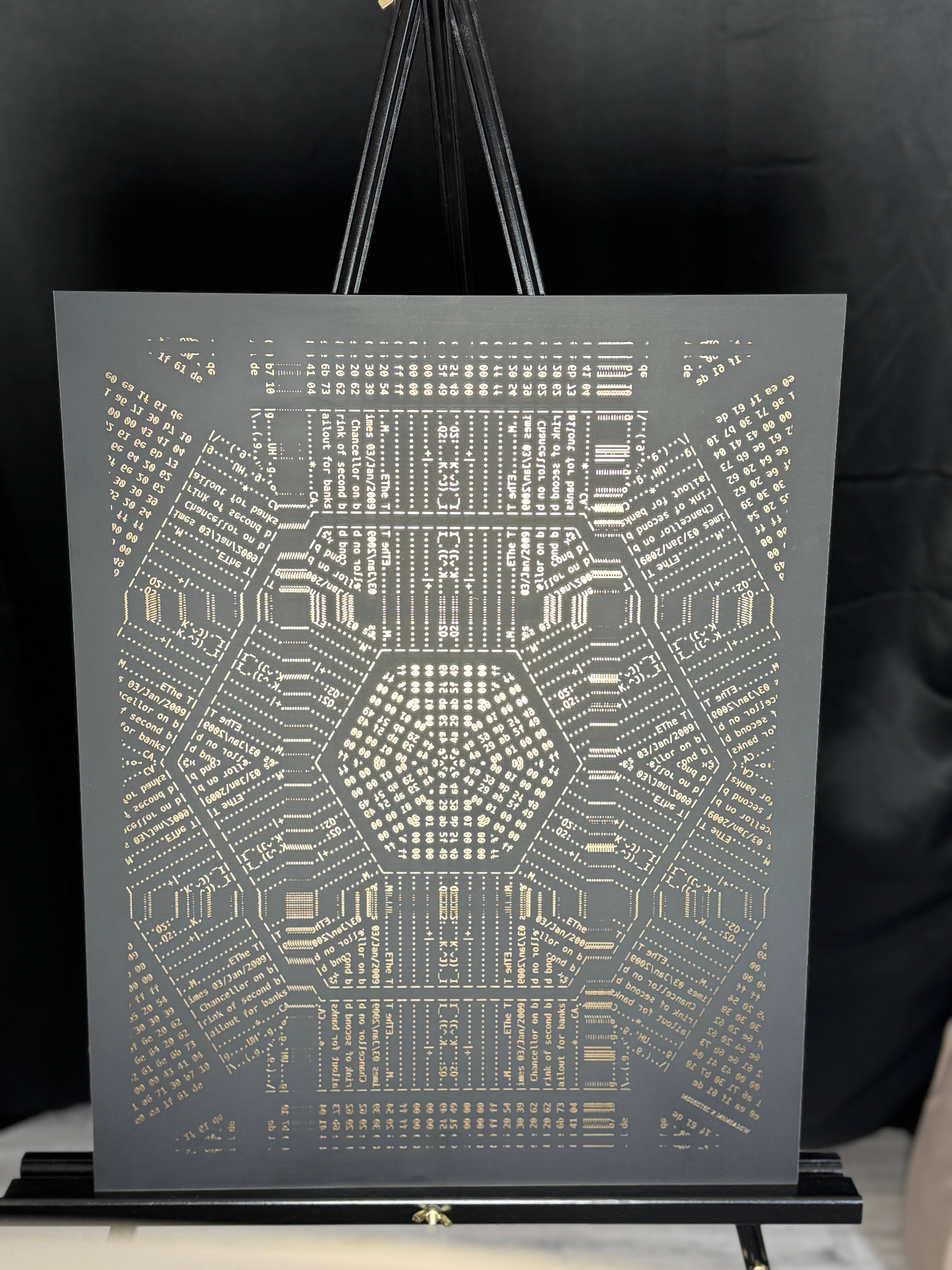 Inspired by this, I created a PCB artwork featuring the Genesis Block's raw version, transforming the code and its historic message into a physical expression of Bitcoin’s origins.