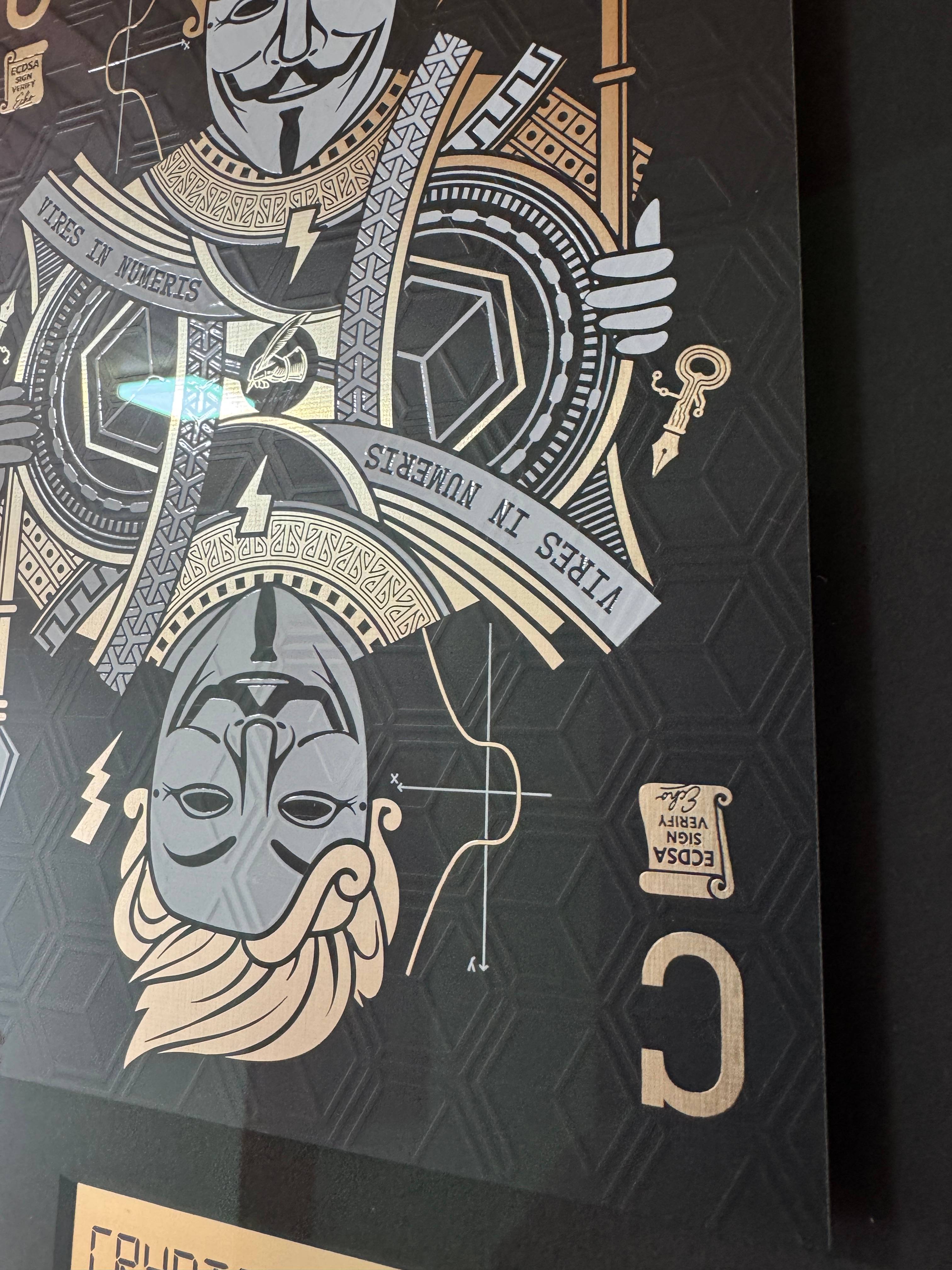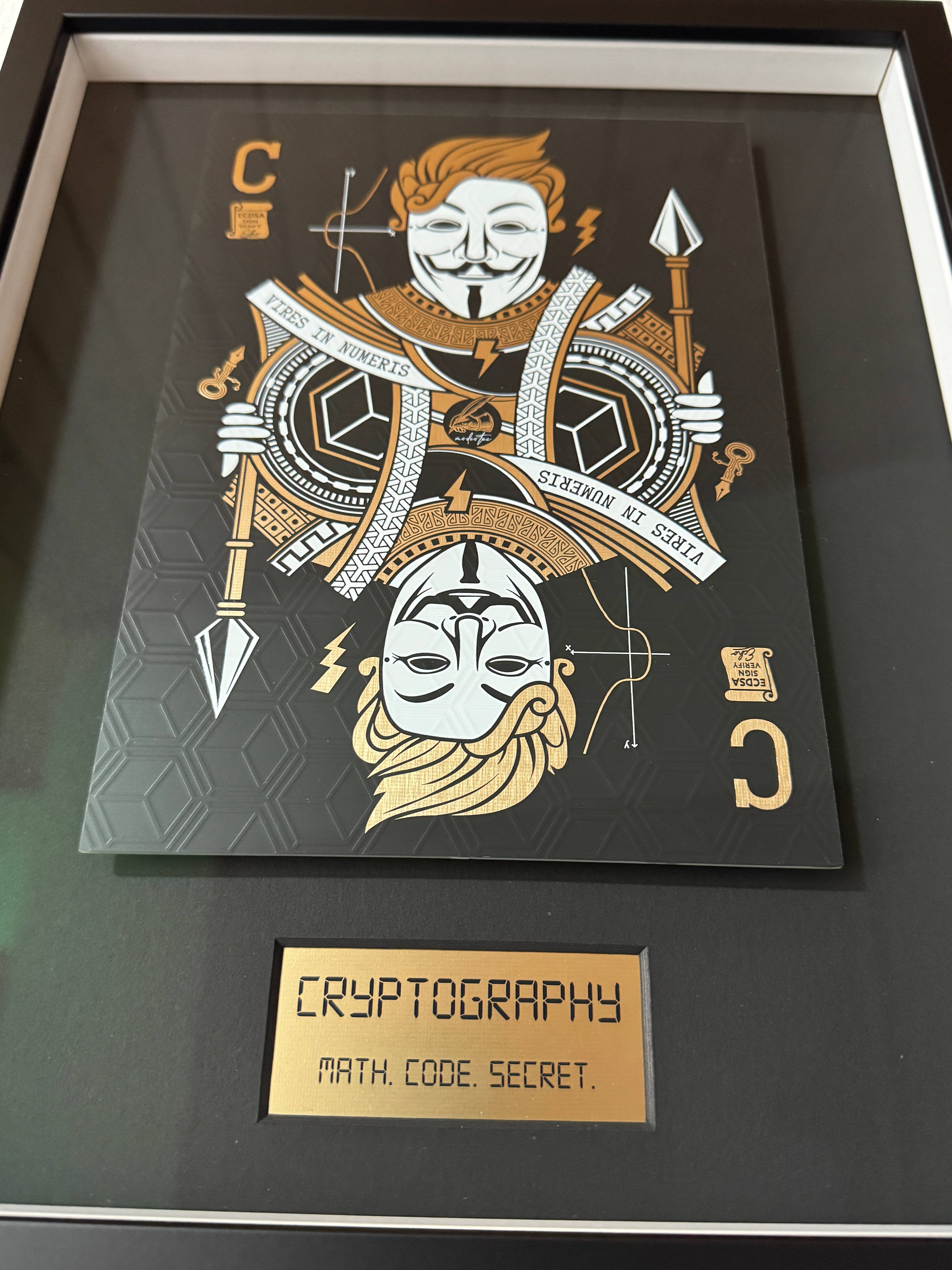 PCB Artwork by Modeotec, 2025. Limited to 21 pieces. Cryptography is the guardian’s spear, forged from mathematics, aimed at corruption. It strikes with precision, defends the protocol, and ensures that no one can alter the truth. In the hands of a true protector, it is both weapon and wisdom. Math. Code. Secret.