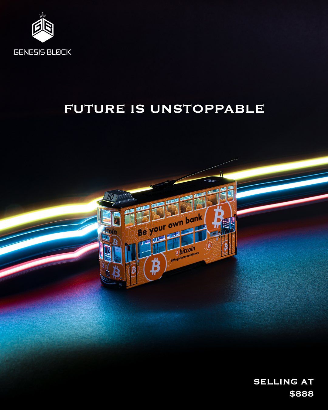 The Bitcoin Tram is an initiative of the Hong Kong Bitcoin community. Three trams rode up and down Hong Kong Island in September 2020 in full Bitcoin livery. This model is a scale of 1:76 metal die cast of 11.5cm in length. It comes in a plexiglass box and can be removed from its base.