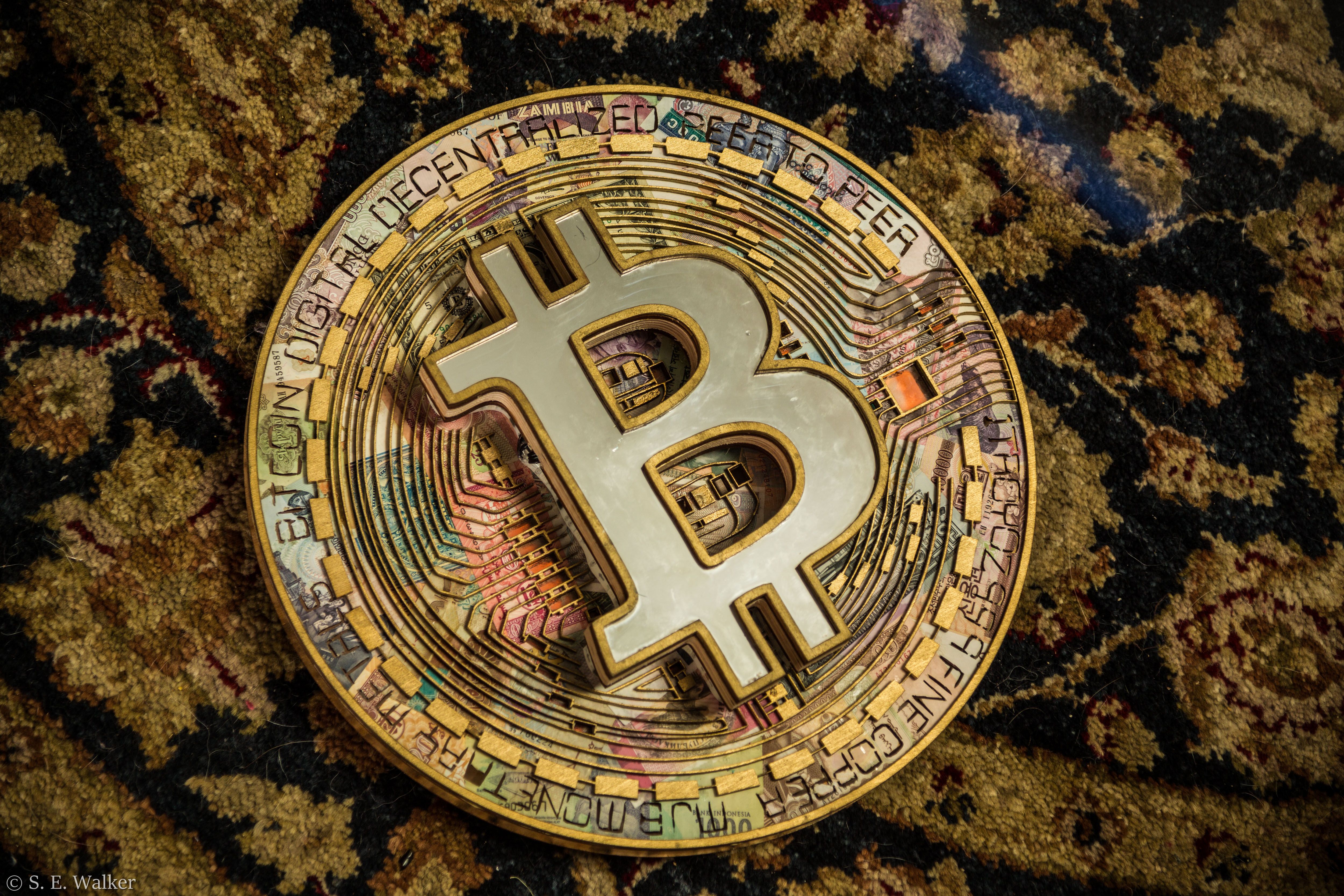 face of the Bitcoin are multiple notes of fiat currency from all over
