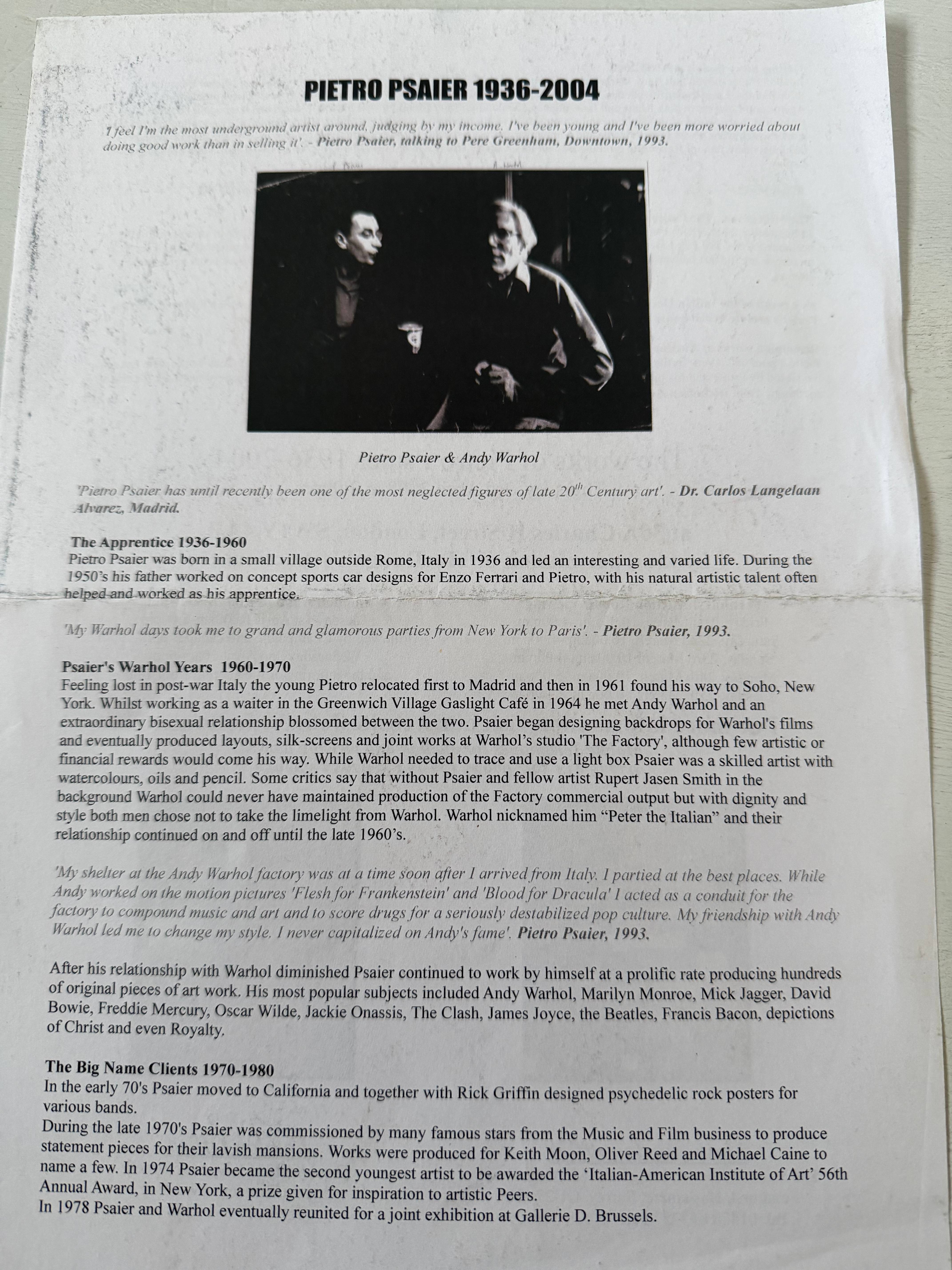 Few figures in the Pop Art narrative spark as much debate as Pietro Psaier. This piece bears the bold, fluid signatures of both Psaier and Andy Warhol, serving as a physical testament to a relationship that has fueled decades of art-world speculation. Psaier claimed a long history of collaboration within Warhol’s Factory, often operating in the "renegade" corners of the scene where traditional documentation was secondary to the act of creation itself.