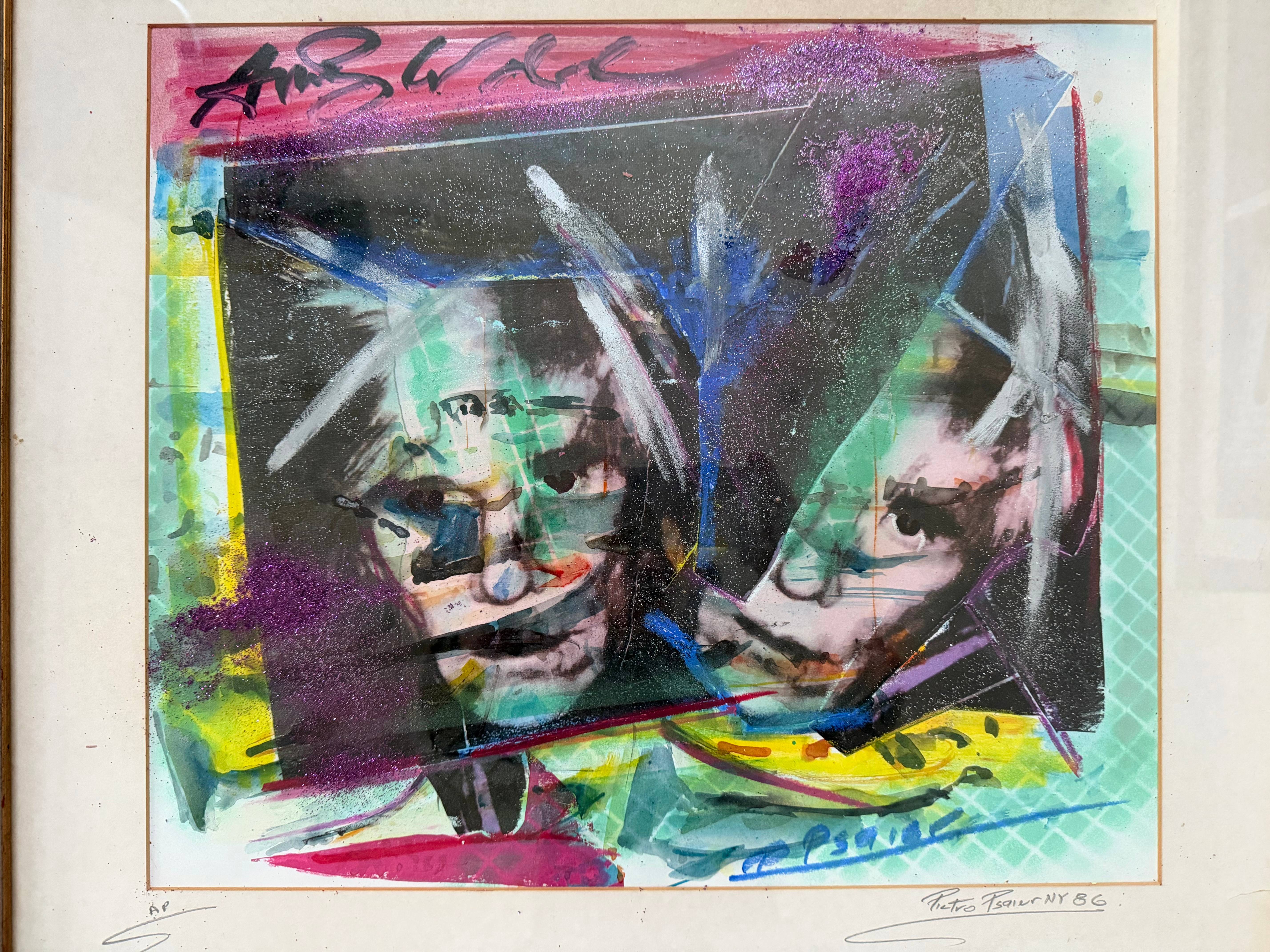 Pietro Psaier (1936–2004) & Andy Warhol (1928–1987) Mixed media on paper: Watercolor, monochrome silkscreen, oil stick, pastel, and "diamond dust" pigments. Circa 1986 | Hand-signed by both artists | Artist Proof (A.P.)