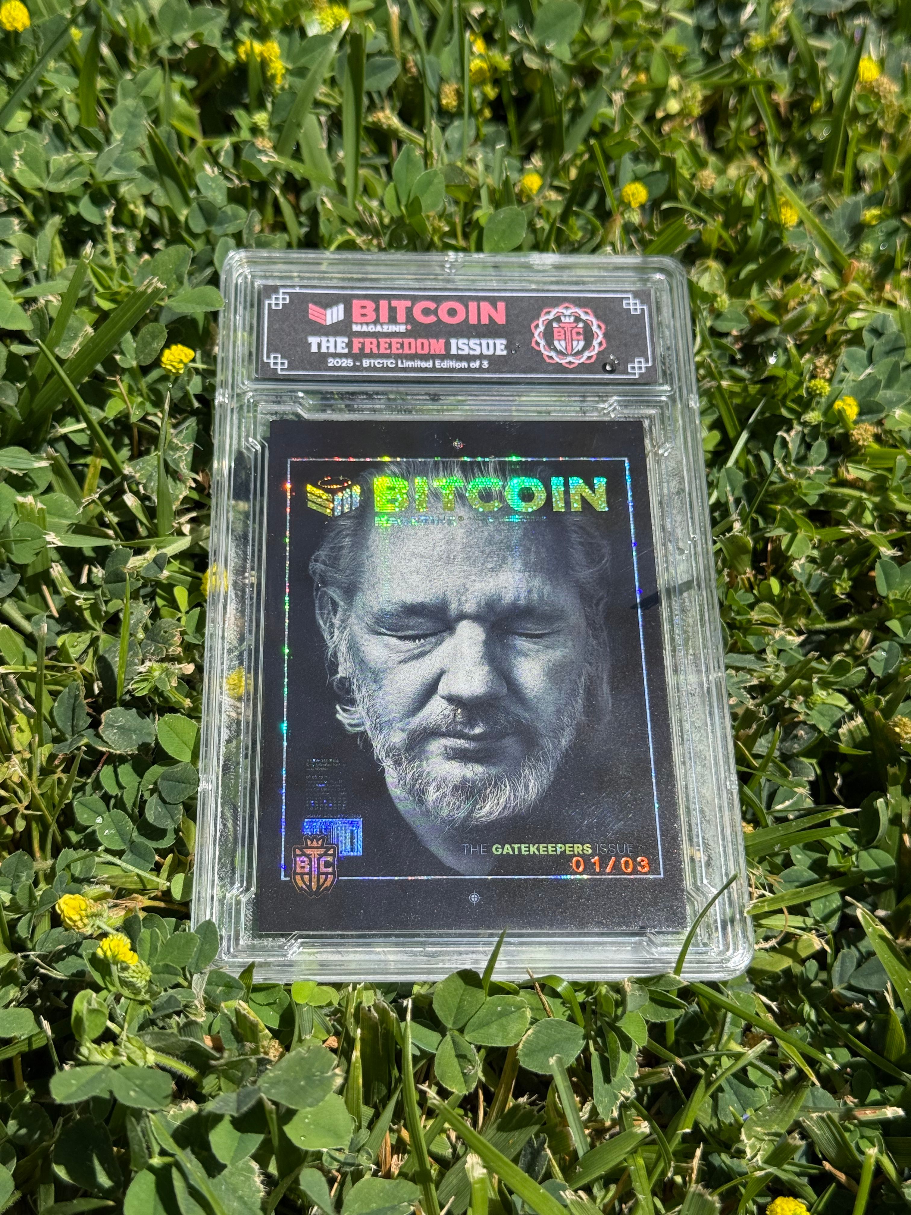 Offered here is an exceptionally rare and meticulously crafted collectible: Card 1 of only 3 from the Freedom Issue Parallel Series, a singular artistic tribute to the historic collaboration between Bitcoin Magazine and Bitcoin Trading Cards.