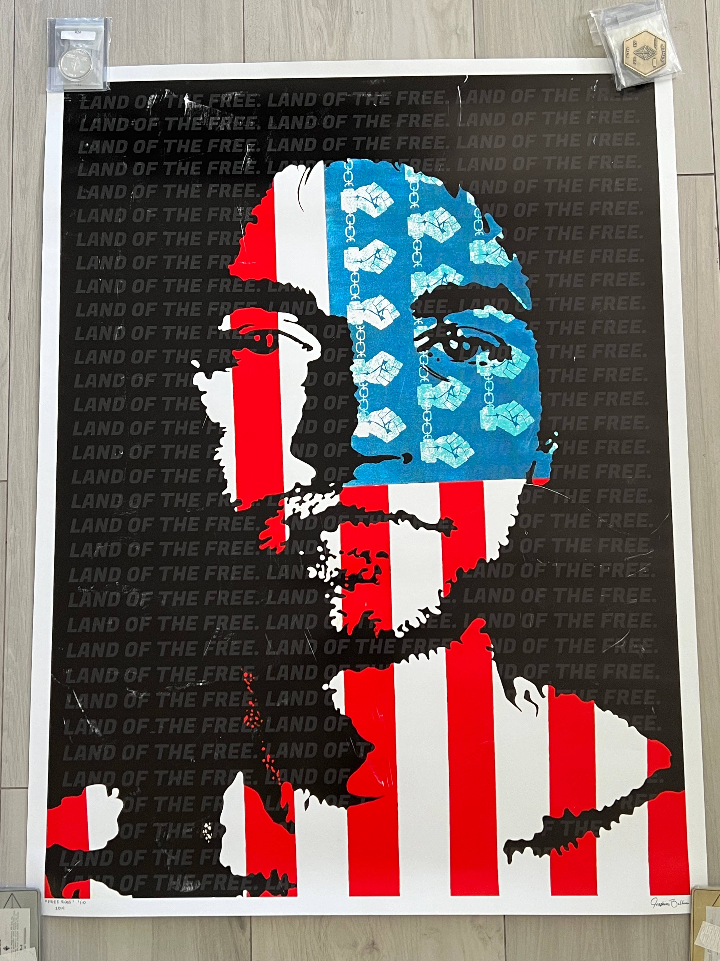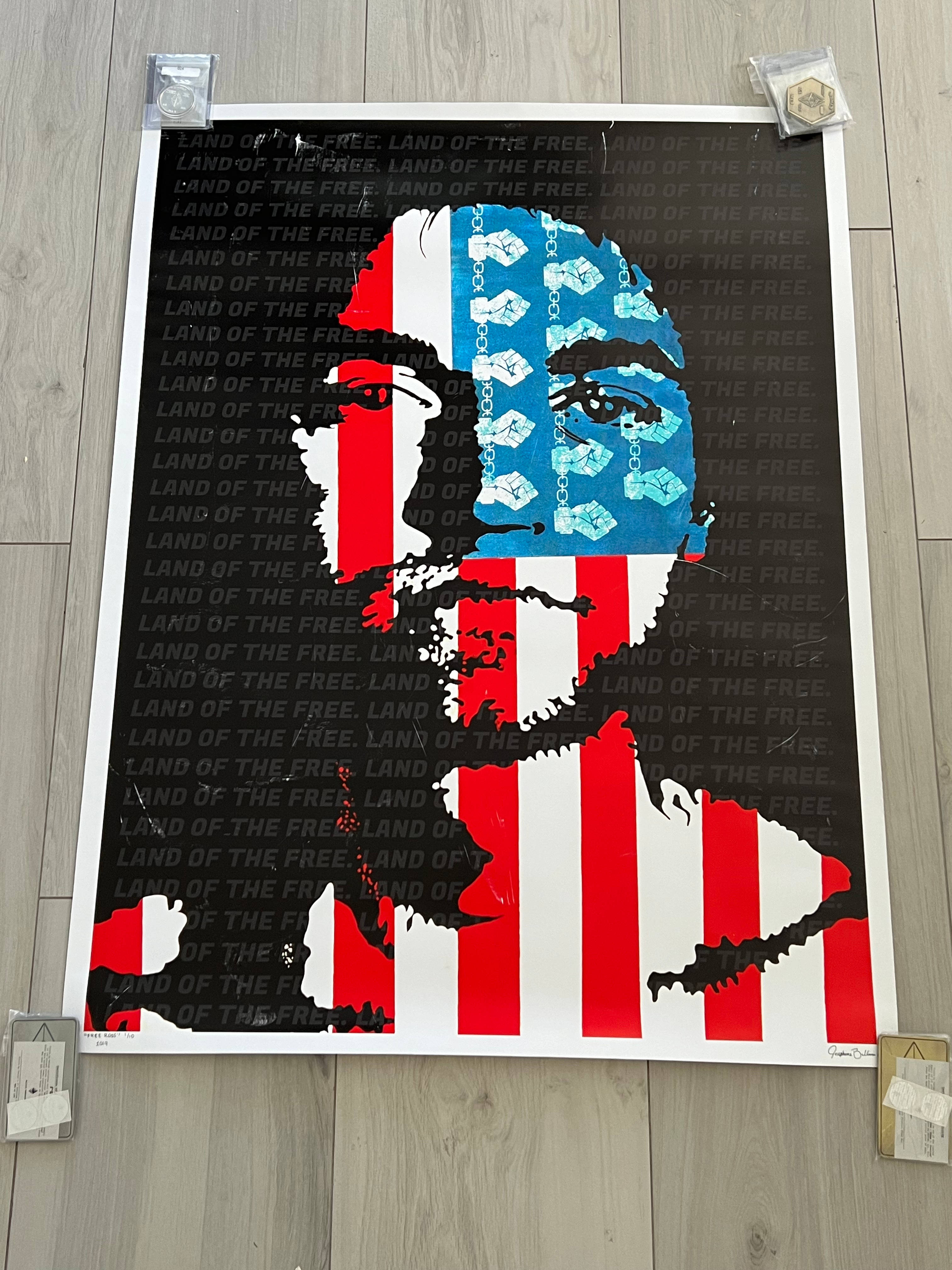 2019 Josie Bellini RARE Ross Ulbricht Free Ross Poster #1/10 and one of her rarest pieces. This was framed in glass but was damaged during shipping from Canada to the US. It if was in mint condition I would be listing it at $10,000 being its #1 and it's Ross. Given it has many scratches from the broken glass I am selling as is and will let the market decide what a rare #1/10 Damaged Josie Bellini Free Ross is worth.