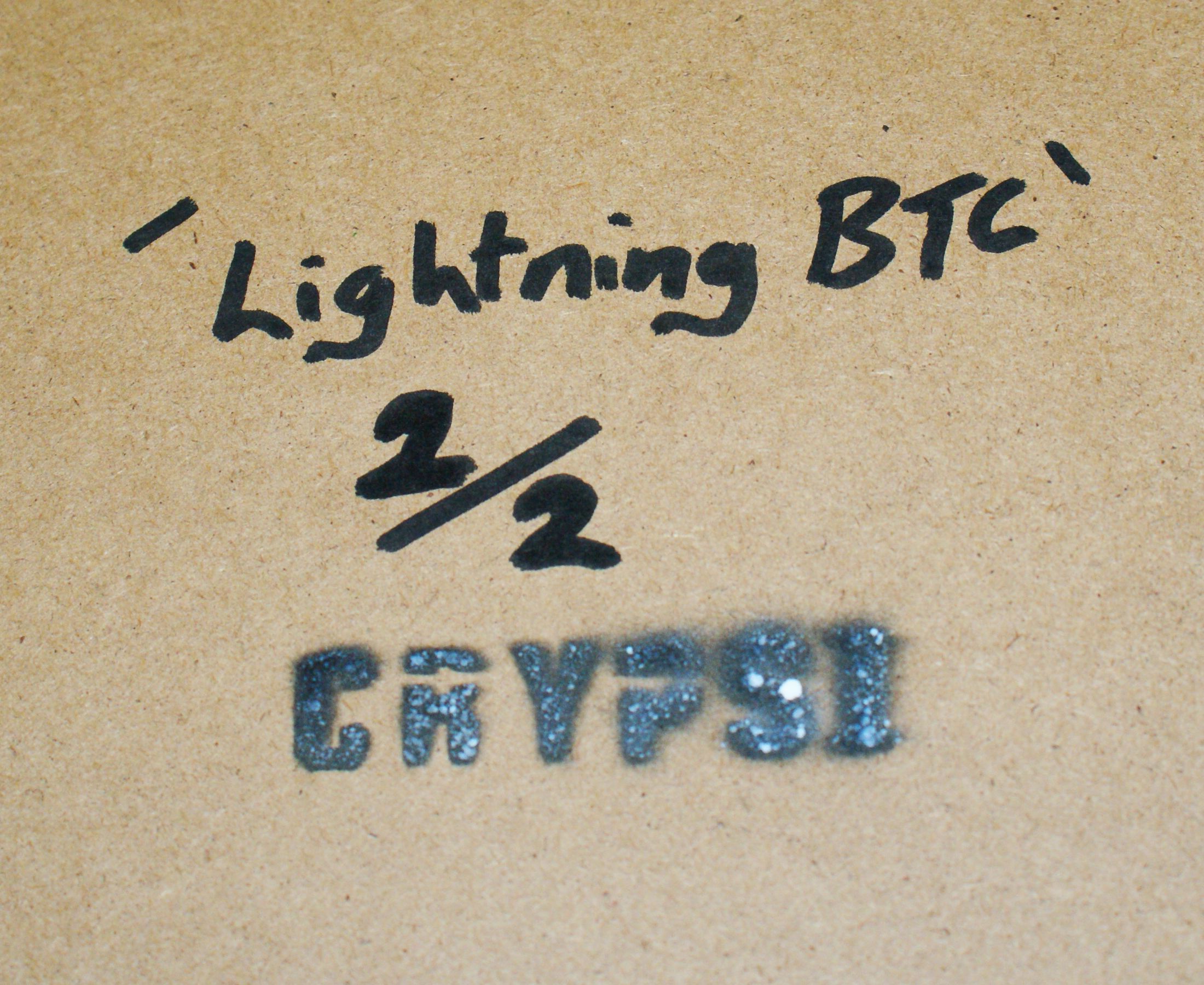 Stencil was created/ used to detail the lightning bolts, which were spraypainted with MTN Hardcore, and finished with a light spray lacquer seal. Mounted in white styroboard in a deep edge, glass front frame + Opendime. Which contains the 1 of 2 NFT pertaining to the artwork.