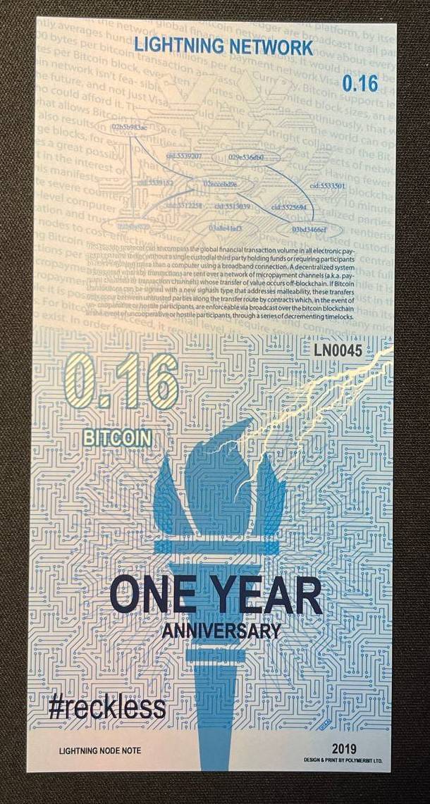 Commemorative bill celebrating 1 year of the lightning network. Design and print by Polymerbit and originally sold by LightningHood. This bill is ungraded - please see images. No creases, sharp corners a very rare bitcoin lightning collectible bill. It appears these bills are no longer for sale on their either.