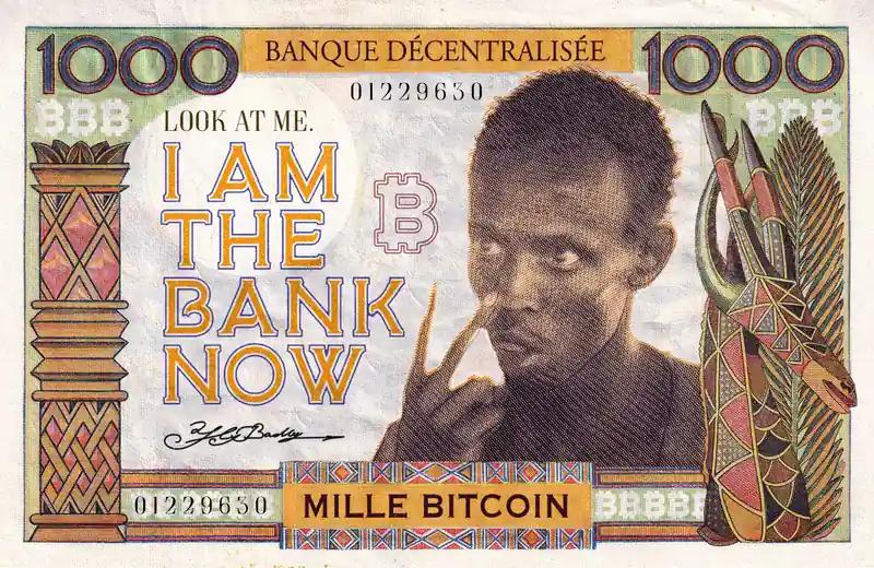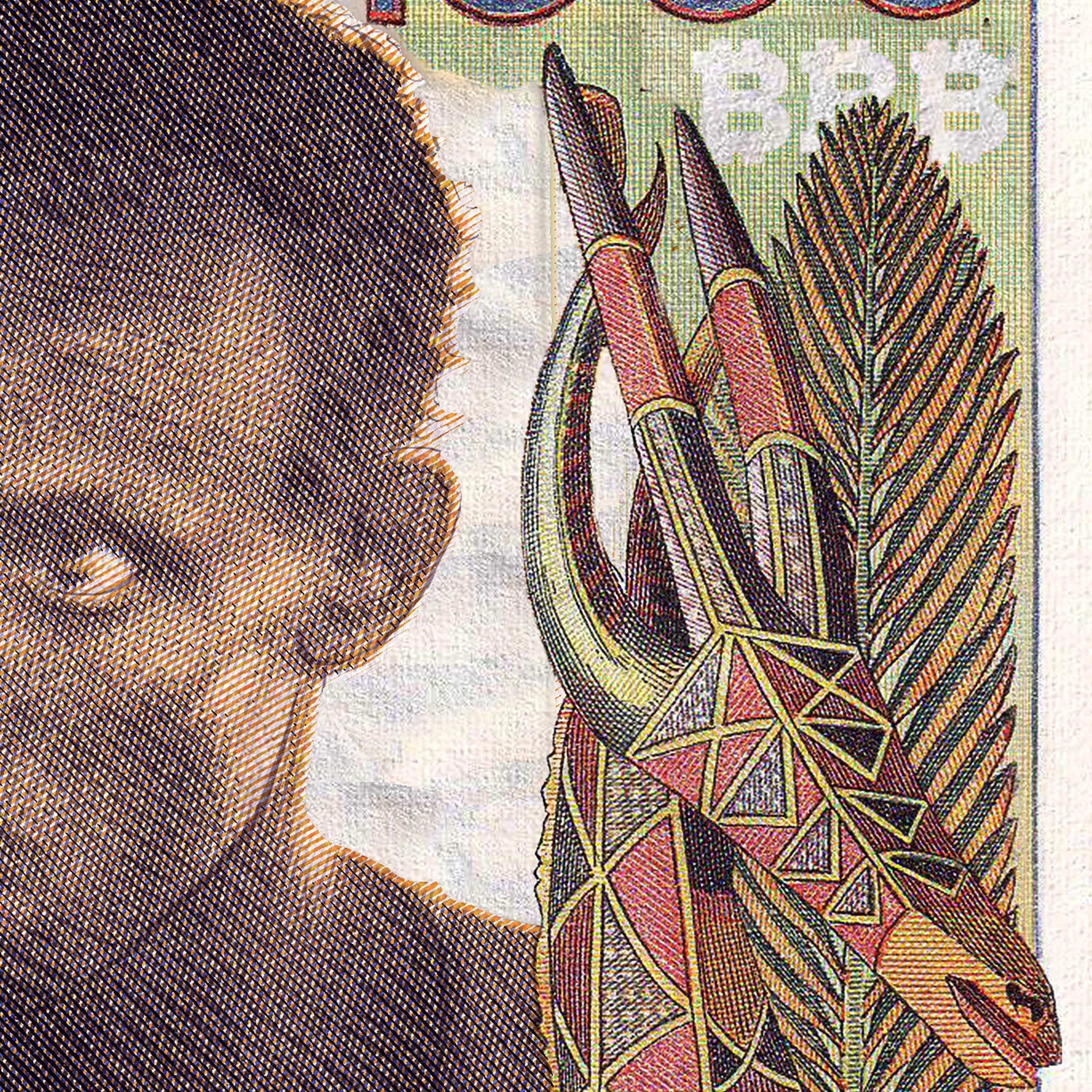 One of 11 individually serial numbered works, this artwork is a reaction to the collapse of the banking system, and the need to take control, in the form of Bitcoin. The title of work is borrowed from the film ‘Captain Phillips’, when a Somali pirate says “I am the captain now”. Bitcoin is pirate currency, which will eventually take over the financial ship. These ideas are presented in the form of a fictional banknote, designed in the style of French colonial banknotes.