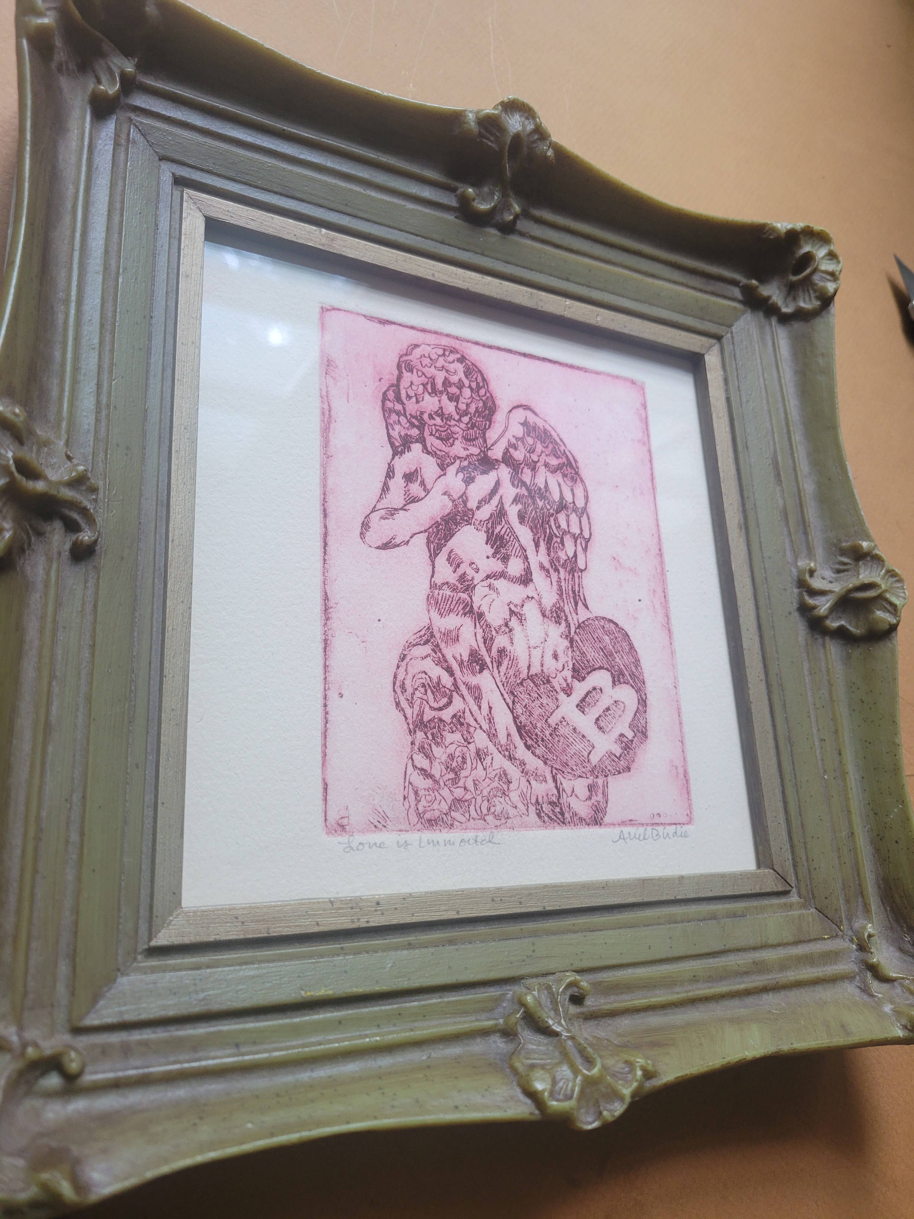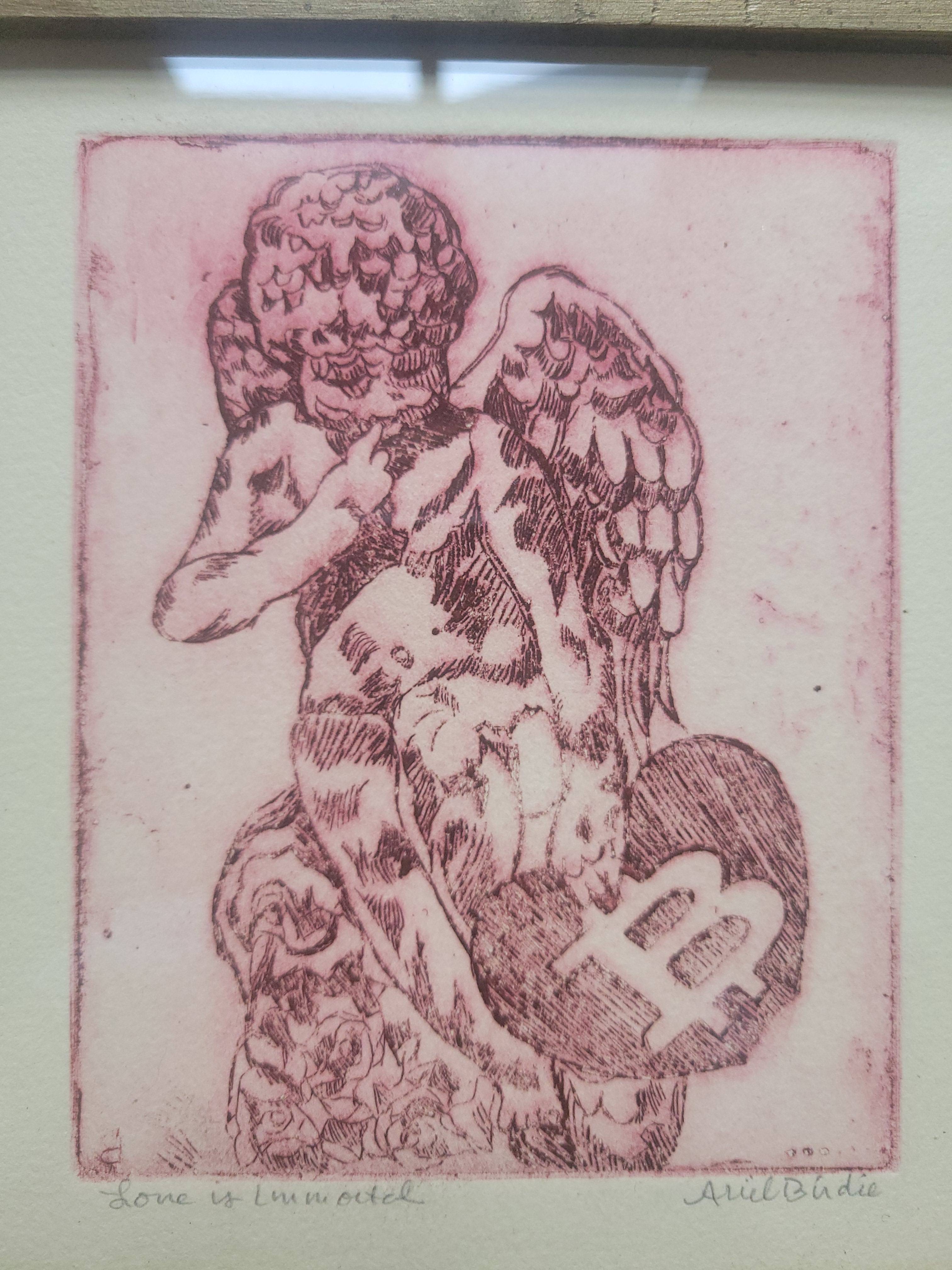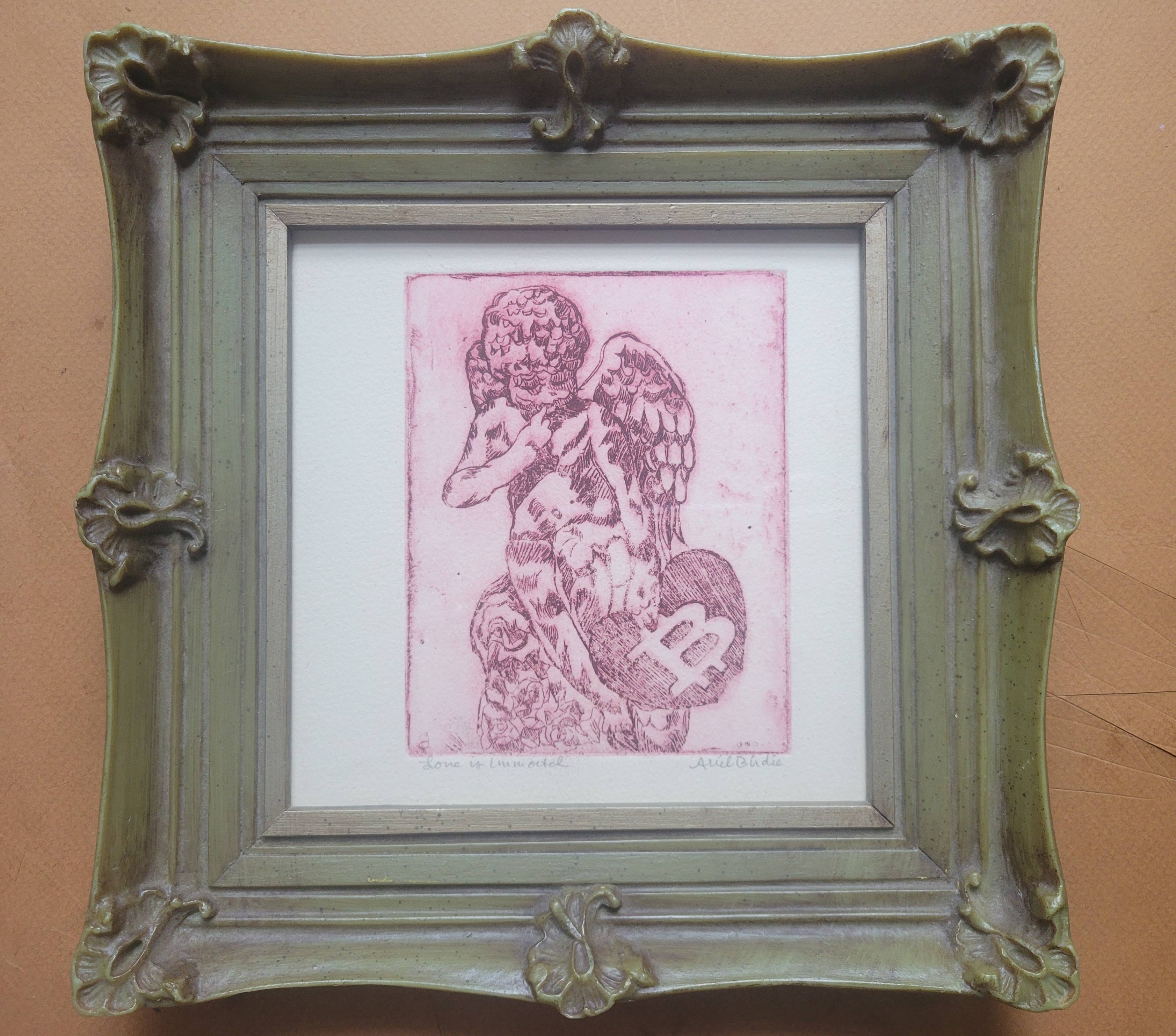 'Love is Immortal' by Ariel Birdie is a one of a Kind Copperplate etching, depicting a classic Angel holding their Bitcoin Heart.