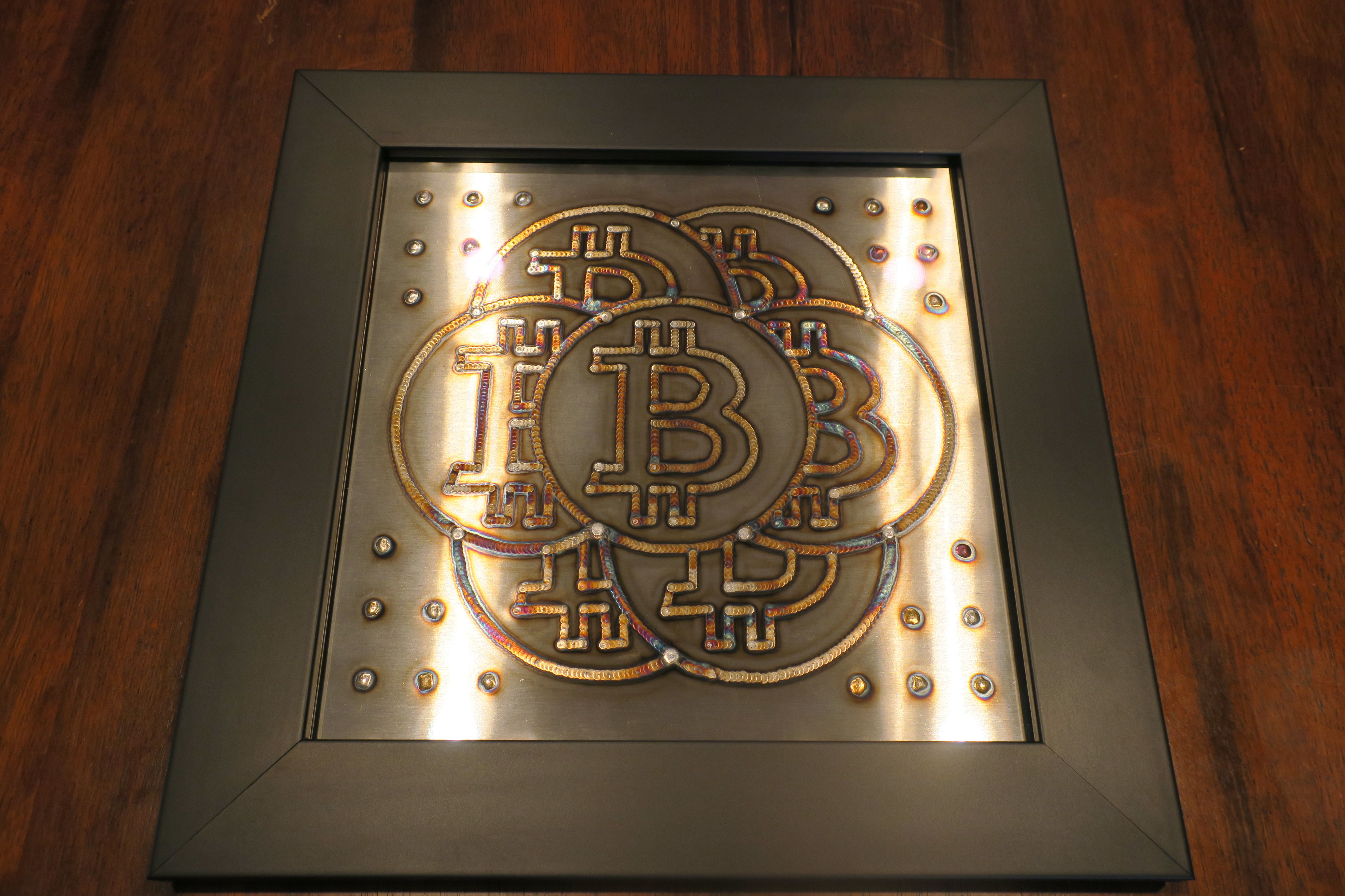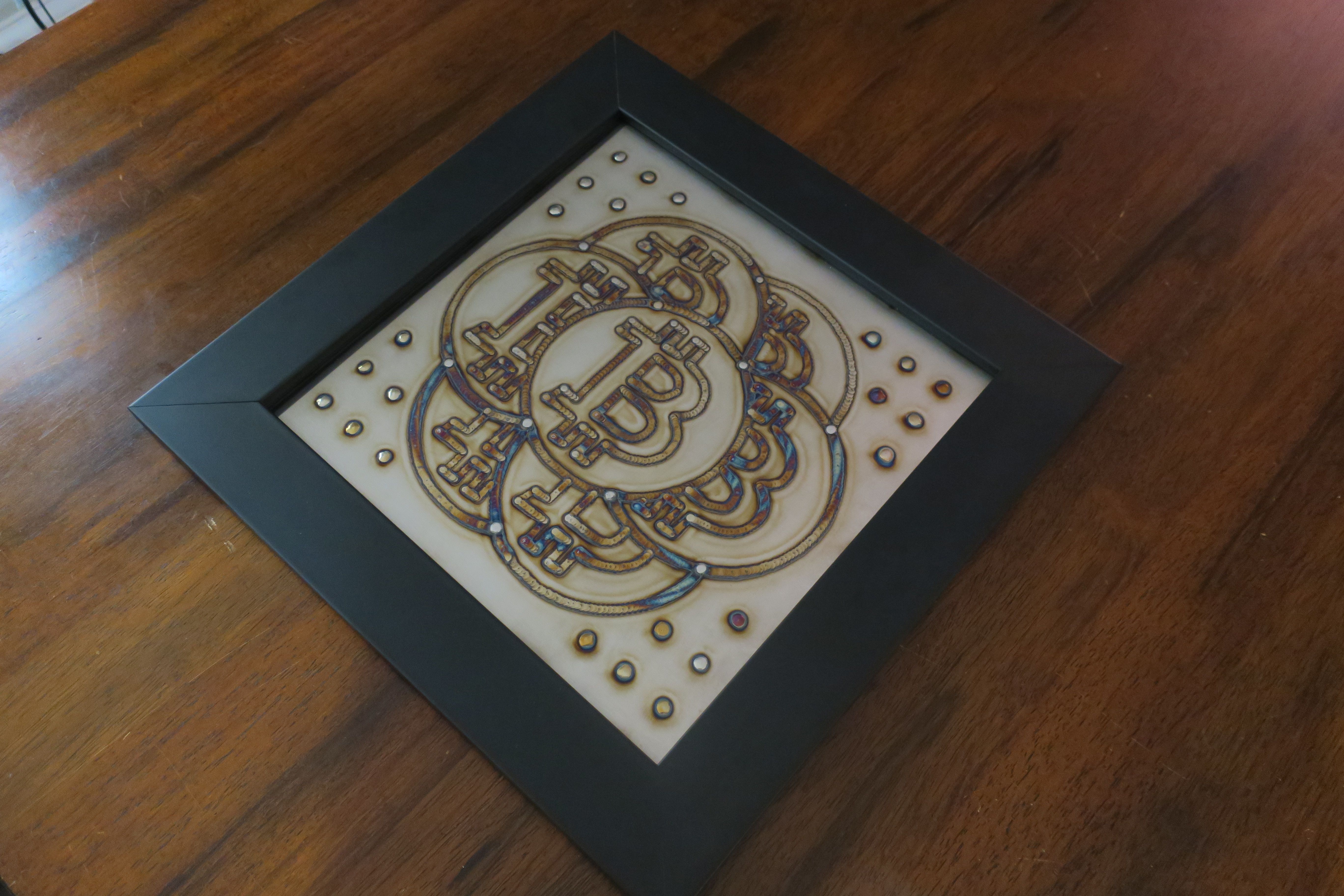 This wall hanging piece was created by a welding process called TIG welding (Tungsten Inert Gas). A small hand held TIG torch in one hand a piece of stainless steel filler rod in the other. With the heat and the Argon gas being manipulated by a foot controller, you wind up with a wide range of colors from the stainless steel. I had this piece professionally framed with a low reflective glass. Depending how the light hits this piece the colors show up more prominent. This piece was made in October of 2021 at block# 707639 and framed in early 2022.