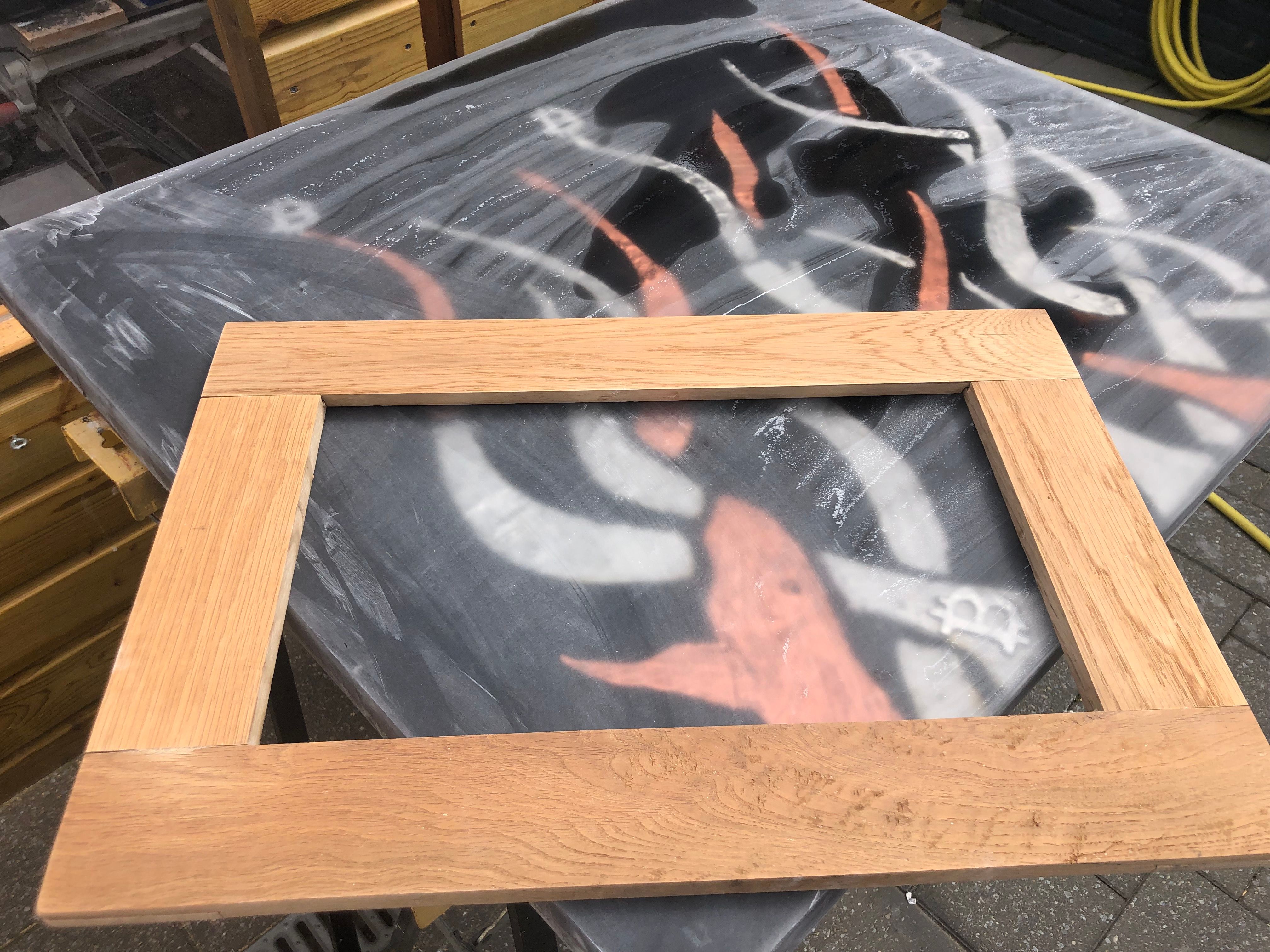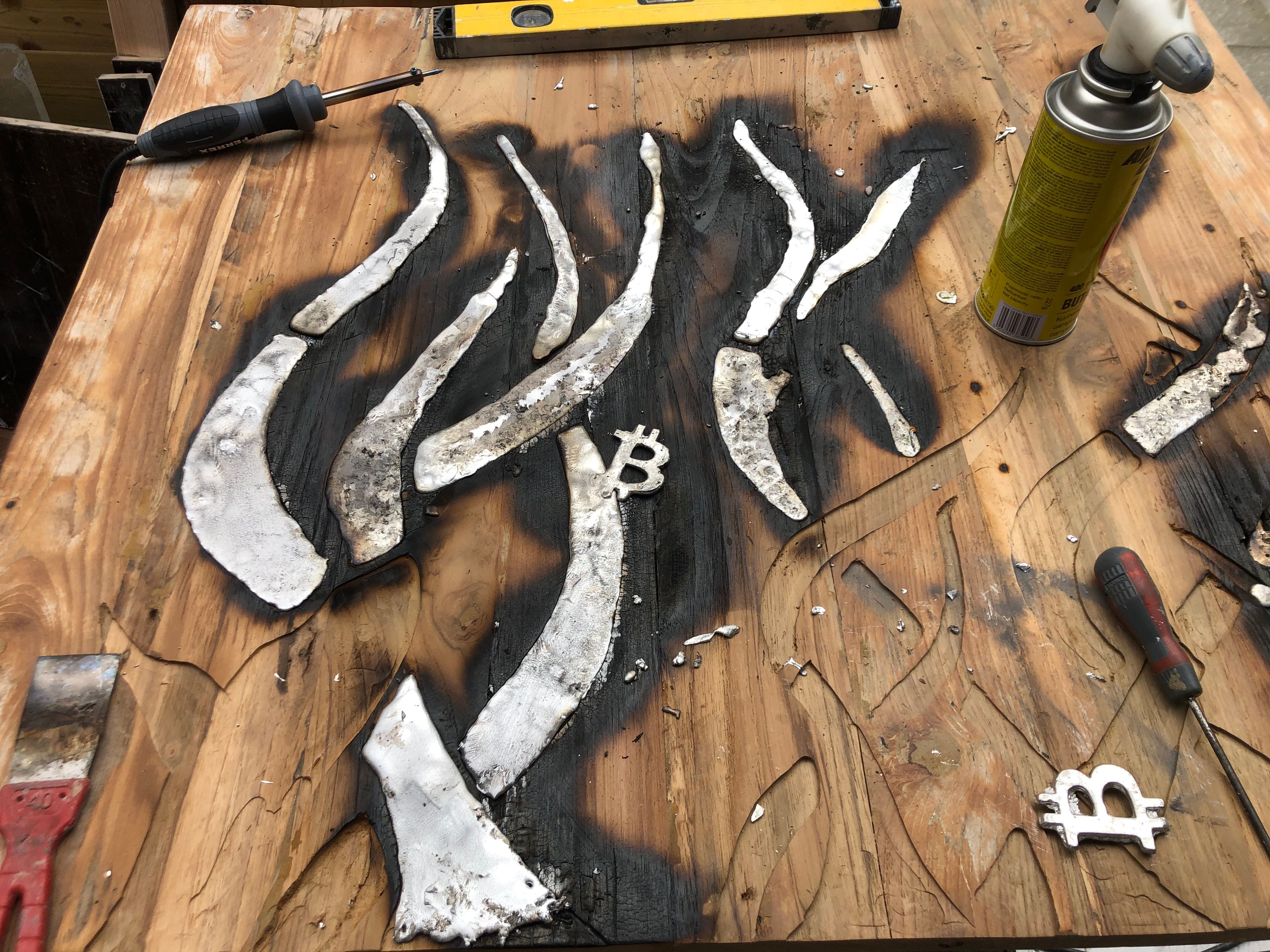 Made of teak wood, melted tin, epoxy resin and steel bars along the edges.