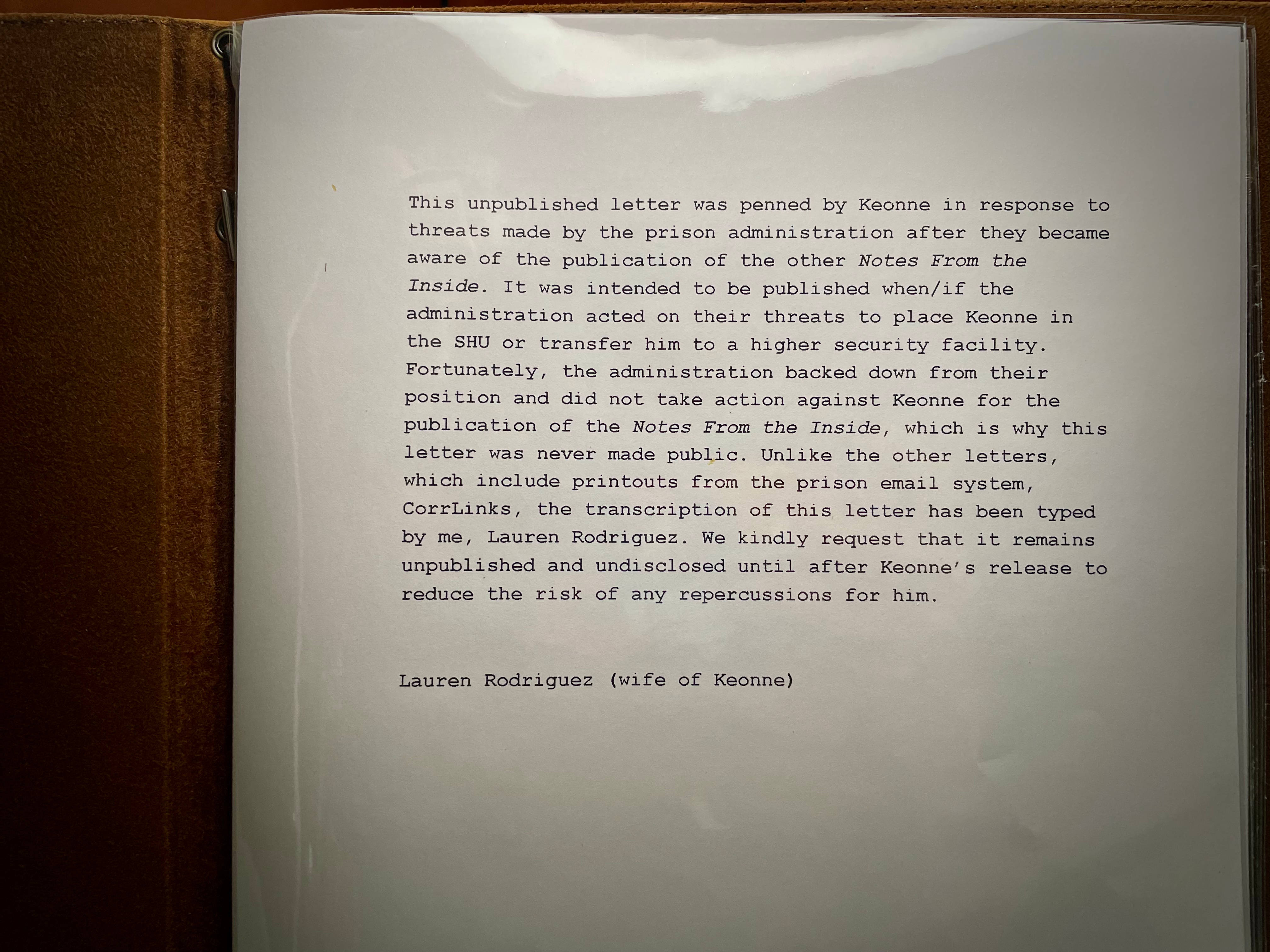 This is the unpublished 6th volume of Notes From the Inside collection that Keonne had written while in federal prison. This letter was written in response to threats made by the prison administration, and was intended for publication when/if they acted on those threats. Thankfully, the administration backed down. We kindly request that the winner of this letter refrain from sharing its contents publicly until Keonne is no longer in the custody of the Bureau of Prisons.