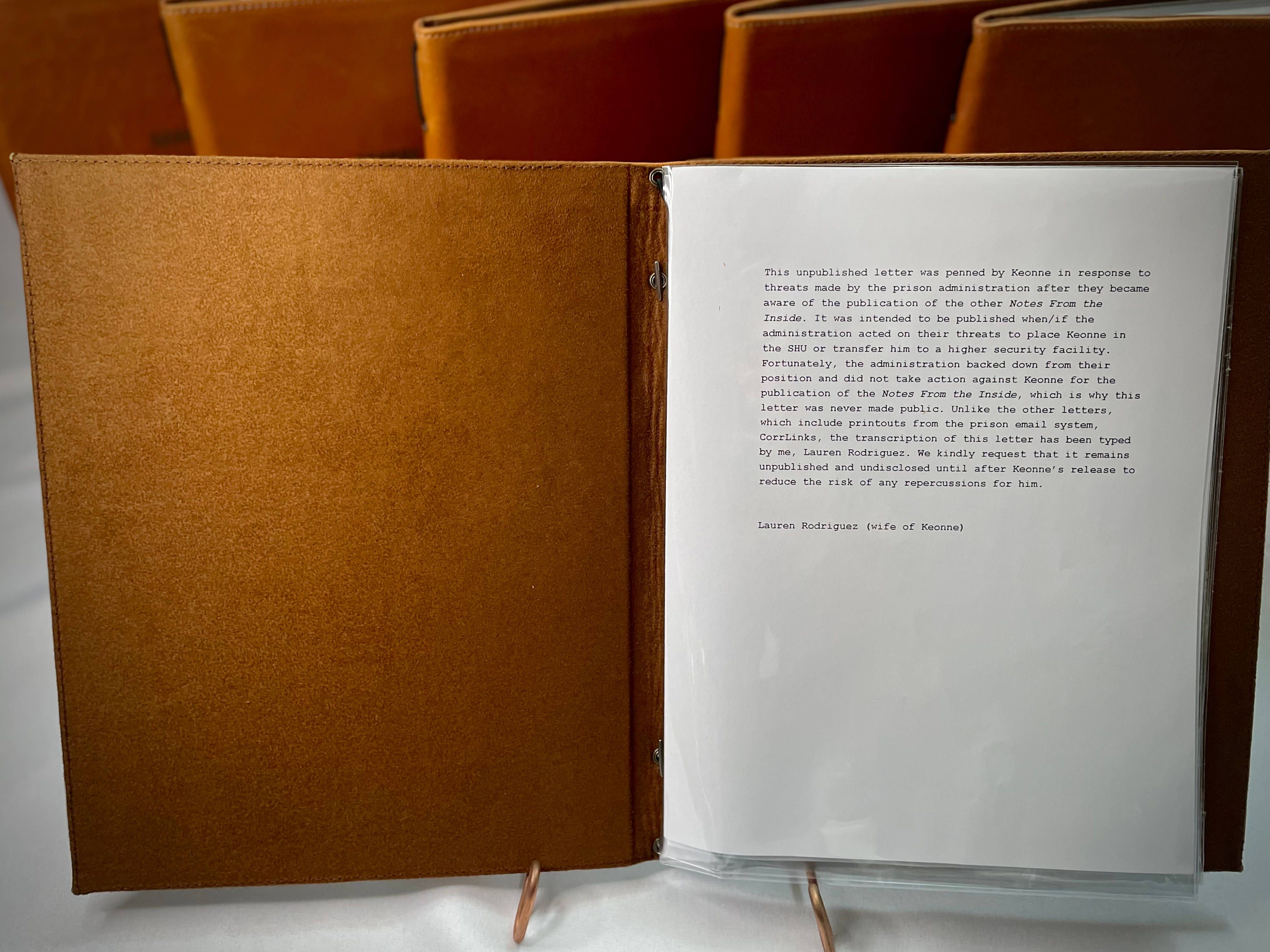 Unlike like five previous volumes, this letter was never sent through the CorrLinks system. This leather-bound unpublished edition contains a page explaining the reason it was unpublished, a transcription of the letter typed by Keonne's wife, and the handwritten draft.