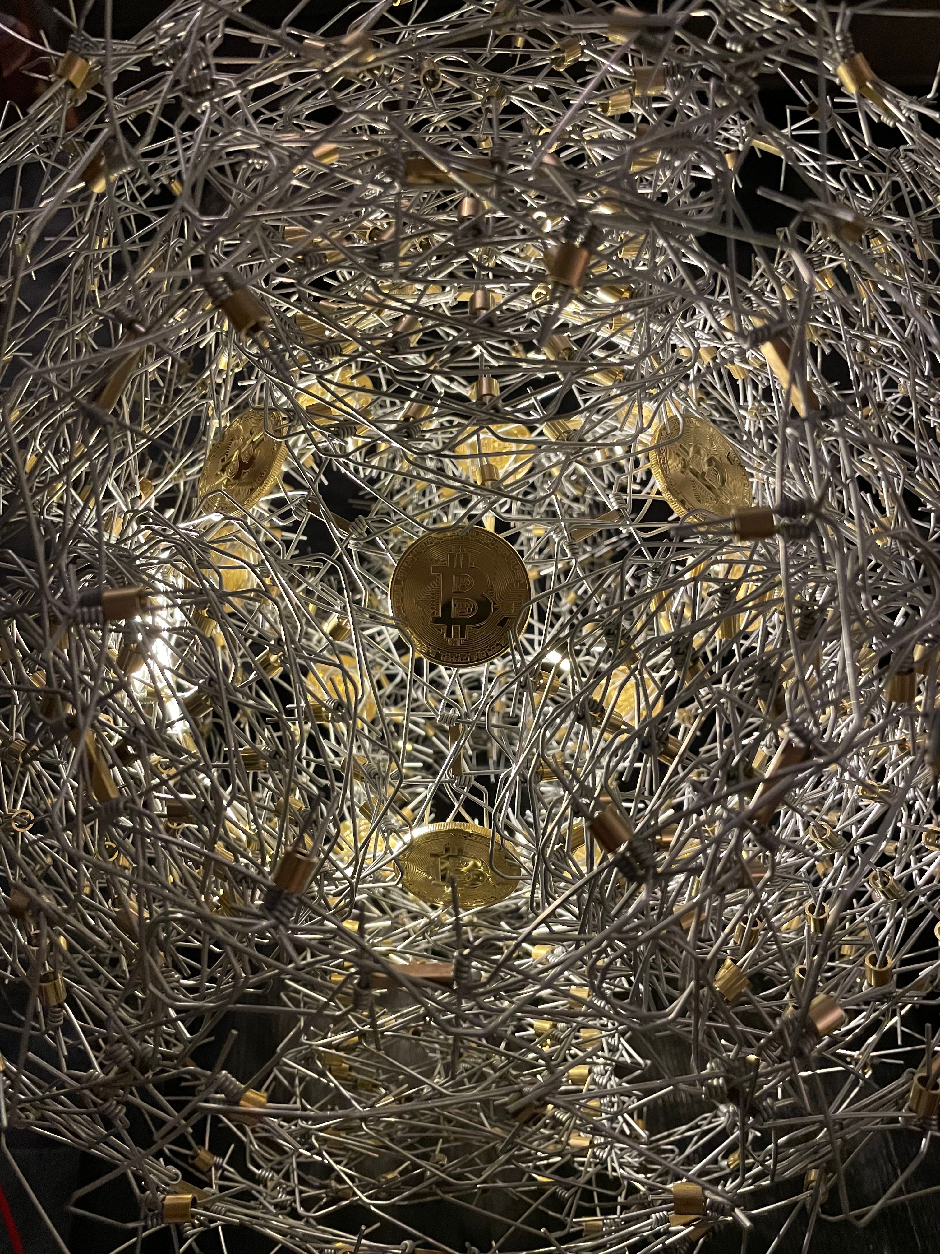 21 Bitcoin coins adorn this geometric wire sculpture representing one millionth of the total theoretical supply. A single light illuminates this piece from the inside-out