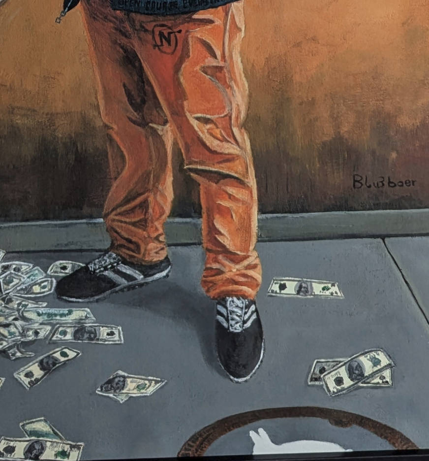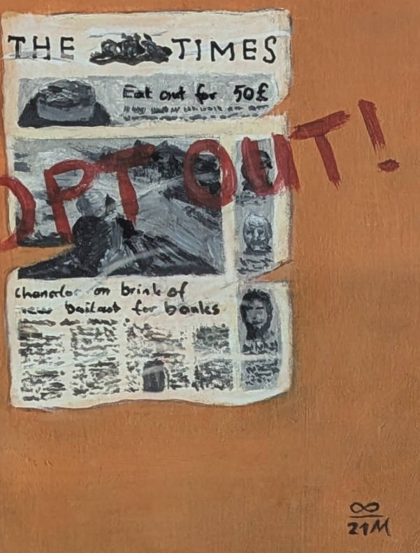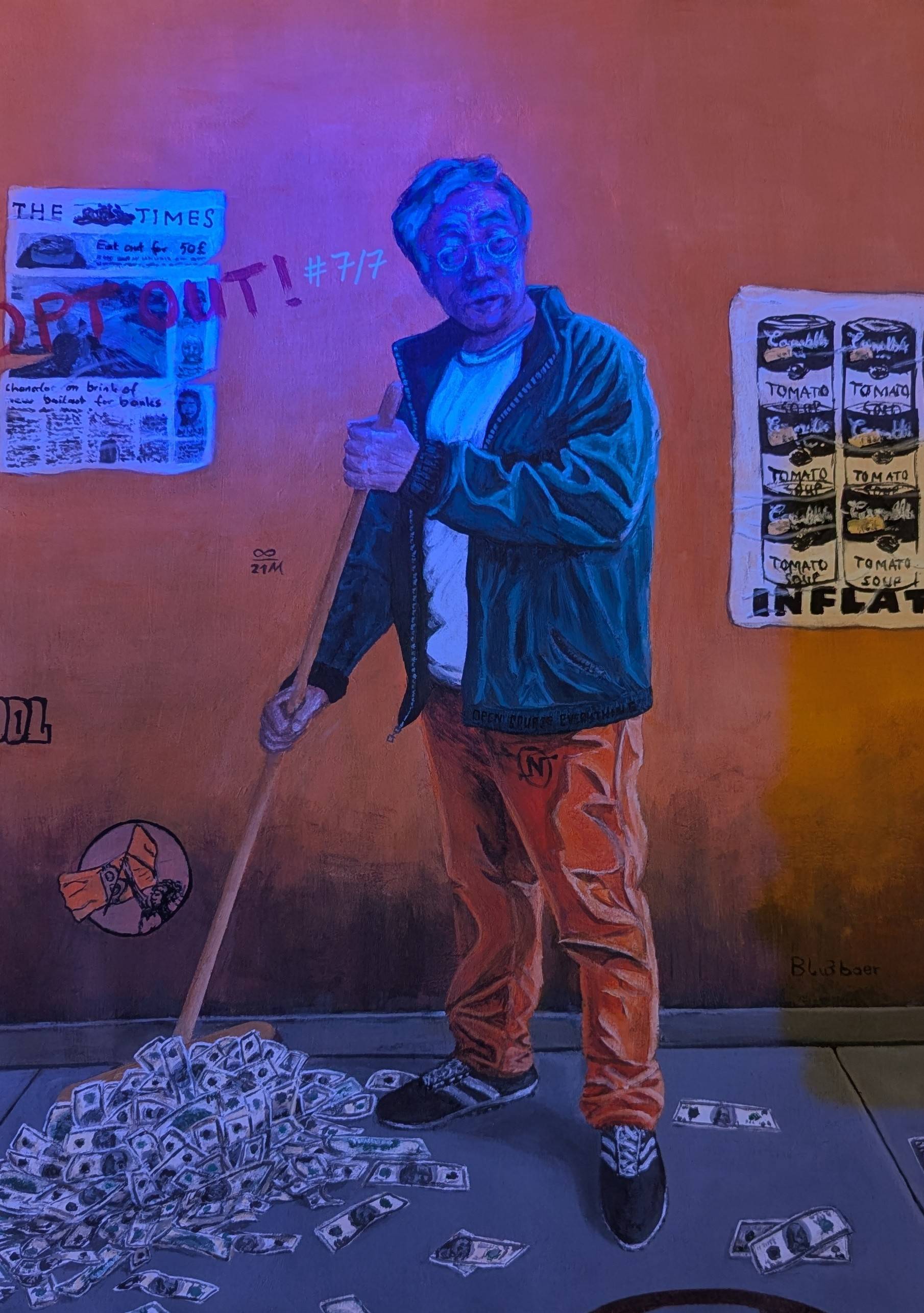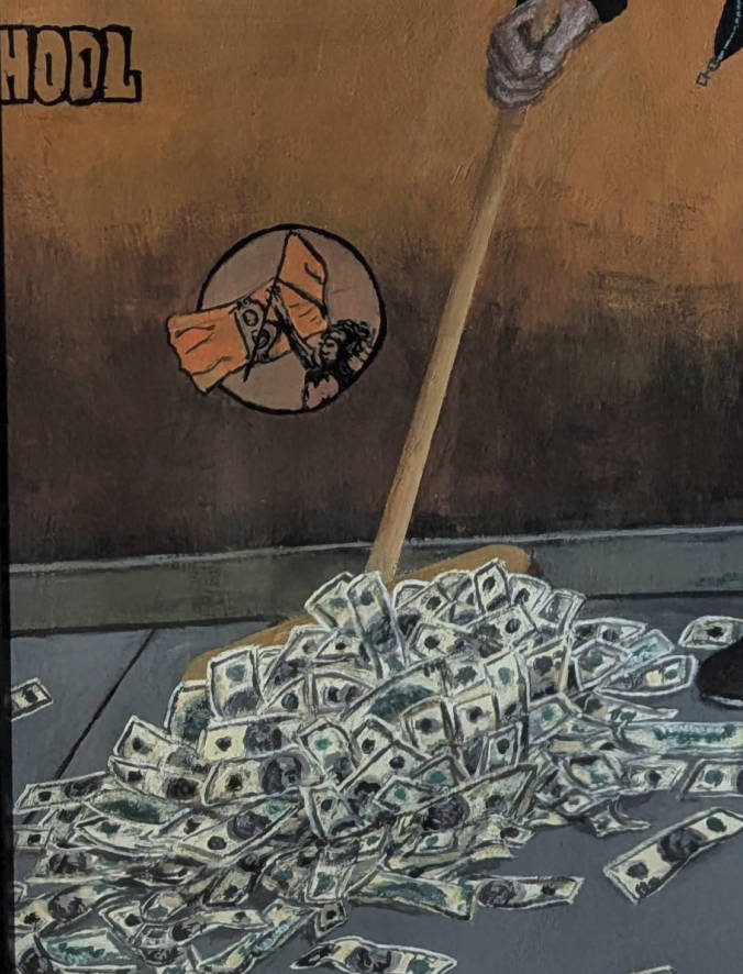 Opt Out by Blu3baer visualizes the collapse of fiat money and the rise of Bitcoin. At the center, Satoshi, portrayed through Dorian Nakamoto, sweeps away worthless U.S. dollars as the old financial system crumbles. Bold references and hidden messages from Bitcoin culture are woven throughout the scene, rewarding those who take a closer look. This artwork captures the quiet monetary revolution, sparked by the simple decision to opt out.