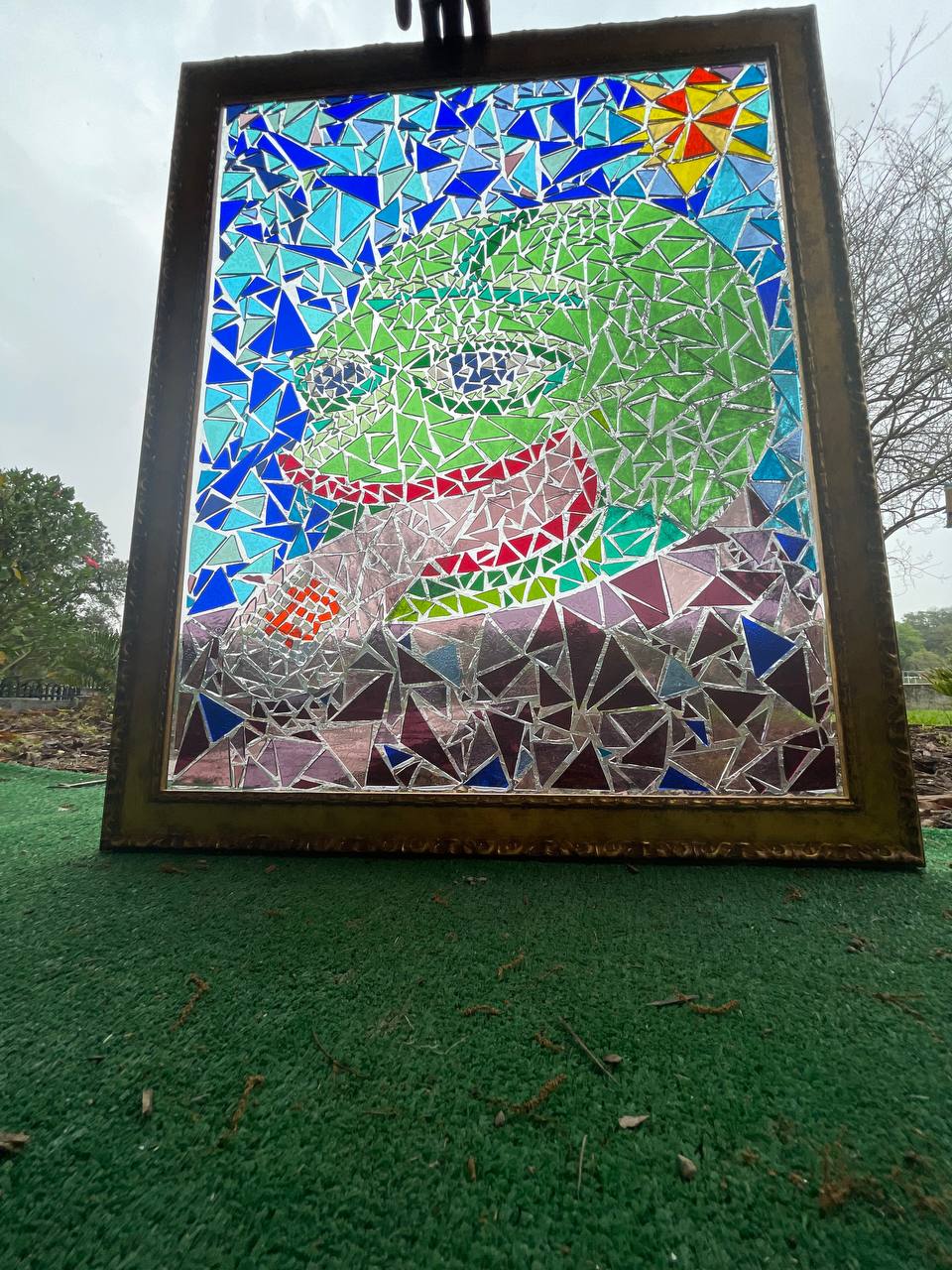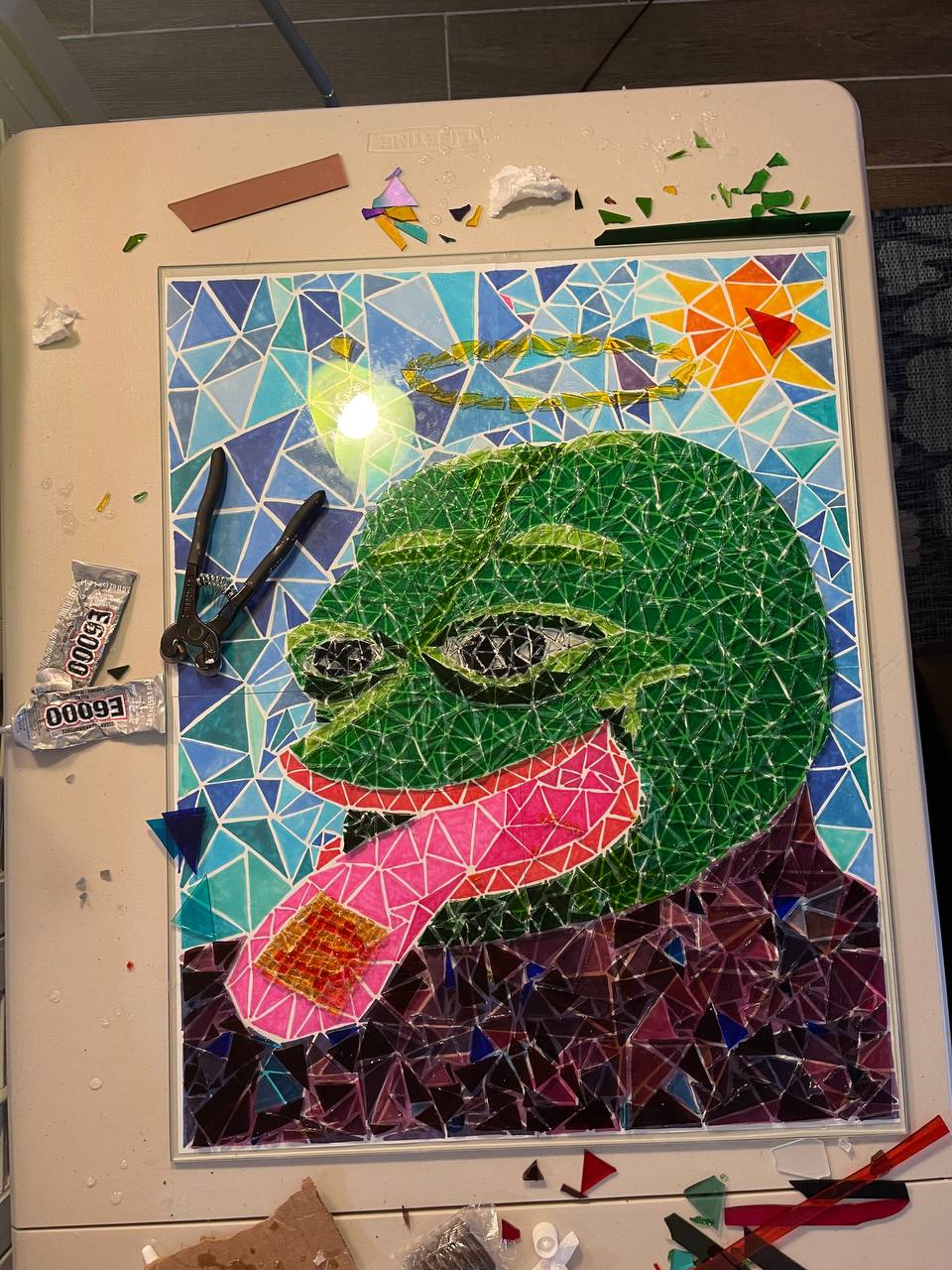 The glass work featured here is part of the Mind Altering Money series he started back in 2020 with some of his drawings. They generally feature colorful, psychedelic cartoons made using marker and pen, and expand the idea that Bitcoin is a mind altering form of money, for anyone. The glasswork is made using tempered glass and broken triangles of stained glass, made into a mosaic of a Rare Pepe dropping an LSD tab of bitcoin. There are three editions and they each come with a Bitcoin backed XCP token that can be seen as a COA and proof of ownership. The one featured in this auction is the Orange Sunshine Piece to celebrate the the famous Orange Sunshine LSD. This is the genesis glass piece in the 3 piece set and Orange Sunshine may or mayn’t have been Scrilla’s intro into mind expansion as a teen (he pleads the fifth.) The piece took 40+ hours to craft and uses clear bonding glue to make sure the pieces last a few lifetimes at least. The artwork is framed in a fashionable and glassy gold frame and can be enjoyed from the front and back, and features high brackets to hang the piece easily in front of your favorite window.
