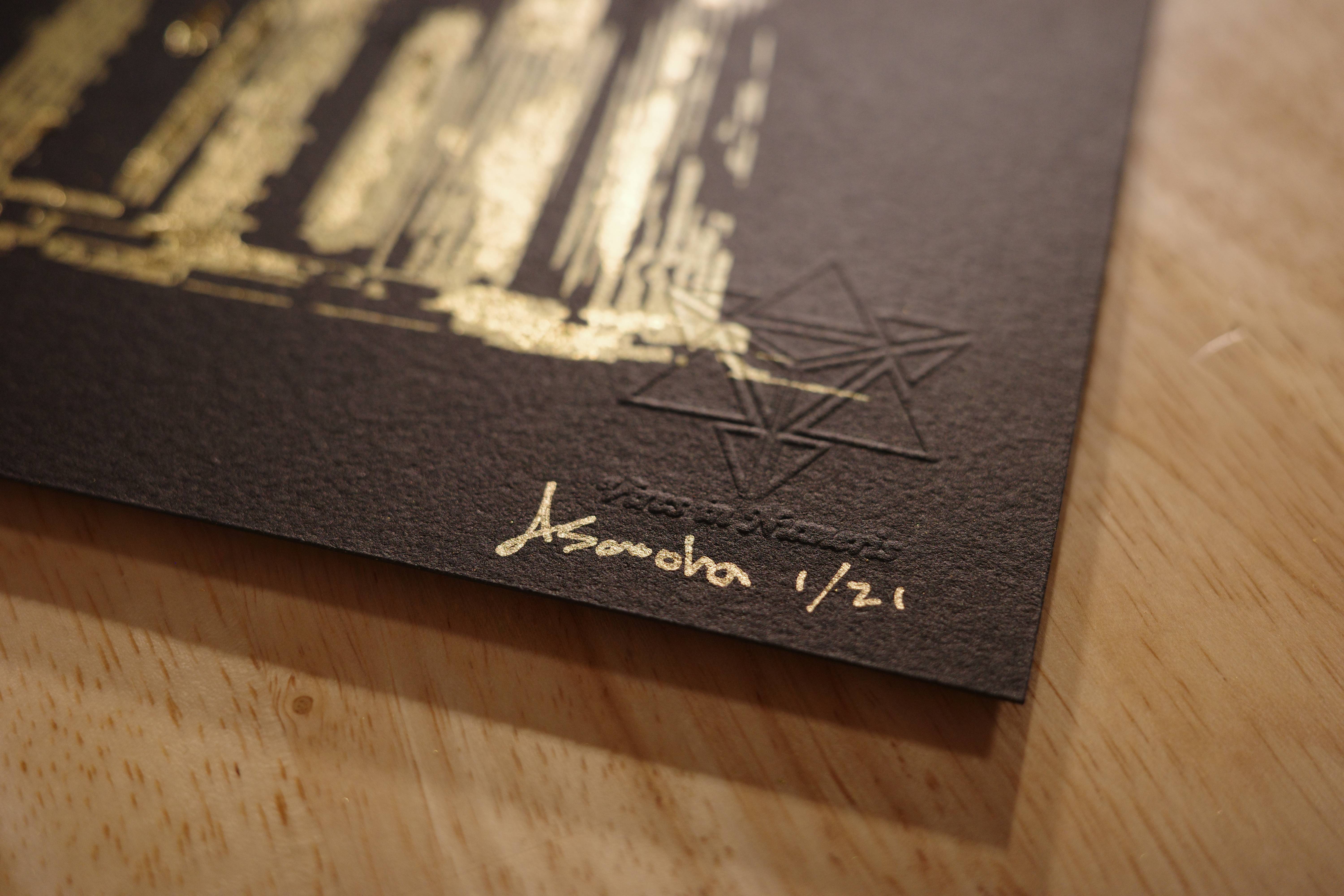 Hand embellishment by Asanoha with genuine 24k gold leaf from Giusto Manetti Battiloro of Florence, Italy, makes this 1 of 21 archival serigraph print truly special. The Manetti goldbeater family makes the finest gold leaf in the world, with a history spanning over 400 years.