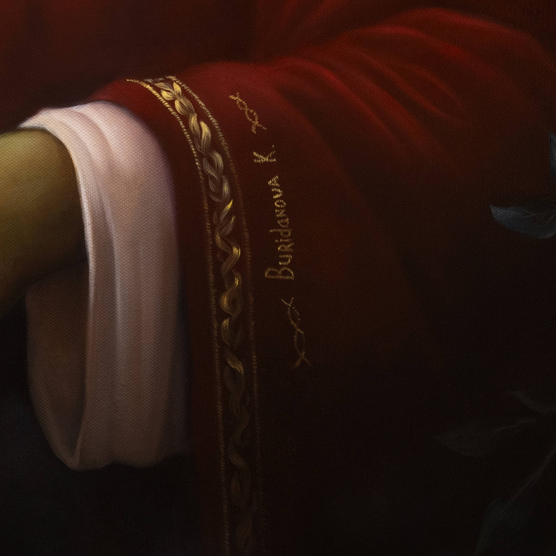 The artist's signature is placed on the embroidery on the front of the painting and is also signed on the back