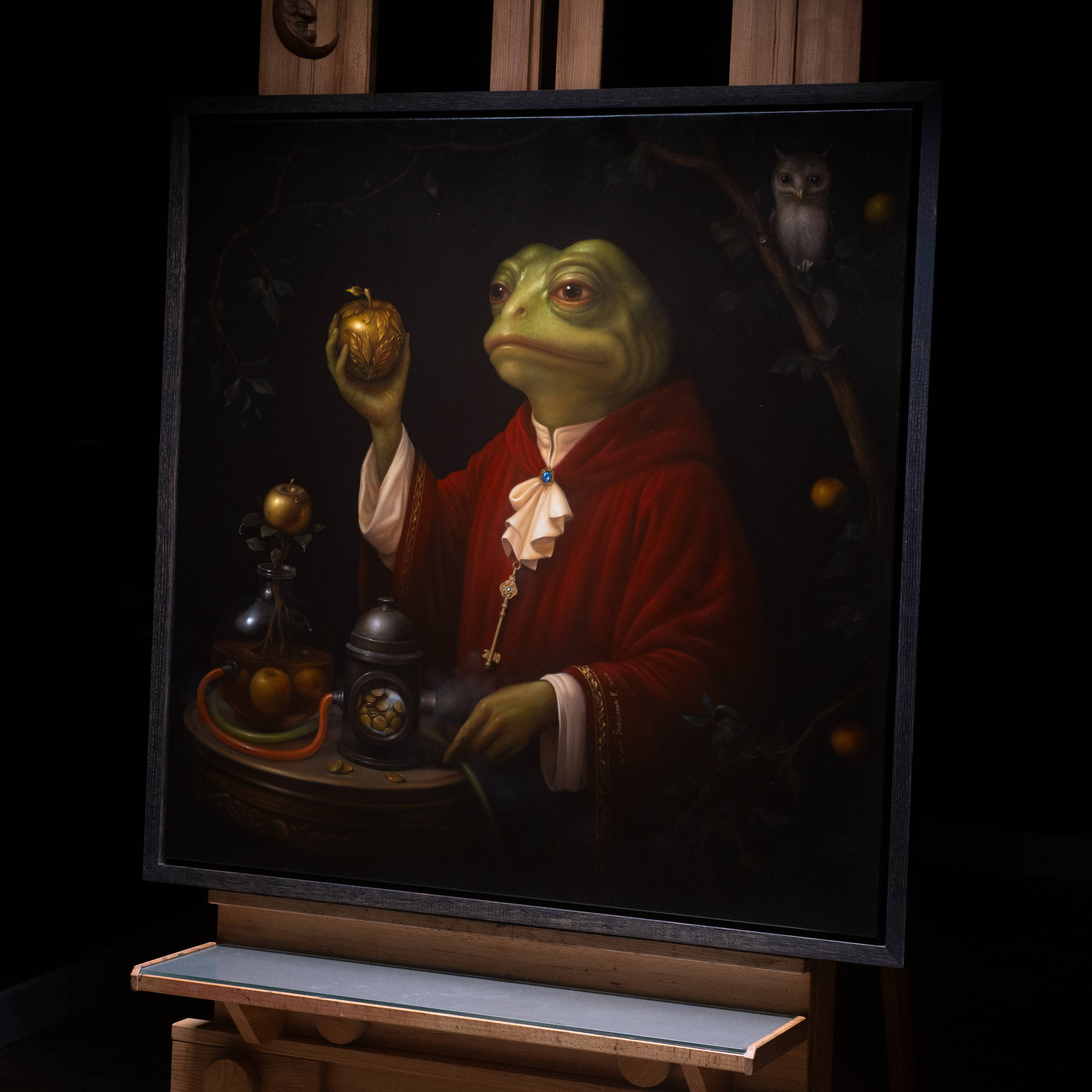 The piece was created with oil paints on a gallery-wrapped canvas, framed in wood and ready for hanging