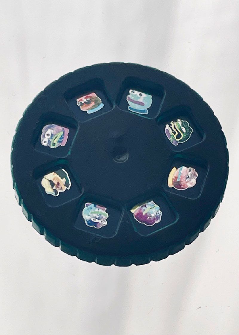 A hacked Moulin Roti nighttime story torch with telegram stickers from the Galaxy Pepe sticker pack by @BB_SAMYLO. The piece runs with two cell batteries. By twisting the optical lens, the image can be adjusted sharp on various distances. This hacked initial edition is capped at a maximum of 5pcs. Editions 1, 2, and 3 have been sold. Depending on if all hacks work well, the issuance can be lower. Images are developed on an Ilford microfilm which is comparably heat resistant and color stable for 500years.