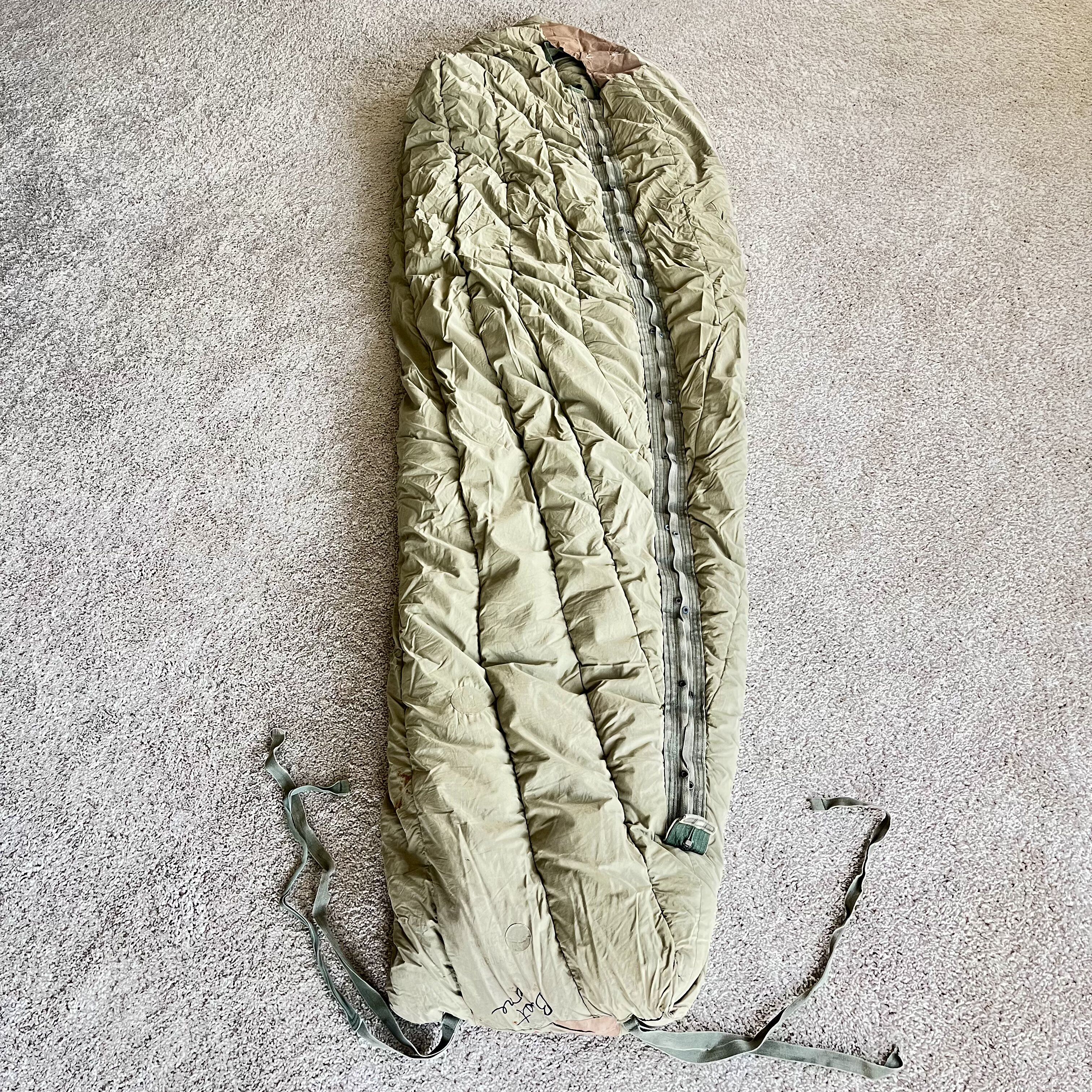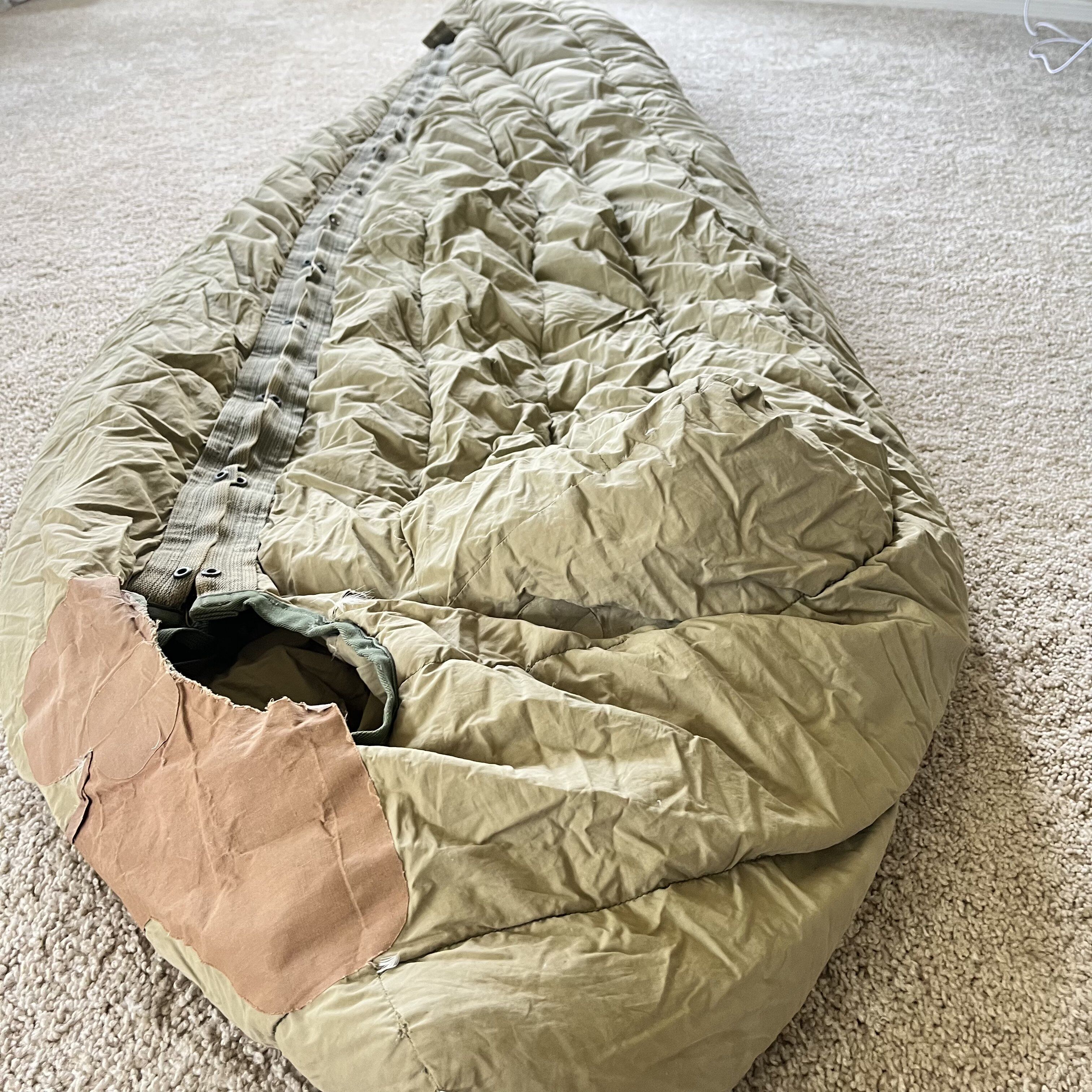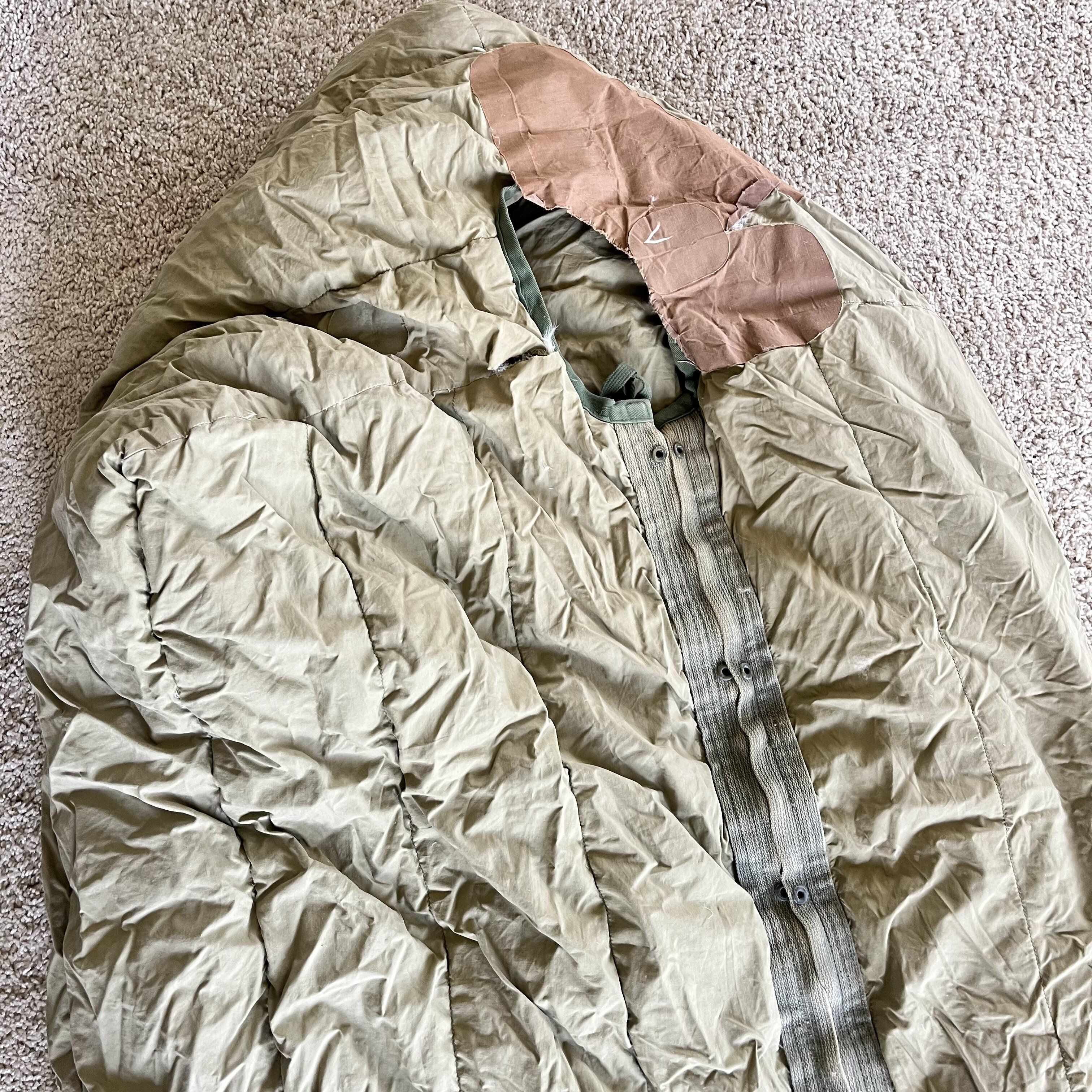 Over time, the sleeping bag was patched in several areas. Today, additional patches are needed as some down is leaking. Stains and typical wear-and-tear are also visible in the pictures.