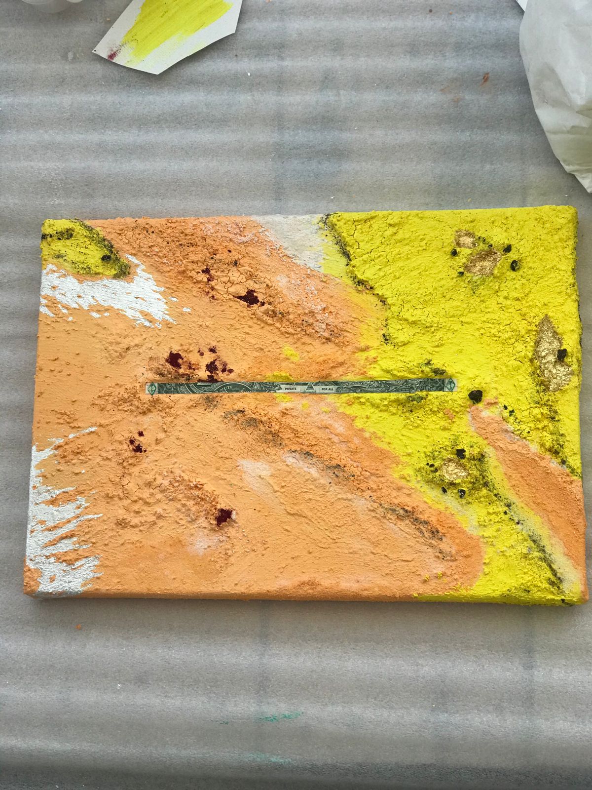 Acrylic, minerals and crystallines, genuine Silver leaf, 23ct Gold leaf, and dirty fiat shitcoins (shredded USDs) on canvas