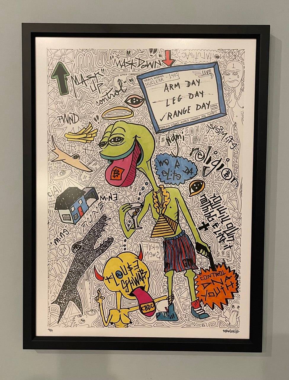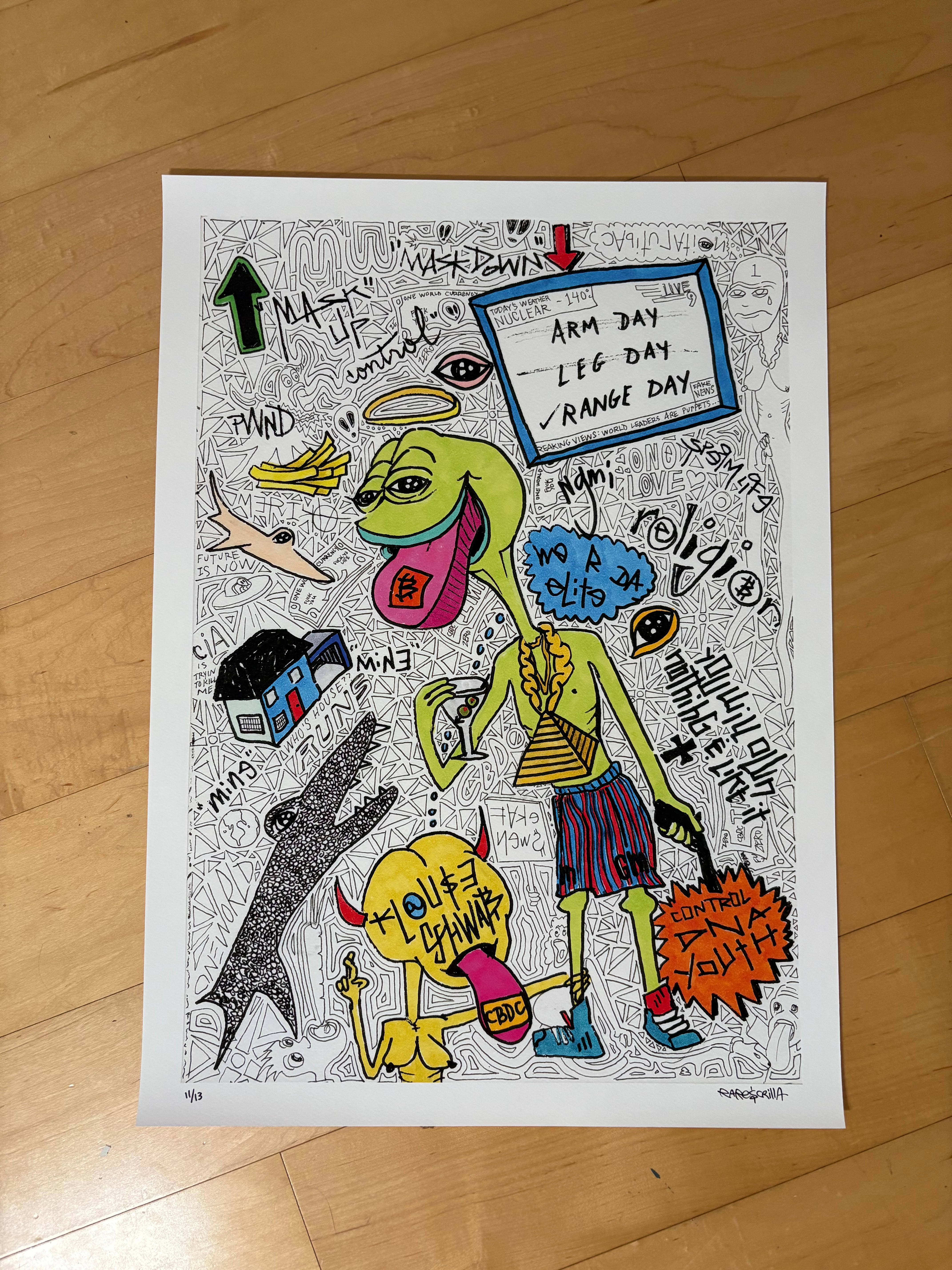 A rare limited print. Started this drawing, on a plane home from a Vegas trip after noticing a man standing at the airport with a shirt that said ARM DAY, LEG DAY, RANGE DAY on the back, like in the drawing. I finished it up when I got home. This is a fine art print of the drawing. Only 13 editions exist. This is #11.