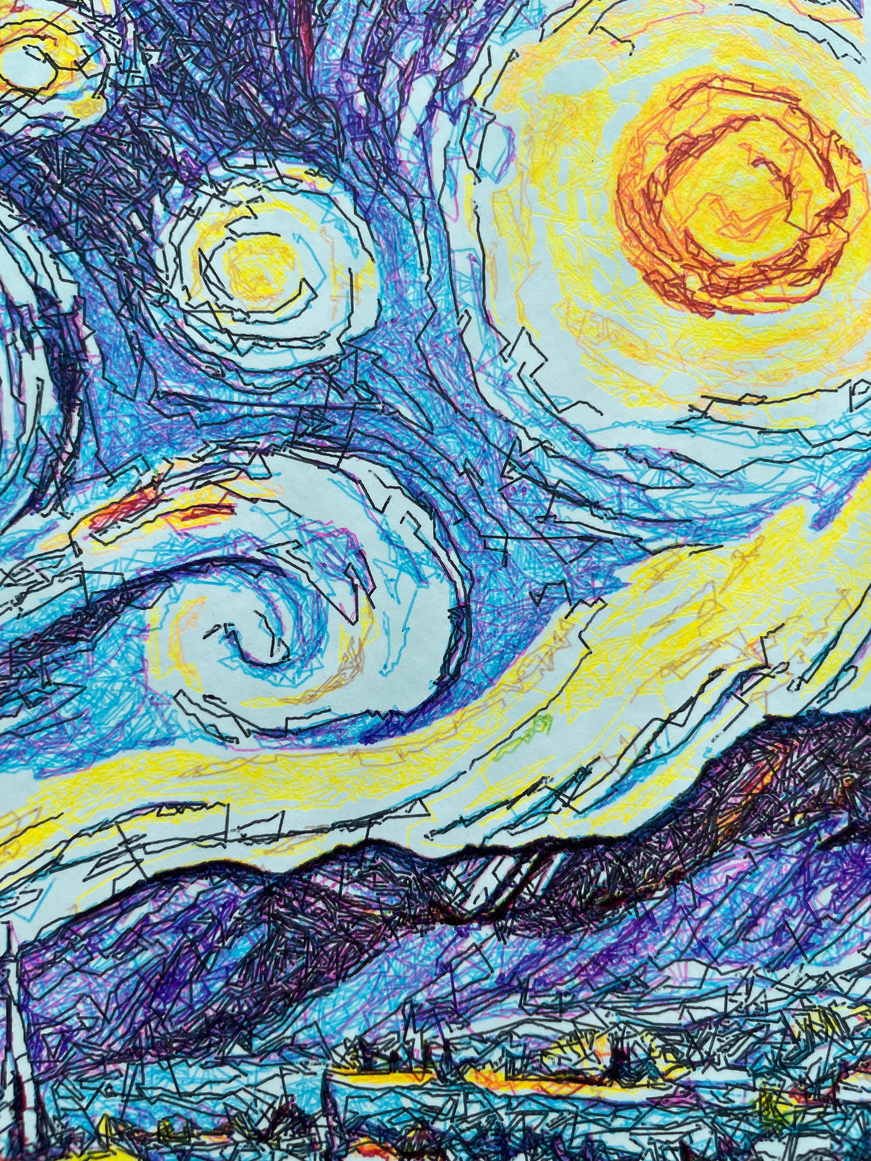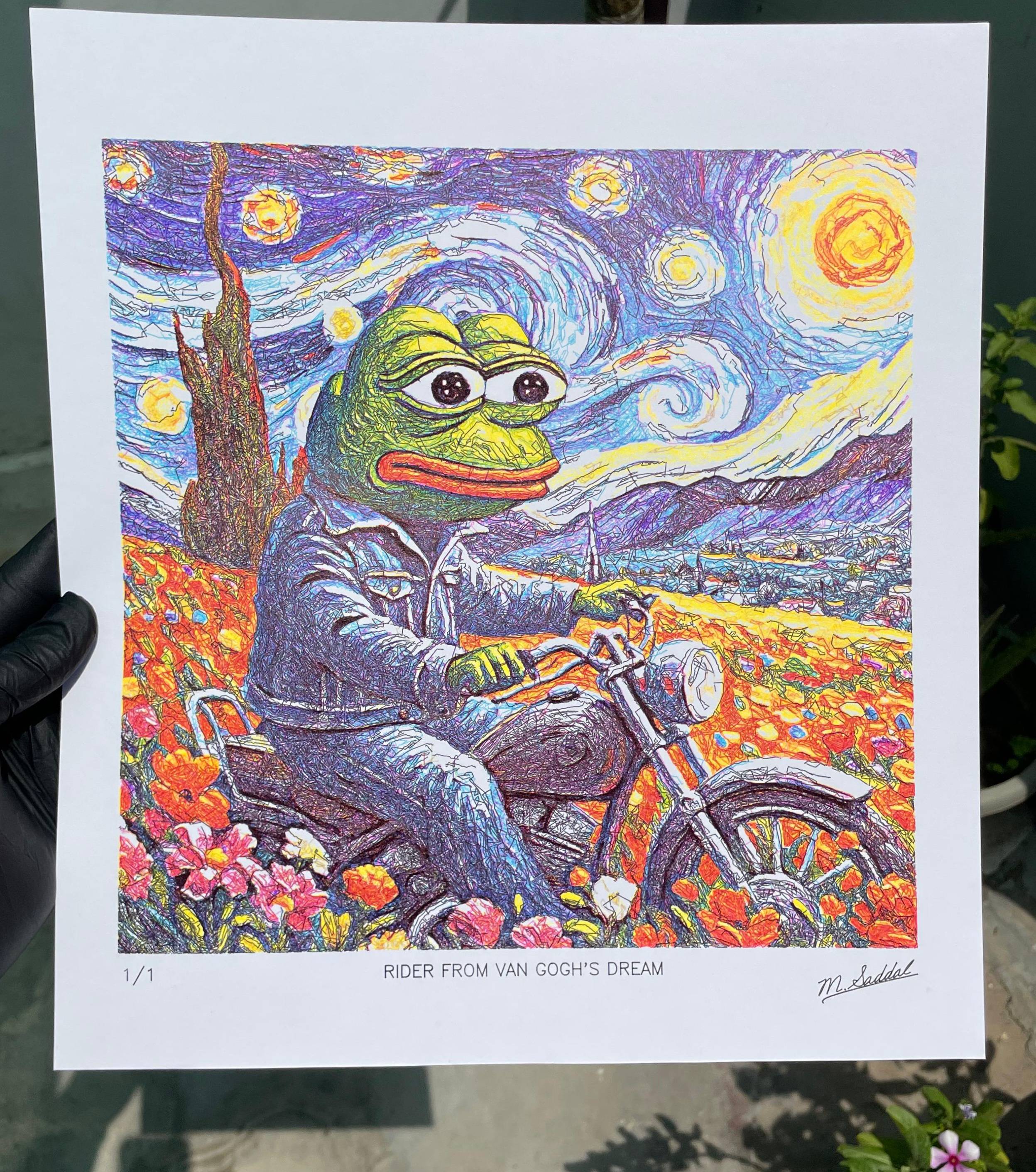 Rider From Van Gogh's Dream is an artwork created using generative process (AI+Code+Pen Plotter). Artwork is created using AI, post processed with procreate, JavaScript code is used to split image into lines of 0.35mm and plotted on ultra smooth Bristol sheet using pen plotter.