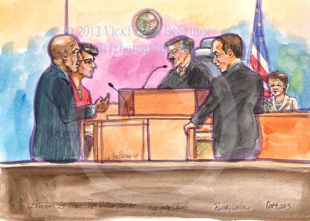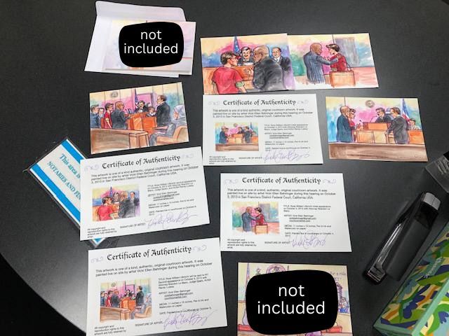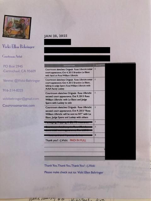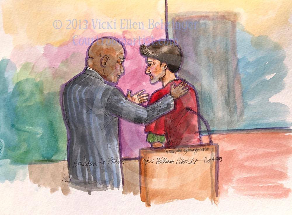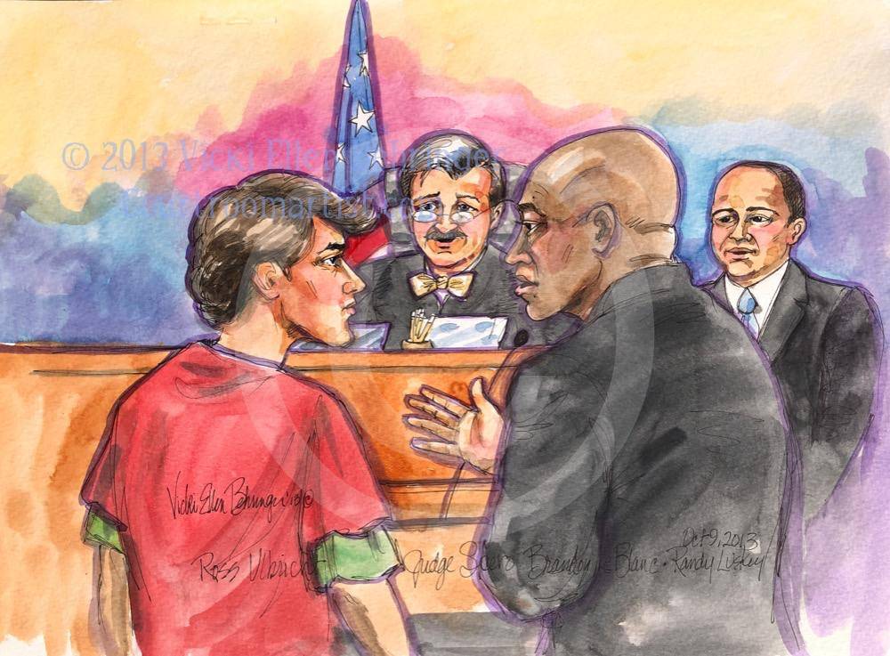 This collection features four original court sketches by Vicki Behringer, created during the very first public court appearance of Ross Ulbricht in 2013, shortly after his arrest in San Francisco. Behringer was the only artist allowed in the courtroom that day, making these the only known sketches from this historic hearing. Ulbricht was later tried and sentenced in New York, but it was in San Francisco where he was first detained and presented before a judge, the moment captured in these drawings.
