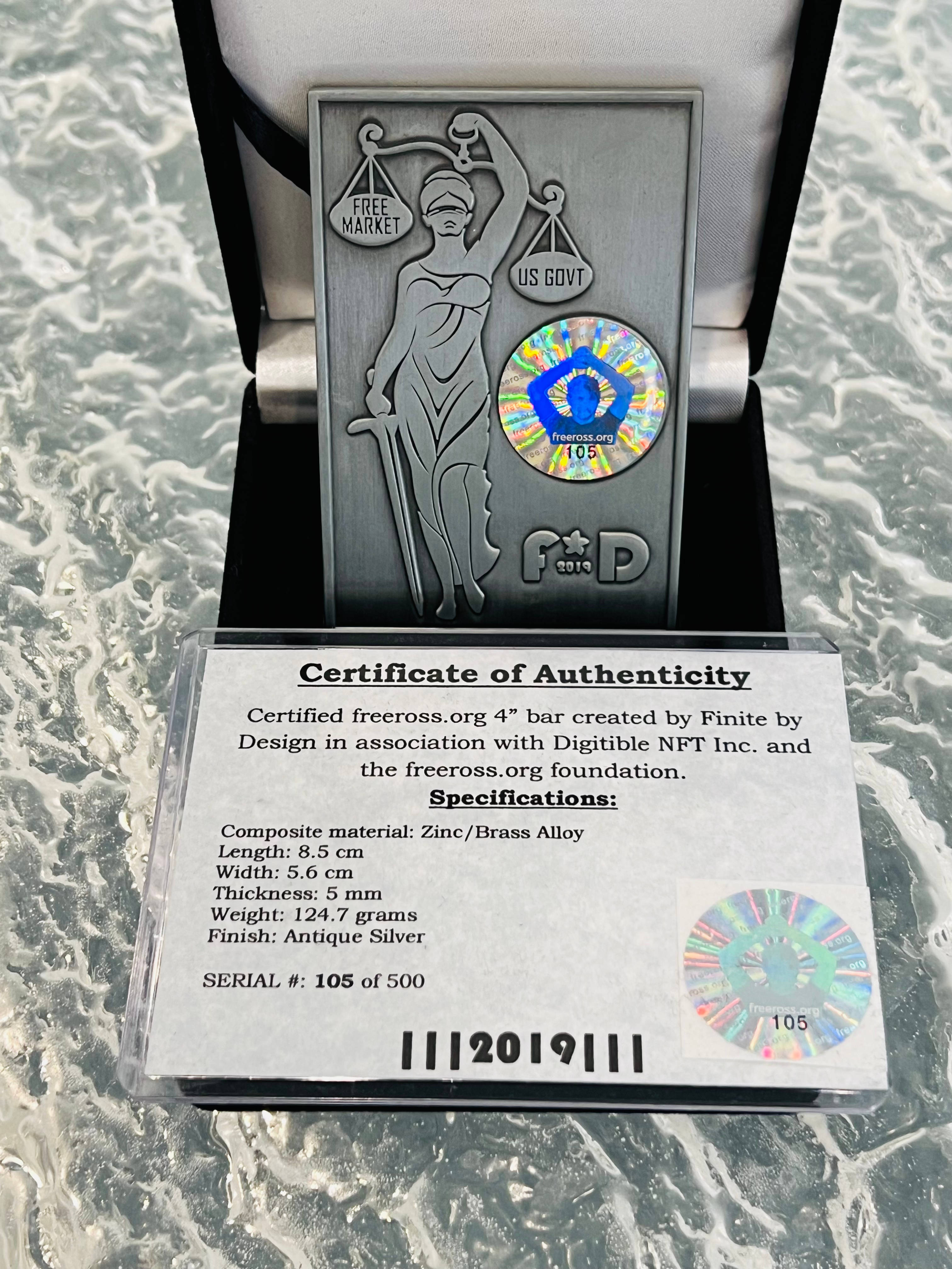 2019 Ross Ulbricht FREEROSS Bar made by Digitible (I am the one of the co-founders) in May 2019 of Zinc/Brass Alloy with only 500 produced. The front side features Ross the number of the bar #105/500 with FreeRoss.org along the bottom and Digitible along the top. The back side of the bar features the scales of liberty with Free Market Vs US Gov and funded ROSS NFT that can be redeemed by peeling the FreeRoss custom hologram (there is a second hologram that comes with the bar incase you redeem the NFT and want to refund for collectors' purposes. Includes a paper COA from Finite by Design who designed the bar's for Digitible in early 2019. Each hologram sticker matches the bar number, there are about 25 people in the space including Max Keiser, Peter McCormack, Ross's Family, Allota Money that all had/have a Ross bar. The NFT has only ever been redeemed once of all the bars sold with and amazing NFT of Ross Ulbricht wearing a tuxedo and a Bitcoin bowtie that can be used to access the Digitble build in Decentraland with access to the 5th floor where Ross Ulbricht is behind the bar waiting to serve up a cold beer. The winning bidder will need MetaMask and Ethereum to redeem the NFT should you choose to.