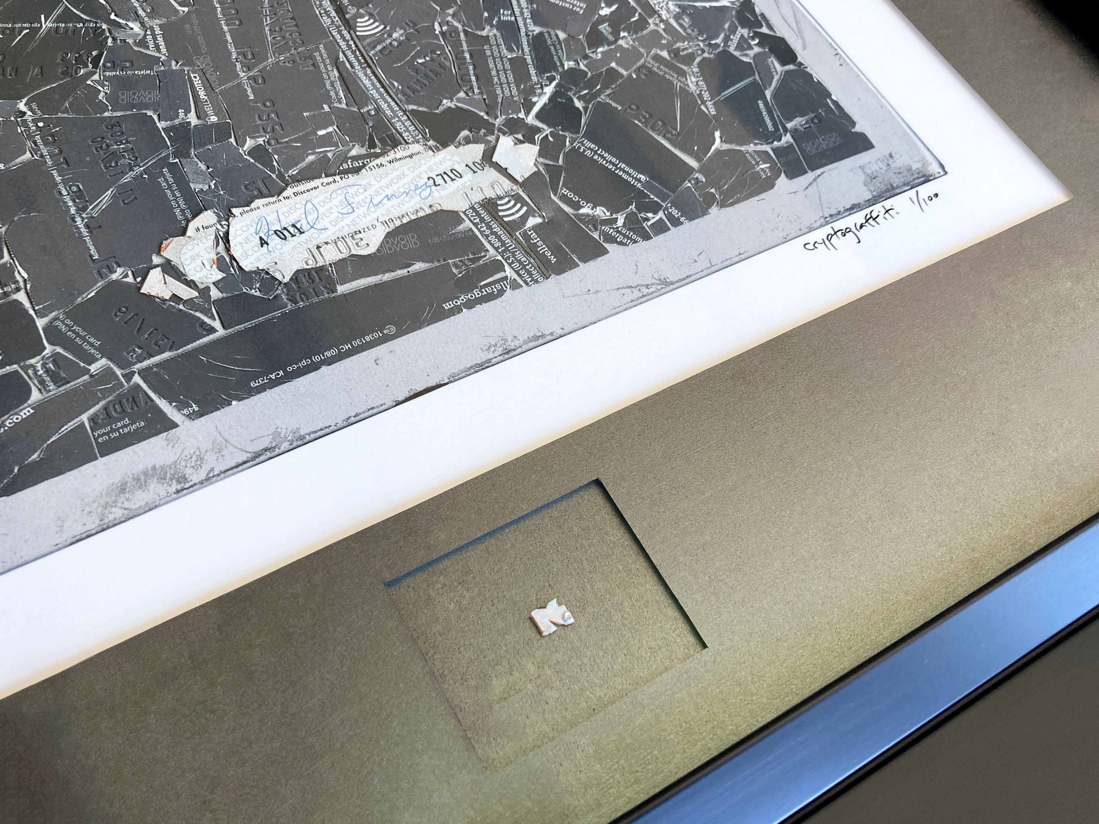 The original piece is composed of repurposed credit cards atop a used bank deposit box. Inside, a customized node allows one to "run bitcoin." This WiFi-enabled node is adhered to only run when paired w/ the art. The artwork/node is currently active on the network.