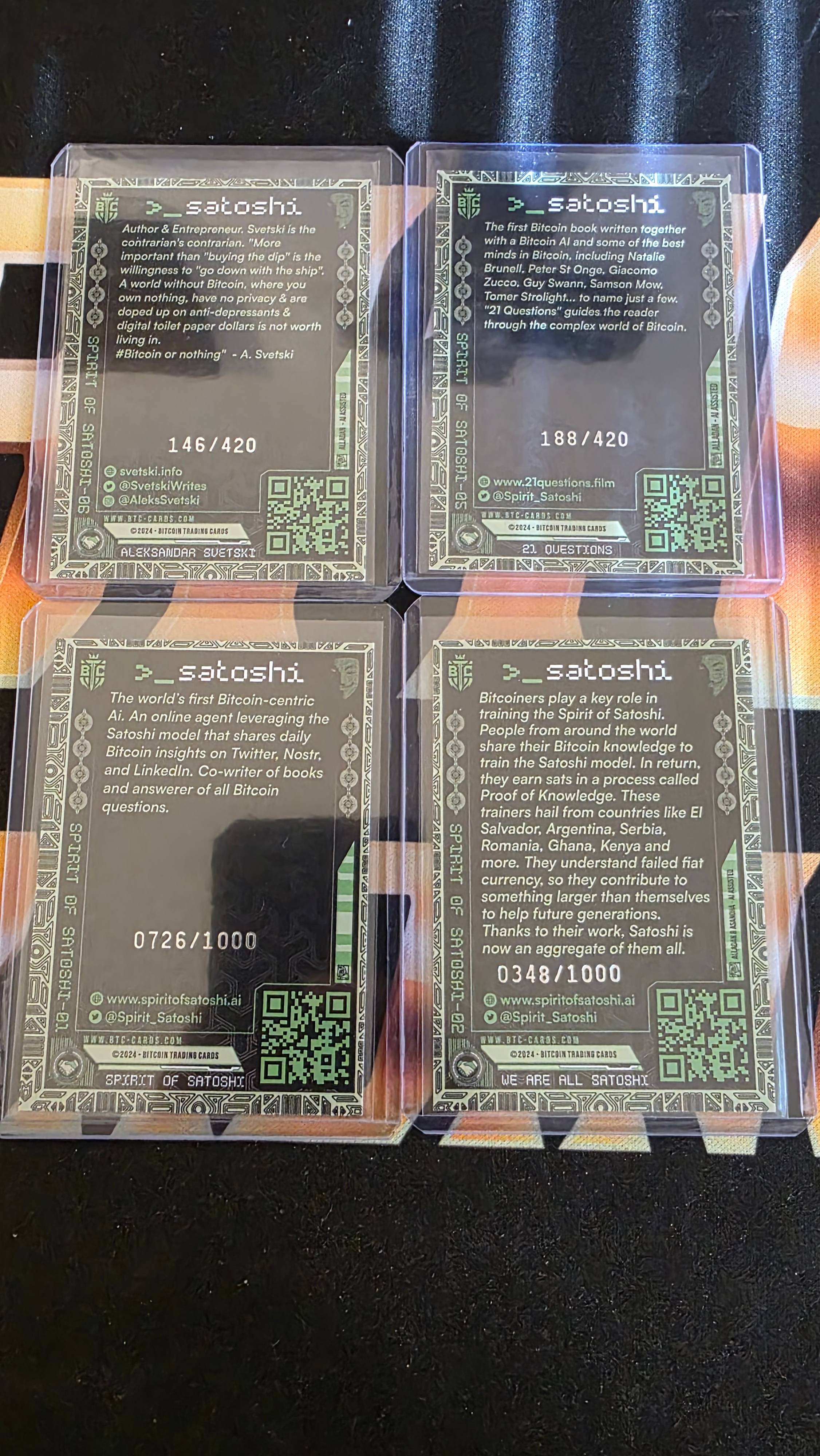 Spirit of Satoshi series from bitcoin trading cards. Bundle consist of 9 holo base, 18 base cards. 4 chase cards. 348/1000 we are all satoshi. 726/1000 spirit of Satoshi. 146/420 Aleksandar Svetski. 188/420 21 questions.