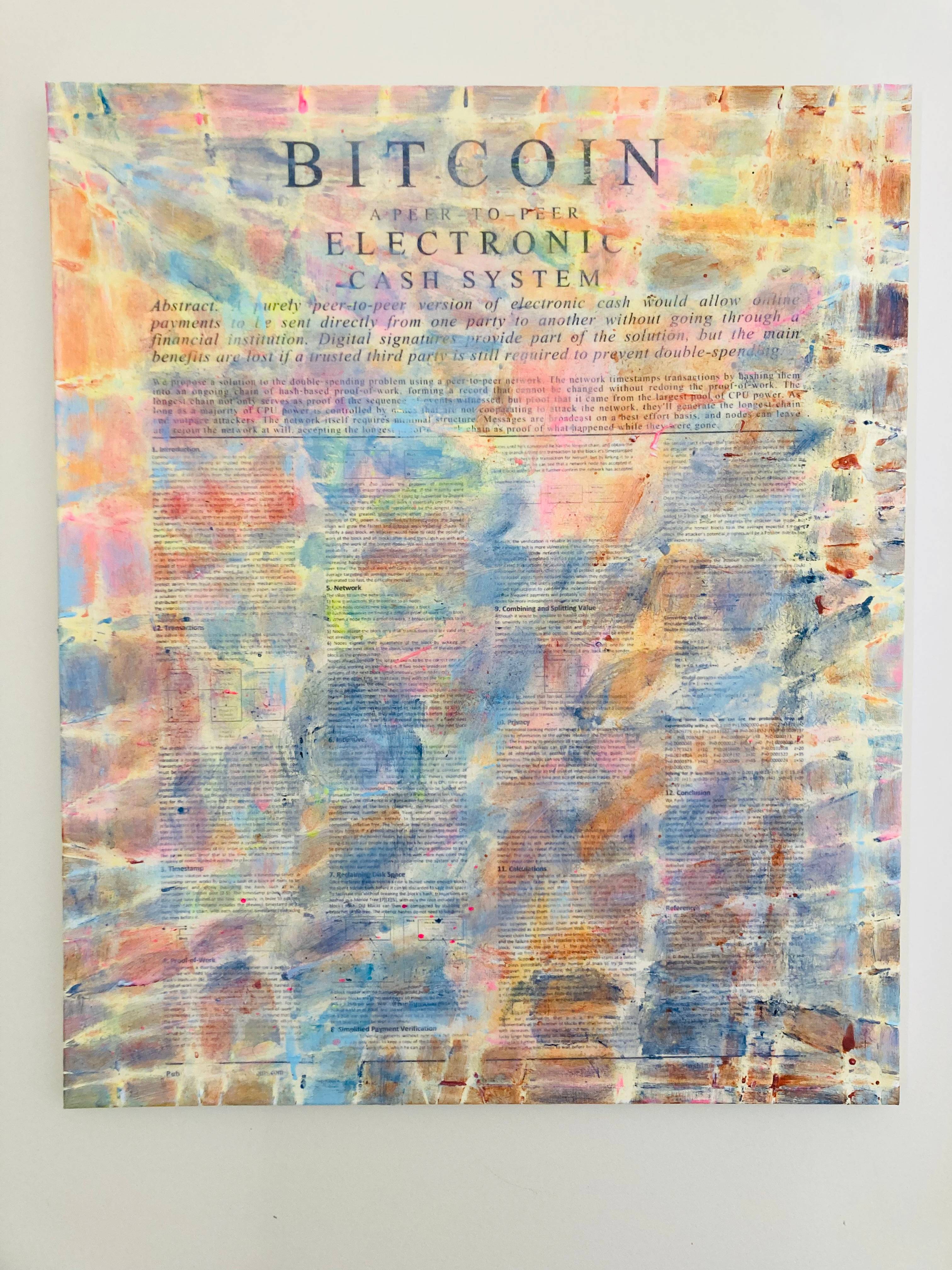 My process is paper glued down and scraped off, string outlines for network effects, and many layers of Acrylic Paint added to Linen Canvas.