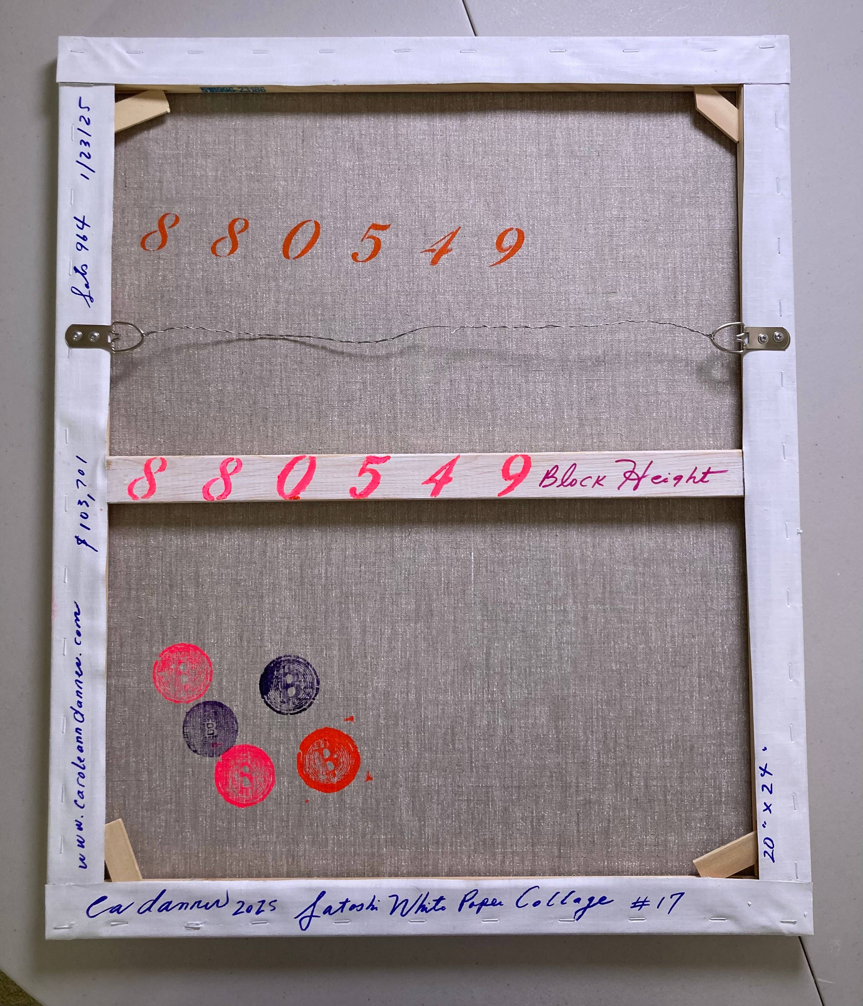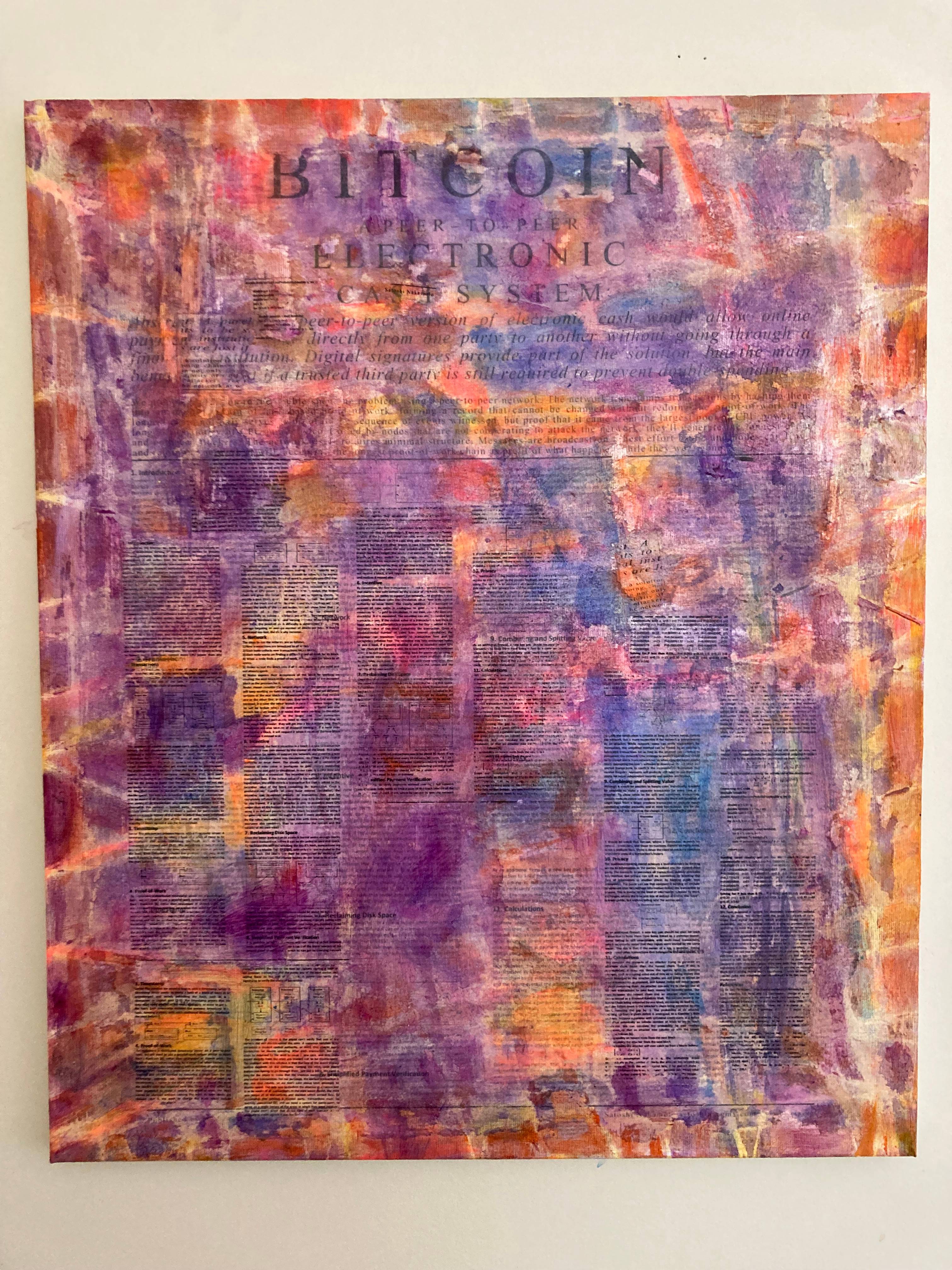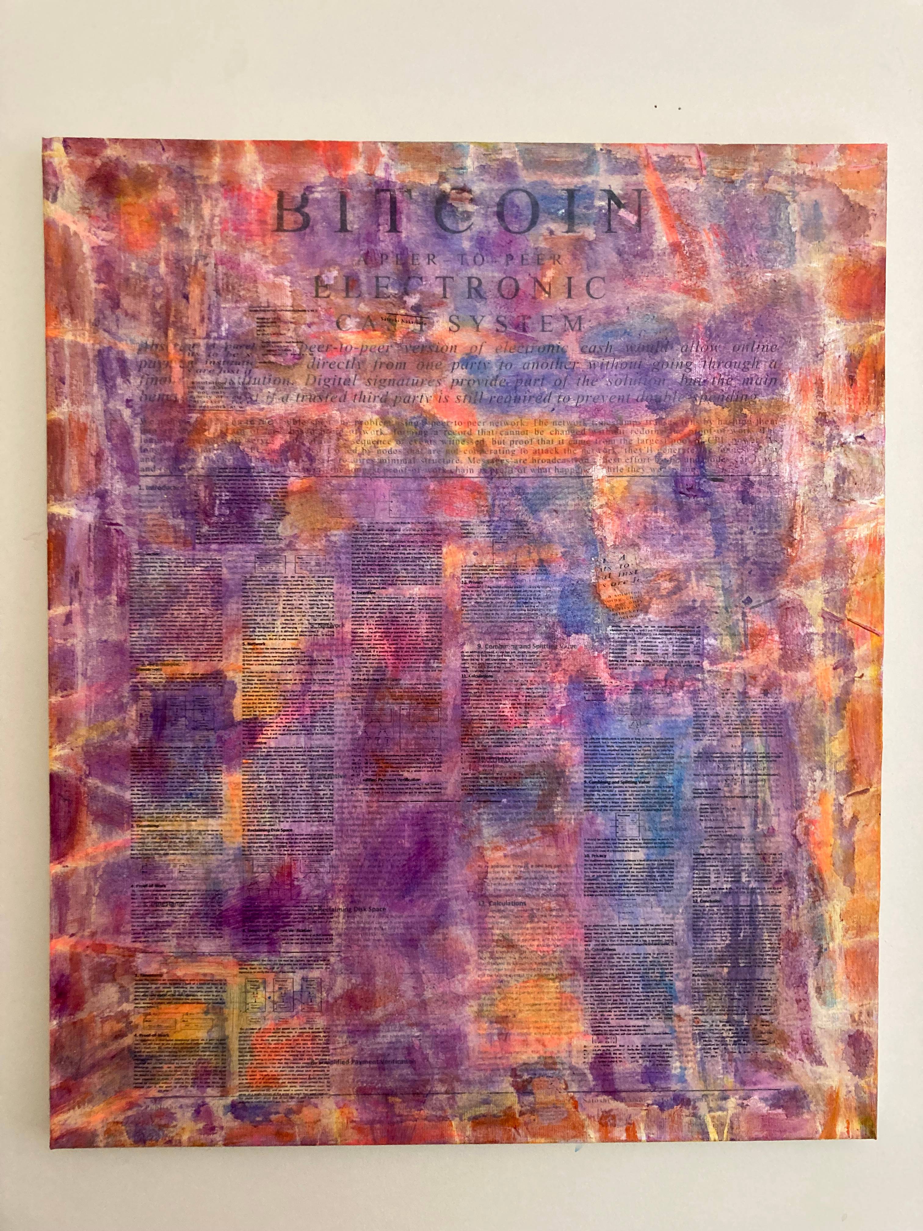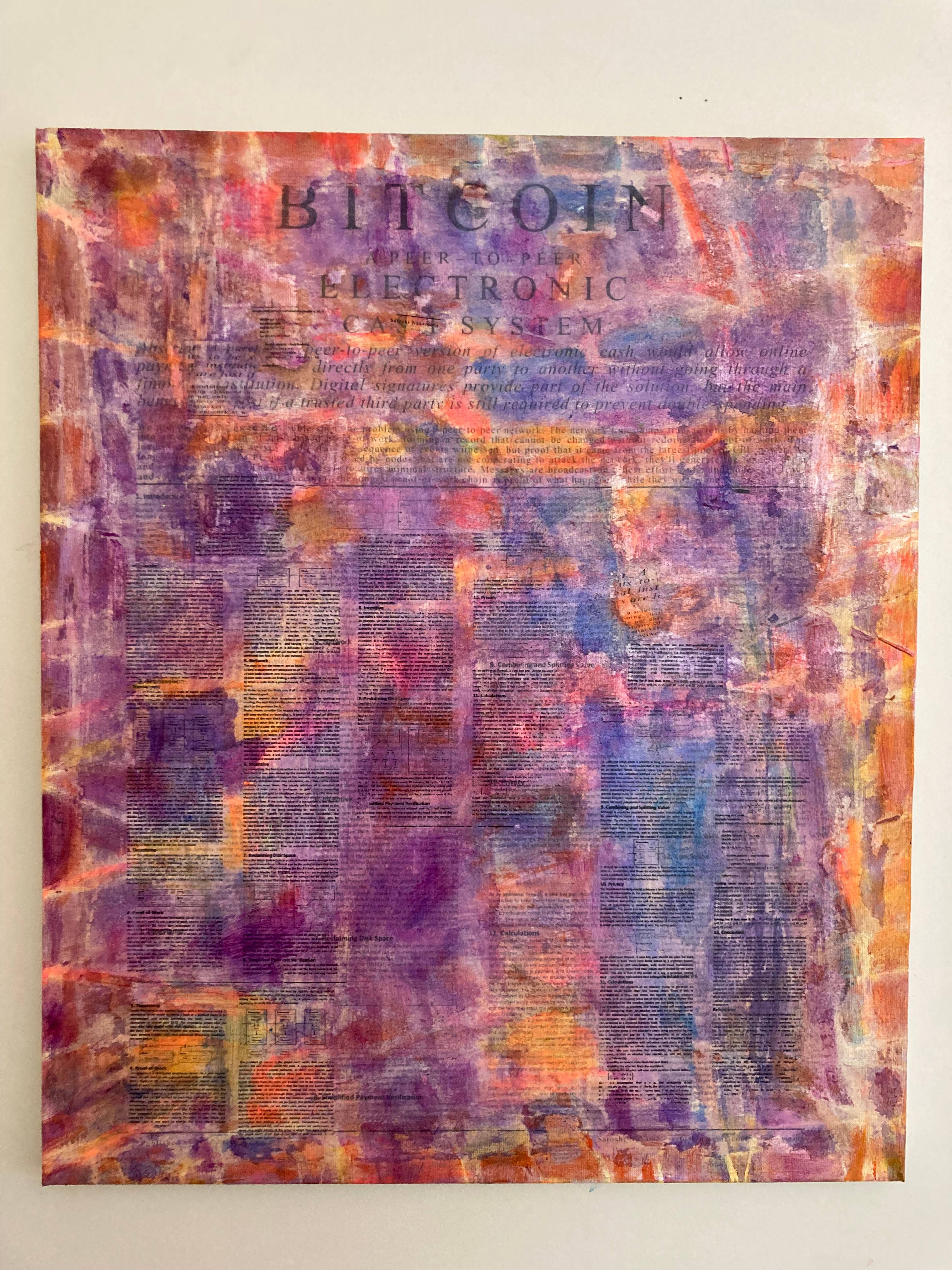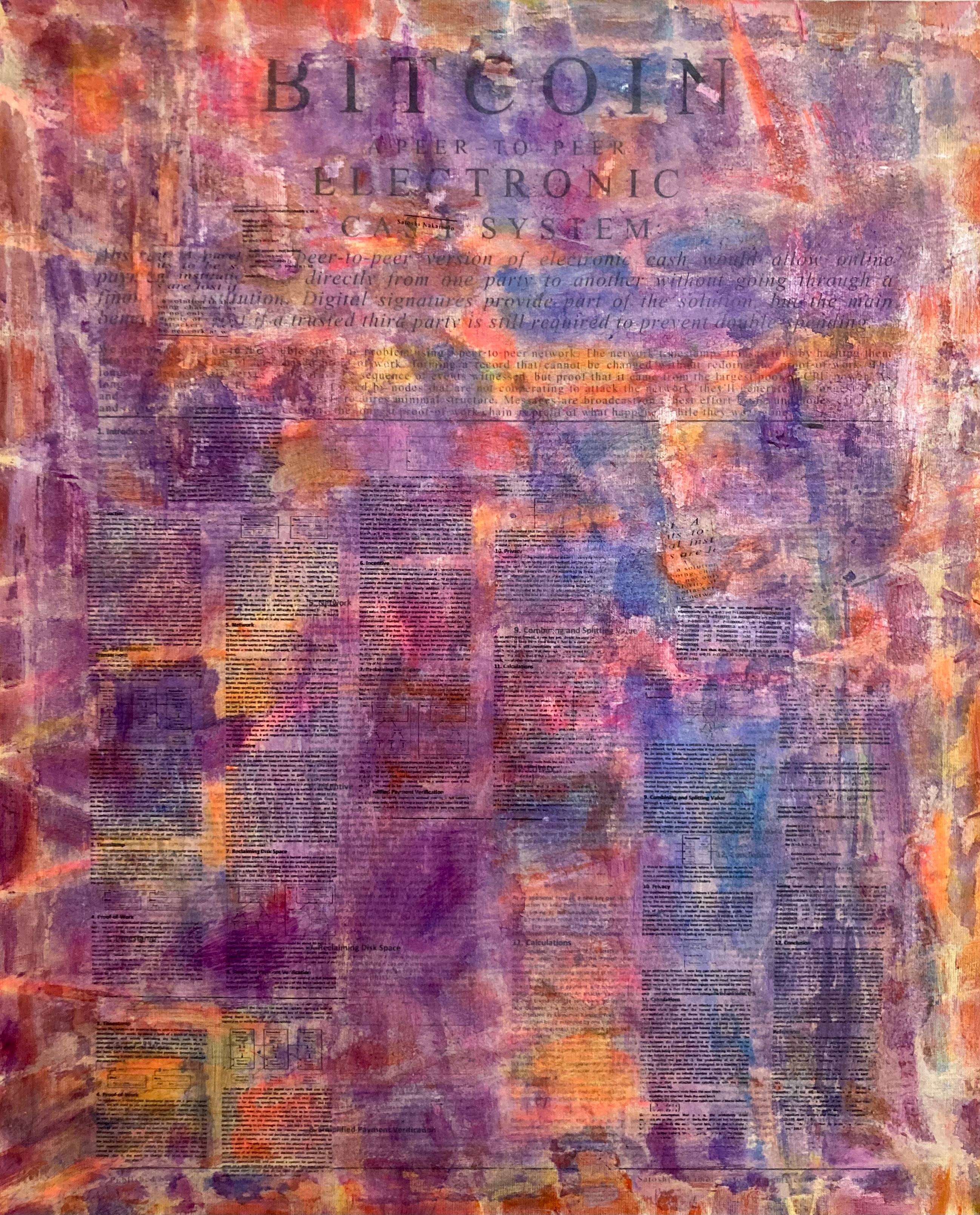My process is the Satoshi White Paper is glued down and scraped off, string outlines for network effects, and many layers of Acrylic Paint added to Linen Canvas.