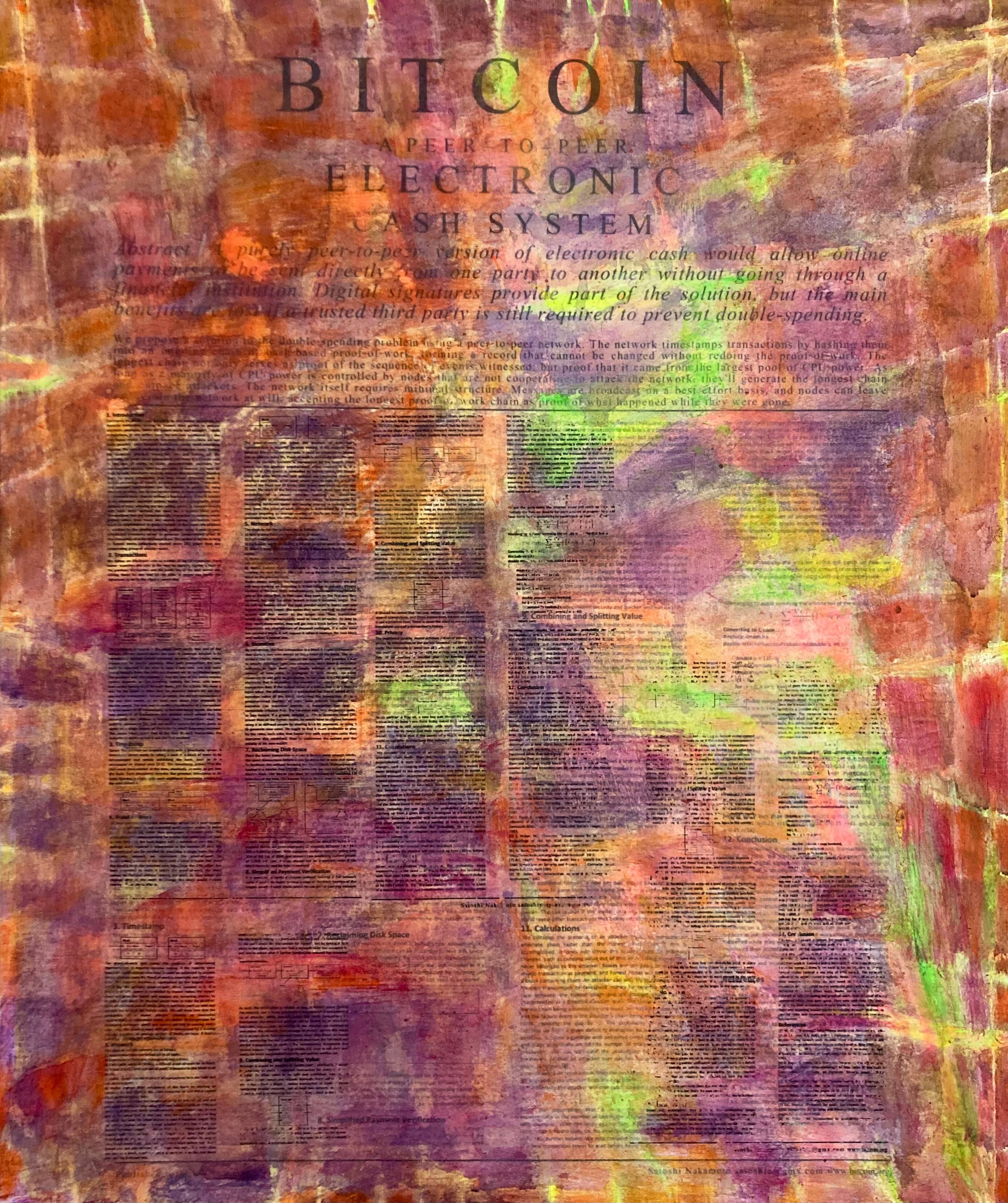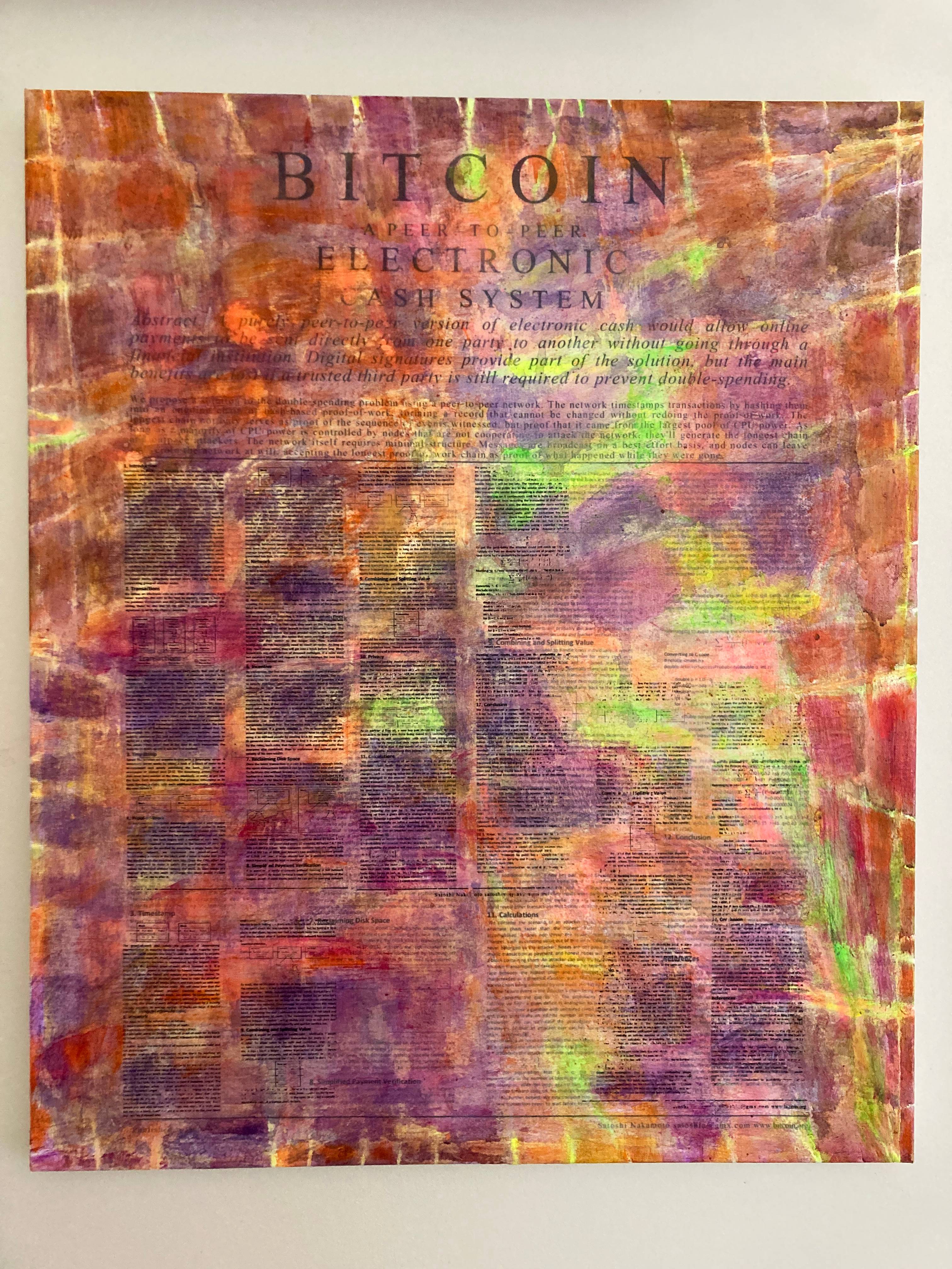 My process is the Satoshi White Paper glued down and scraped off, string outlines for network effects, and many layers of Acrylic Paint added to Linen Canvas.