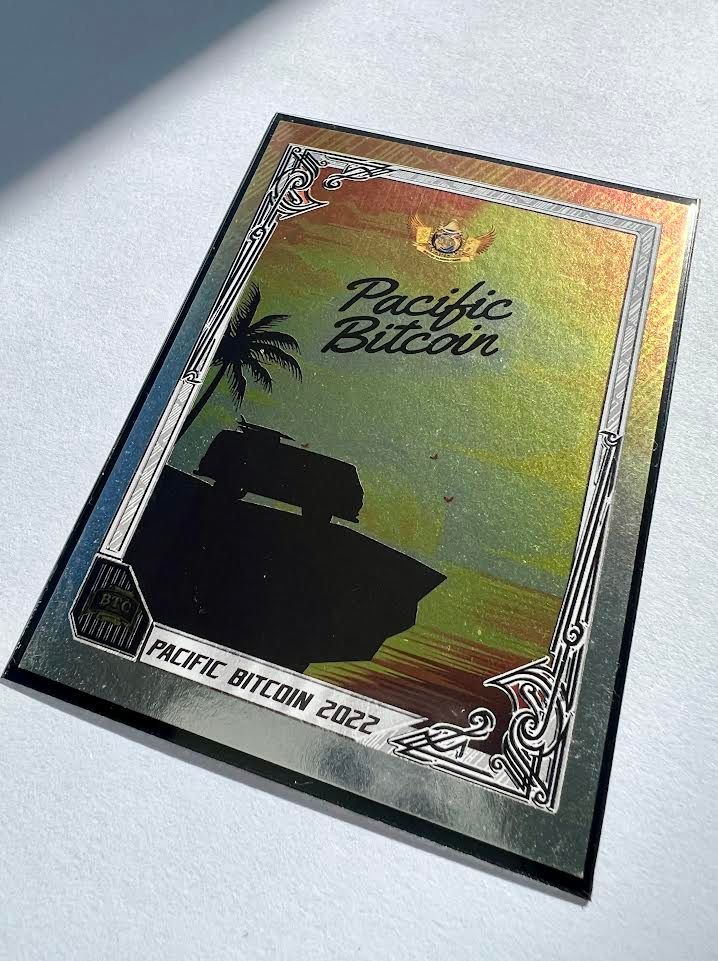The dual set of limited edition Pacific Bitcoin Rare cards from the Pacific Bitcoin event packs at the launch of btc trading cards.