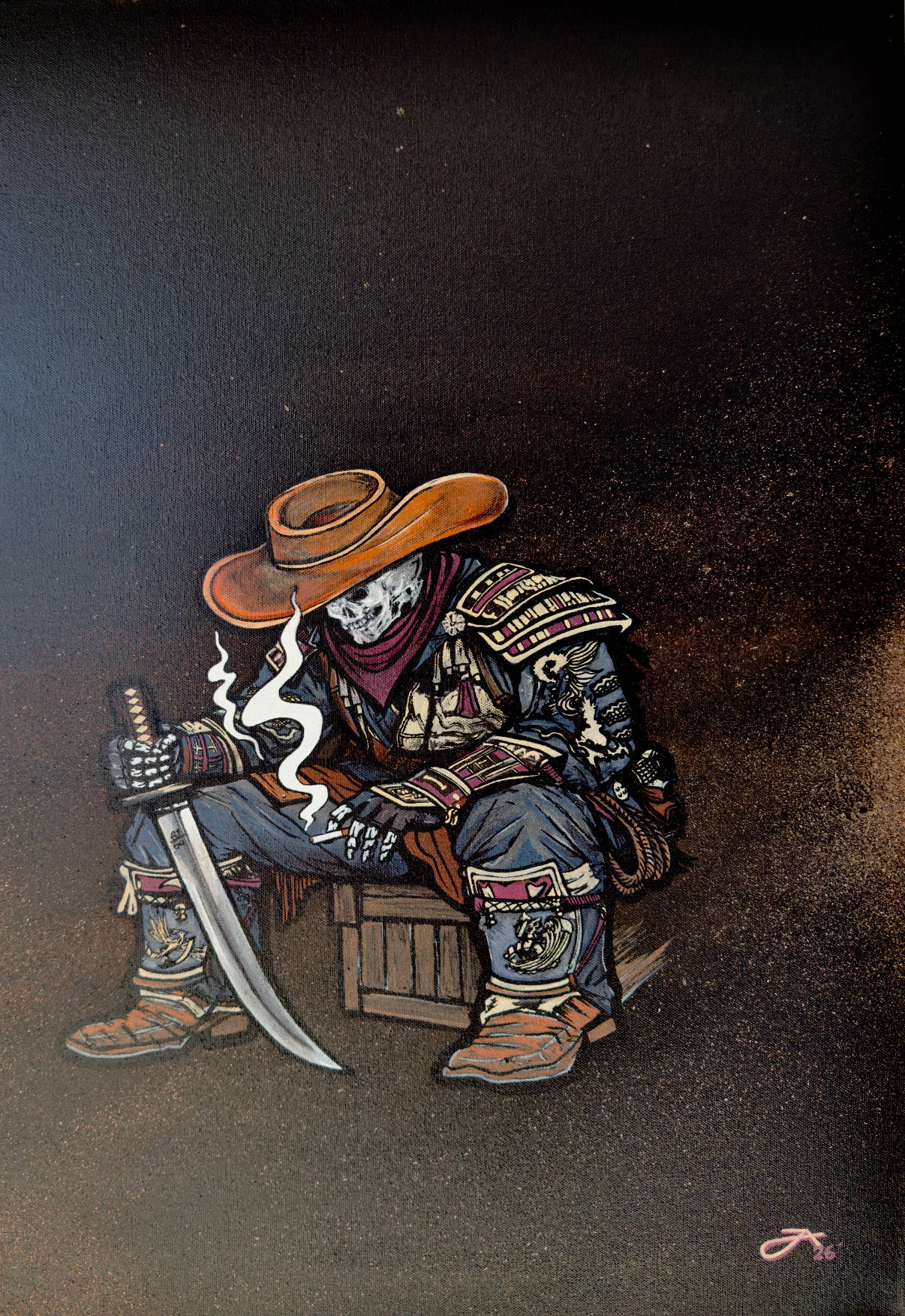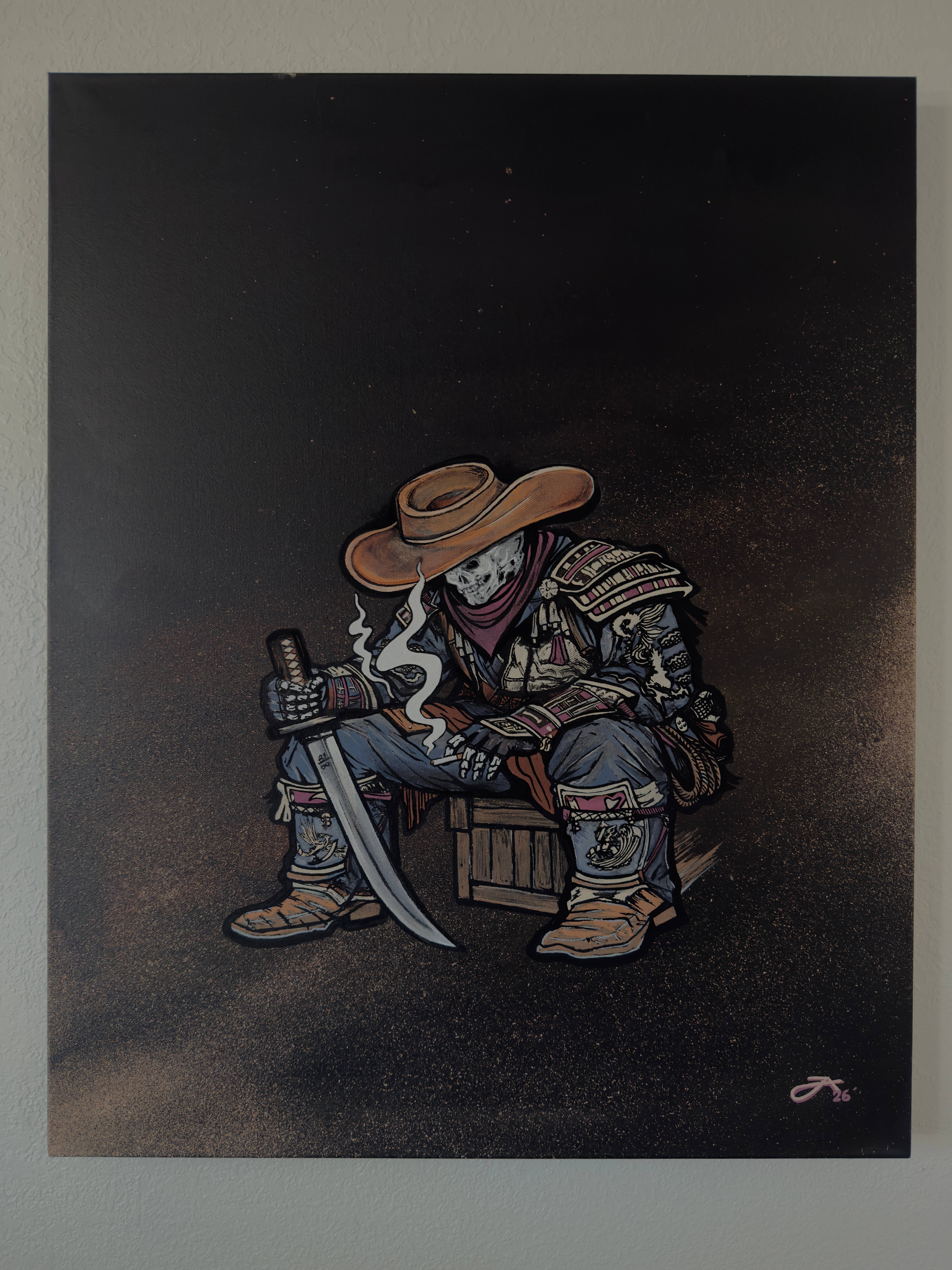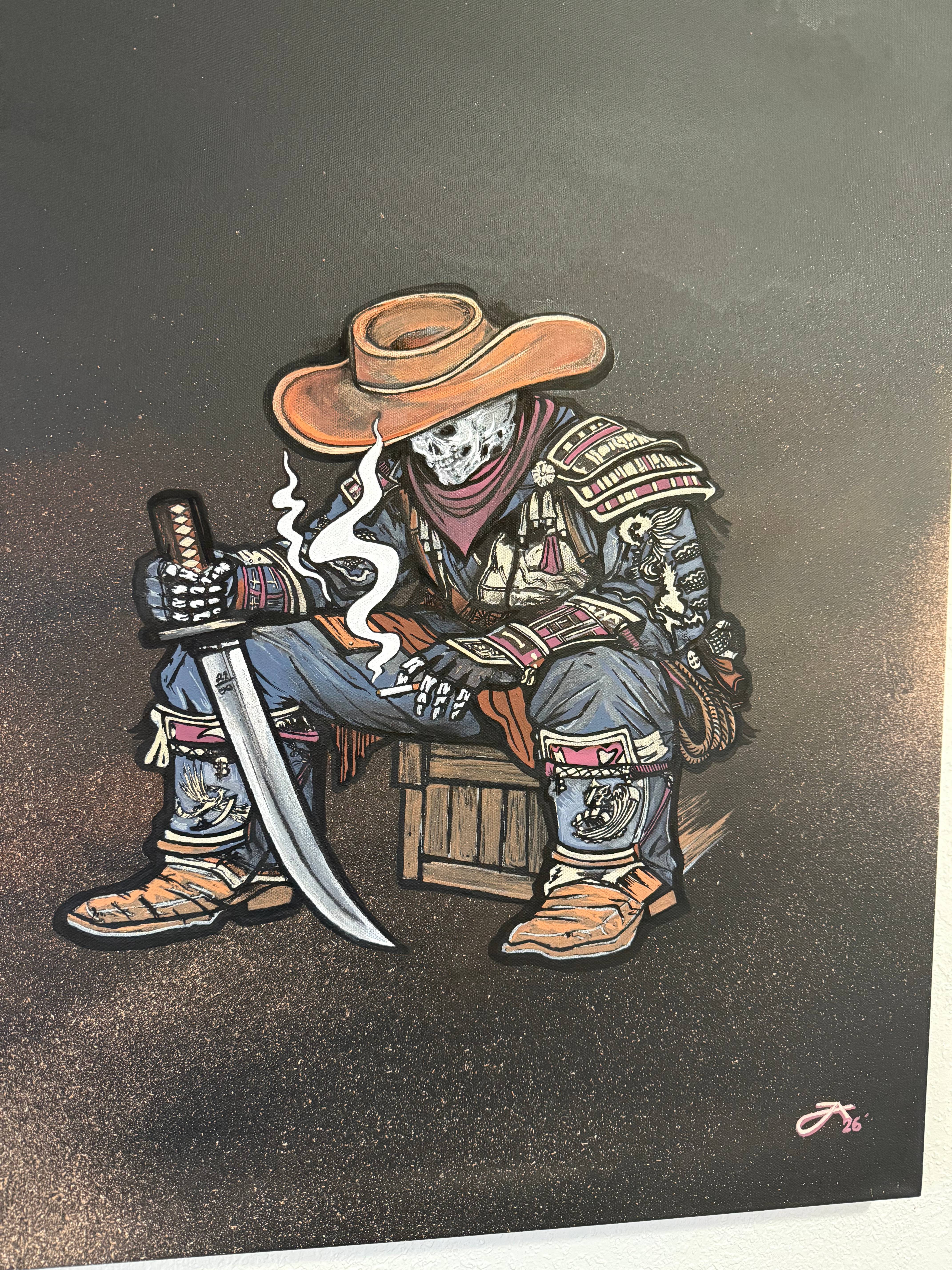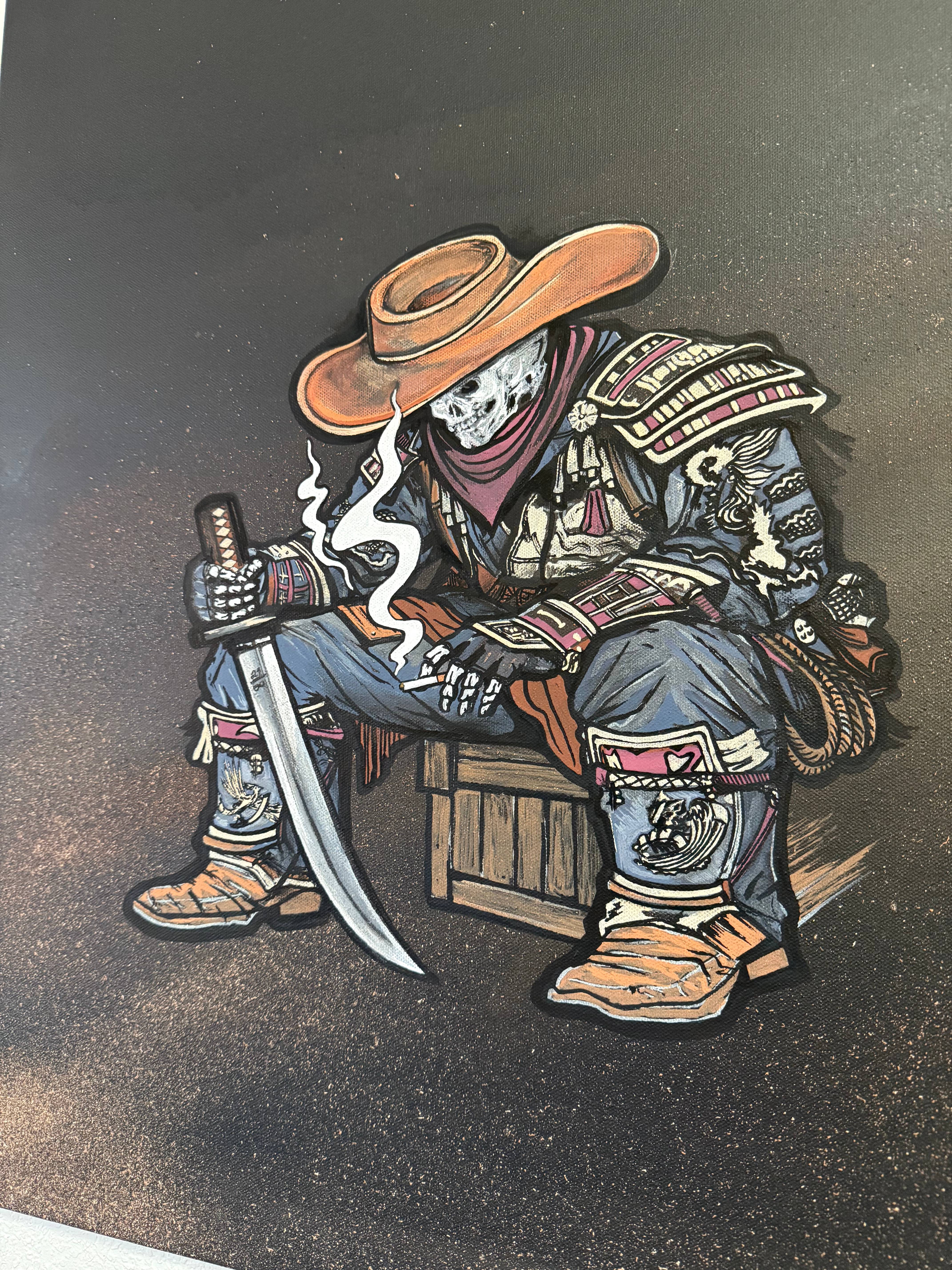 The Smoking Shogun is a Acrylic on Canvas piece created from ArtworkbyJA in 2026. It features a skeletons past of a Cowboy in Samurai armor. Closely, the details of the Phoenix in the left boot the 21M/Infinity in the sword and the honey badger in the right boot to the viewer.
