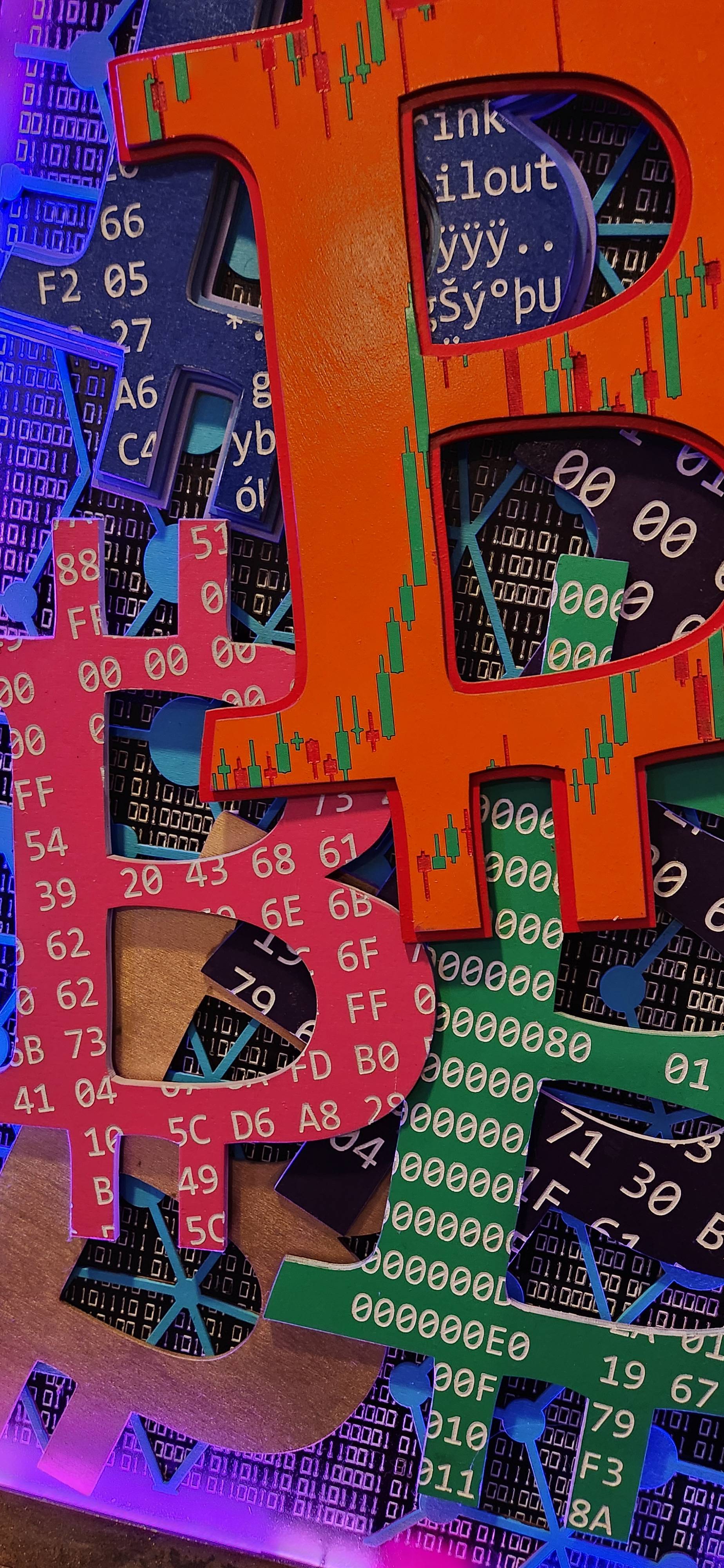 Made from multiple layers of laser cut Bitcoins. Each Bitcoin is etched with snippets of information from the Bitcoin Genesis block. The orange Bitcoin in the middle contains a candlestick charts snapshot of Bitcoins past 2 years as of February 2024. The backmost layer is painted black and is etched with the Abstract from the Bitcoin white paper, translated into binary. 12V Multicolor individually addressable cob LEDs around the edge that change every few seconds giving those observing it endless visually pleasing light changes and bursts of color. The back of this piece includes information about the art as well as another hidden golden Bitcoin, and the LED electronics mounted over green and gold PCB boards.