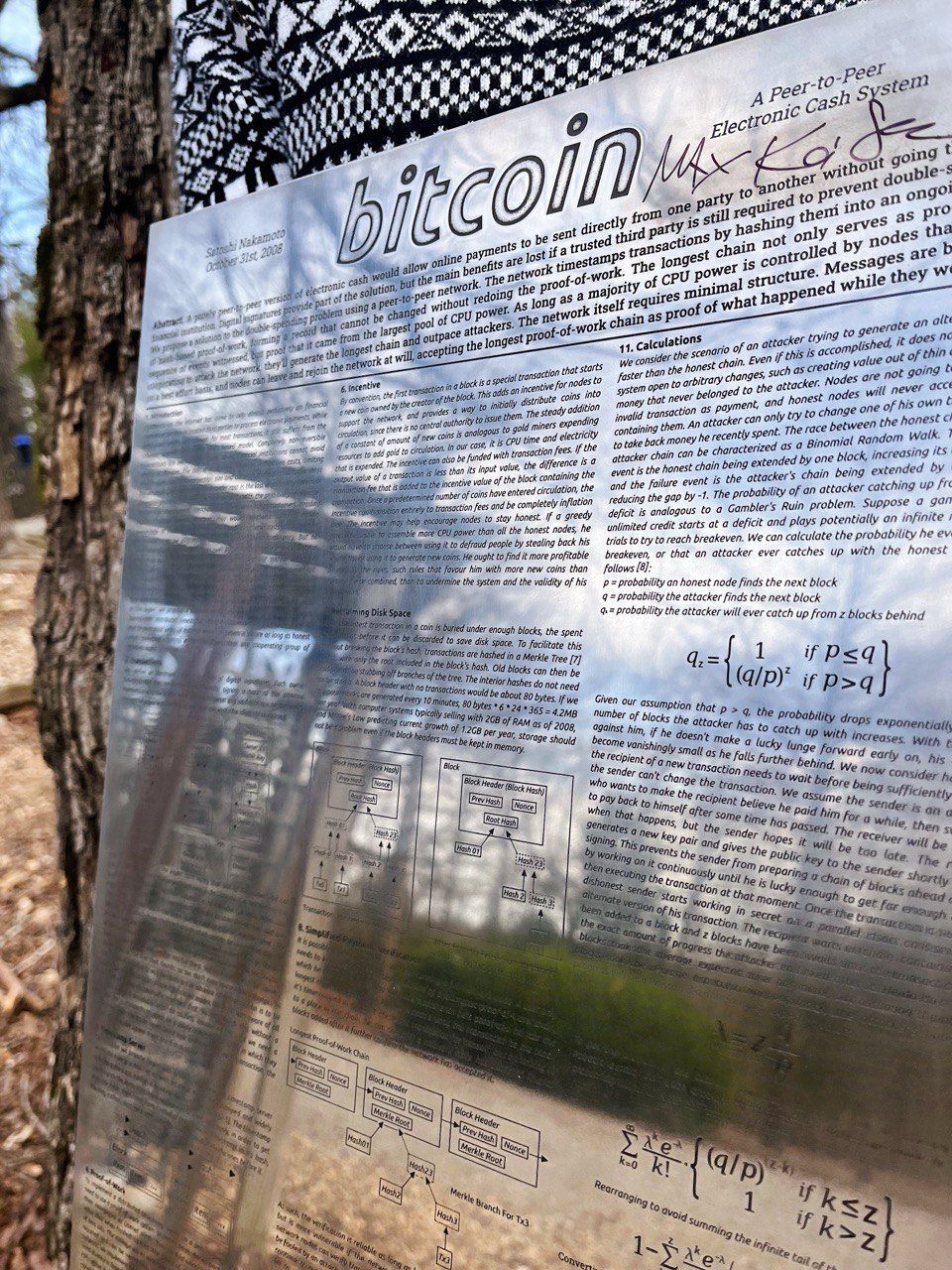 Etched 304 Stainless Steel Bitcoin Whitepaper that was signed by MAX KEISER at Bit Block Boom (2023). This measures 11.125 inches wide and 19.75 inches tall and is 0.060 inches thick. It has a semi-reflective finish and a permanent adhesive backing. This is the ENTIRE Bitcoin Whitepaper (published by Satoshi Nakamoto in 2008) deeply etched into stainless steel. Made by CODL STORAGE SOLUTIONS (Punchplate.com)