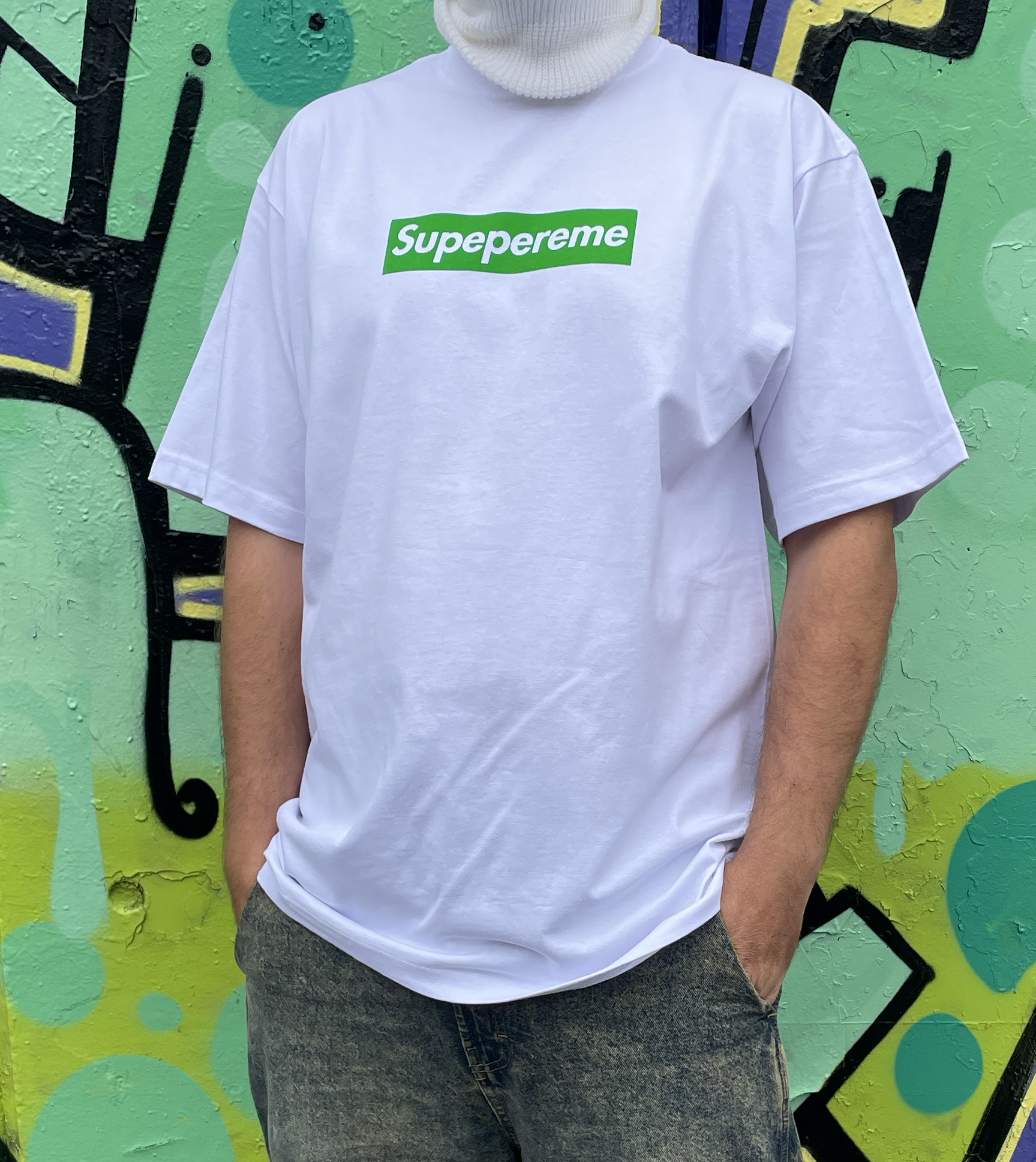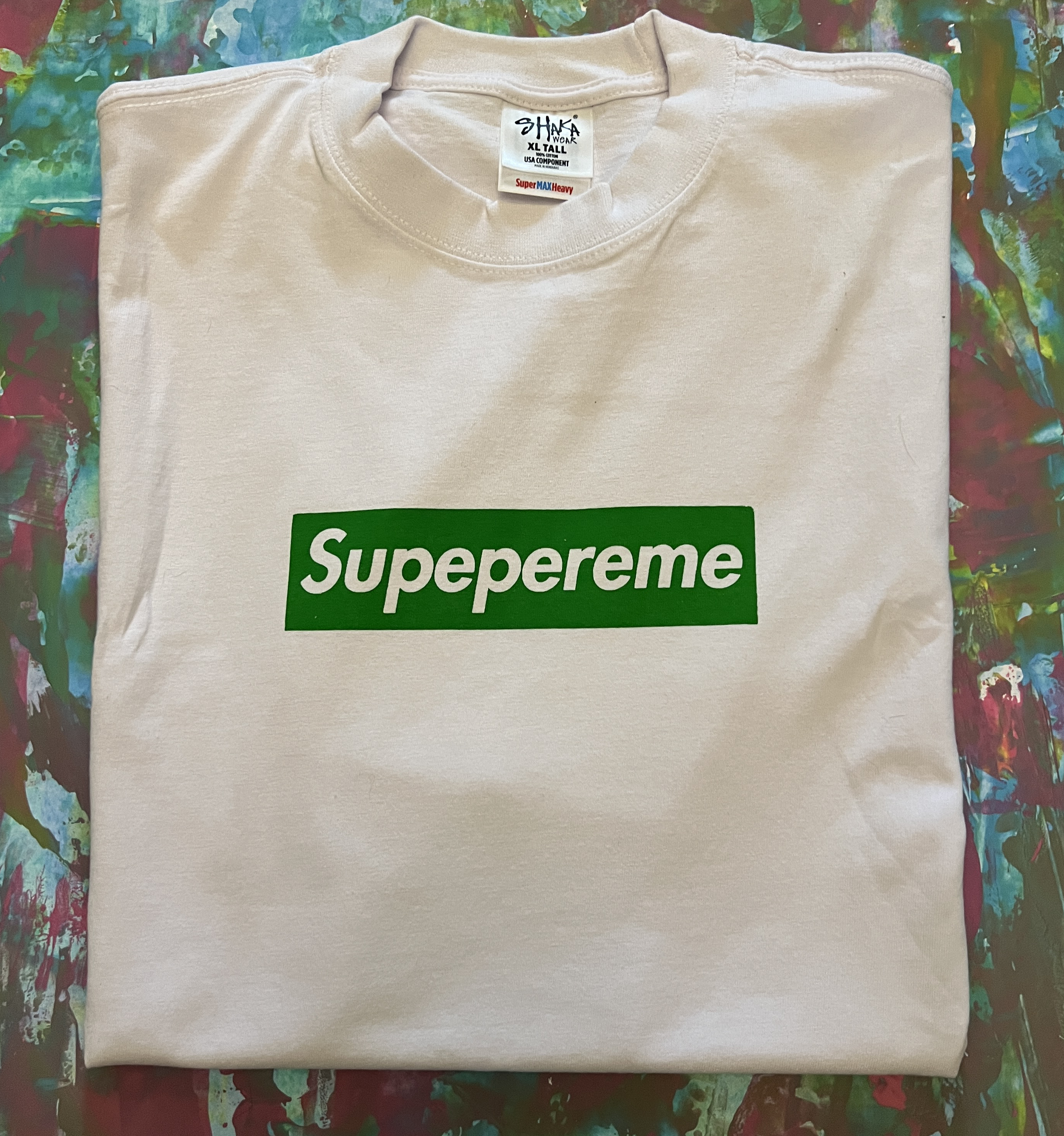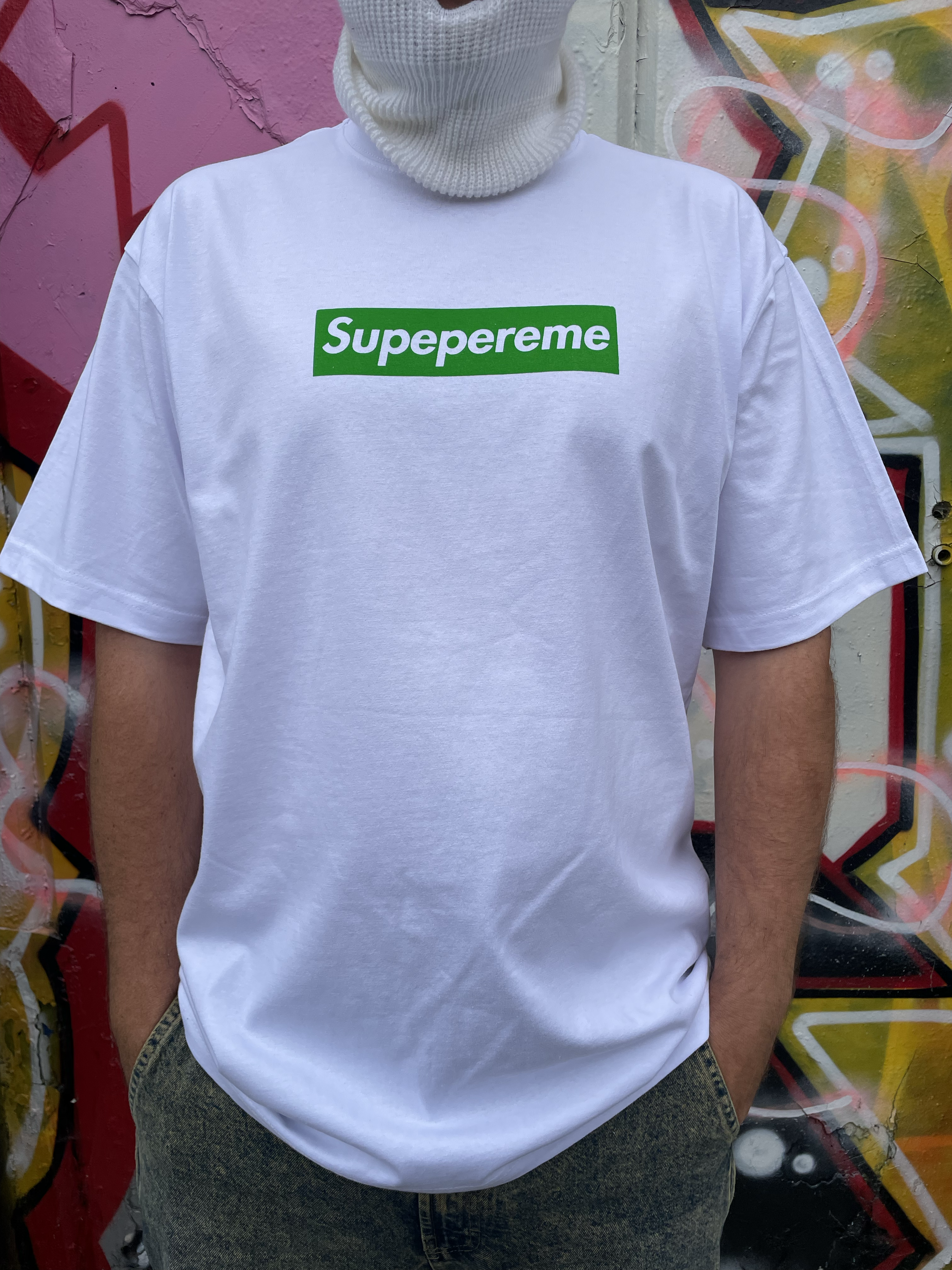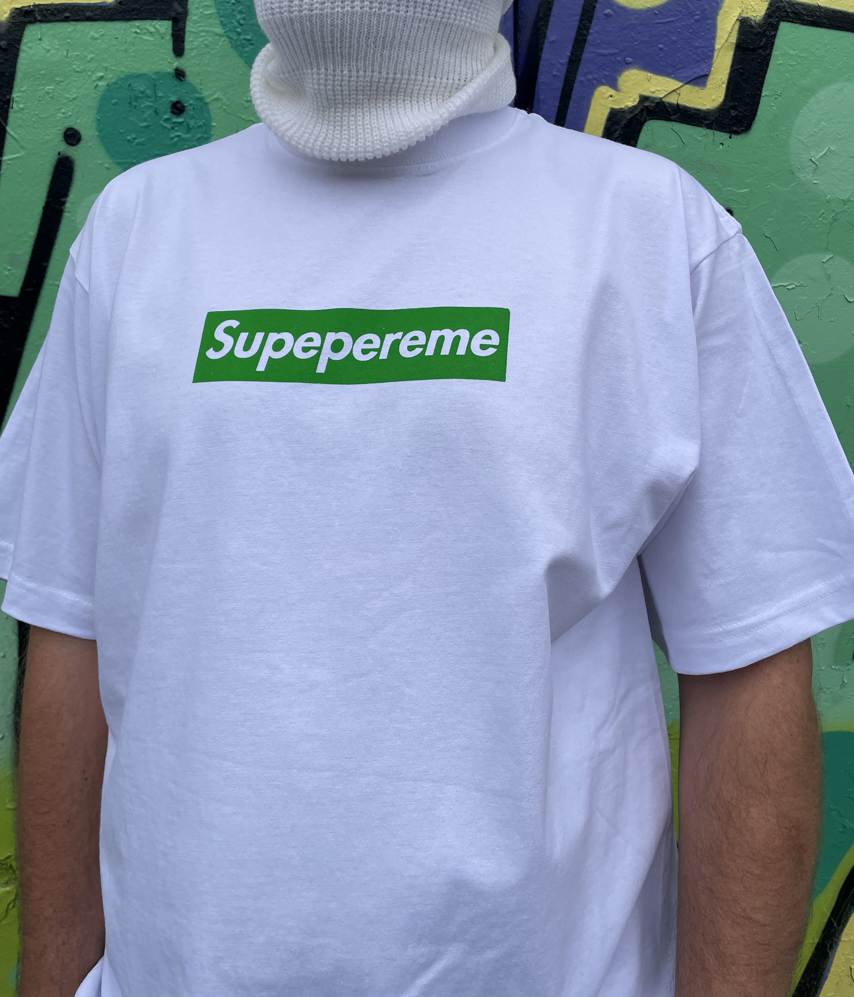 This one colour T-shirt print features the “Supepereme” Design, a play/parody on the supreme box logo in bright froggy green and is hand numbered. Adorn yourself in scarce memetic prowess with this look-twice design, A rare fusion of internet culture, Bitcoin ethos, and streetwear legacy - A playful twist on streetwear culture, this shirt reimagines the iconic supreme box logo tee with a memetic edge – it proudly declares “Supepereme” – a nod to the internet’s most powerful cultural force: memes and more importantly pepe. It pays homage to one of the most iconic designs in streetwear history, reinterpreted through the lens of memetics: an unstoppable cultural wave, much like bitcoin.