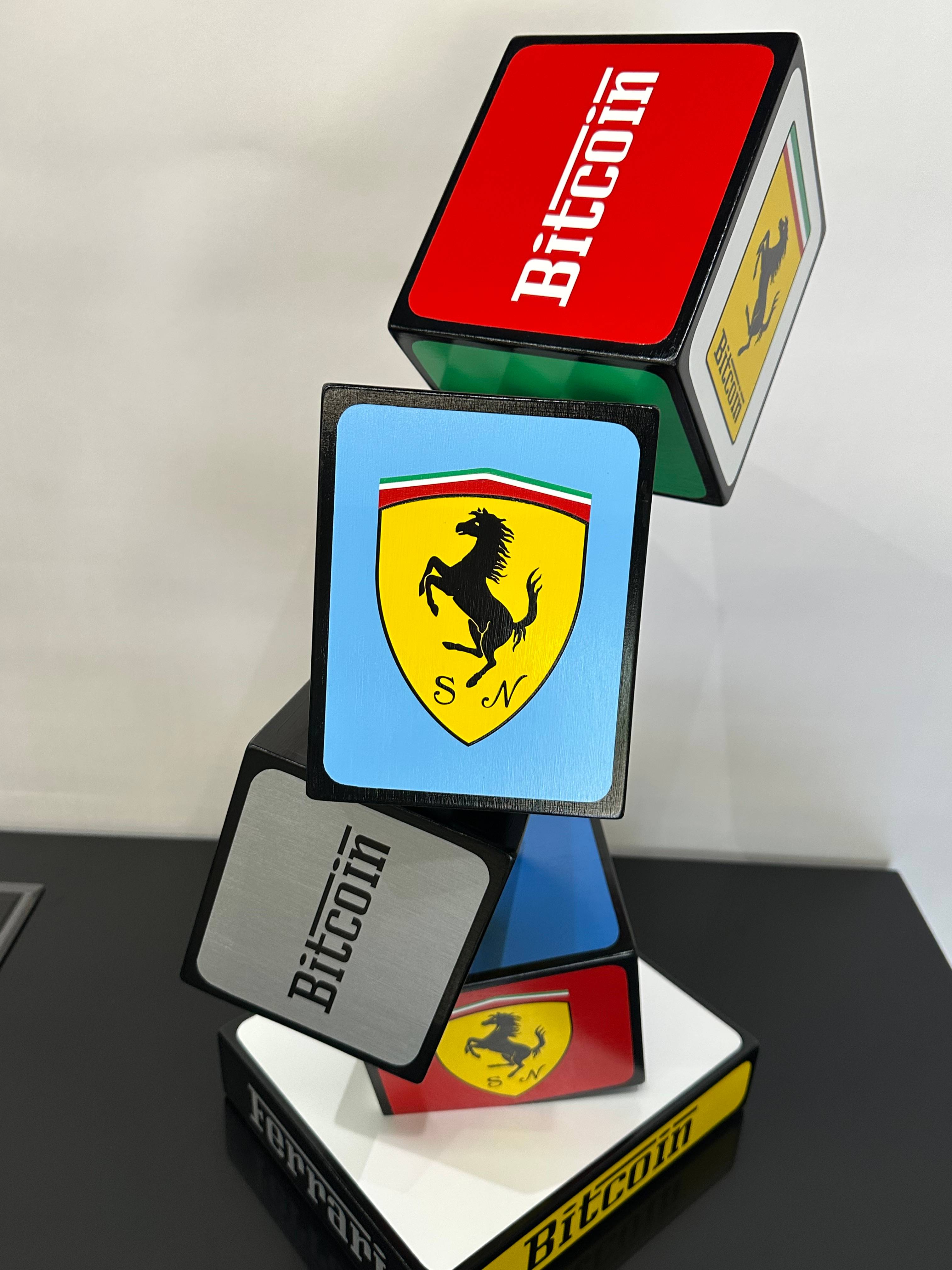 Ferrari-Bitcoin inspired table pedestal. Acrylic on wood.