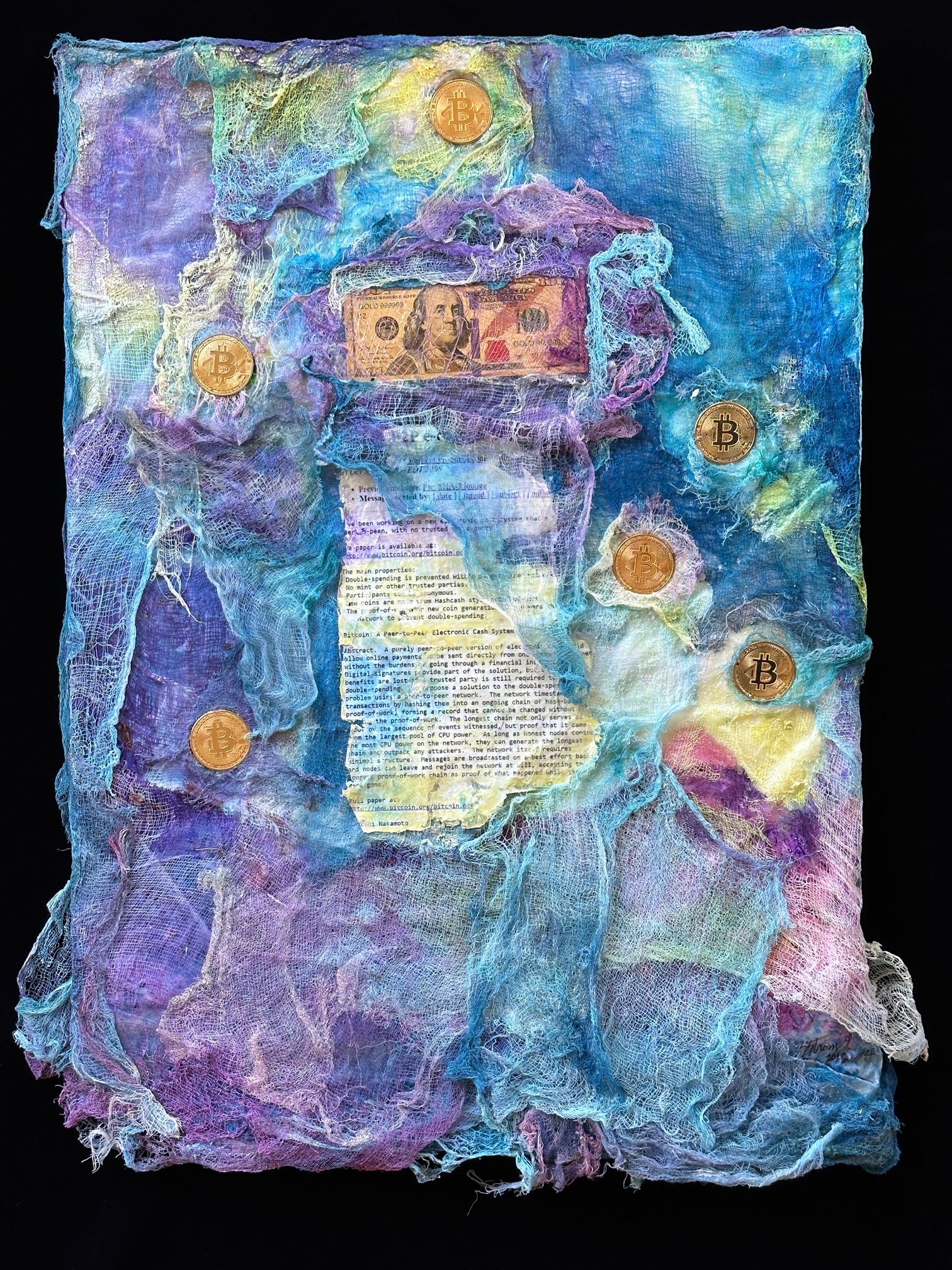 I went down the Rabbit Hole in September 2018 after being burned by altcoins. I returned from exhibiting my Bitcoin Art at the 2021 Bitcoin conference in Miami. I had begun this artwork in early 2017. Alt commencement coins were embedded in the piece. Digging them out and exchanging them all with Bitcoin commencement coins was symbolic. I had become a Bitcoin Maximalist! This 20" x 32" Acrylic painting is on silk and cheesecloth, adhered to canvas, with commencement coins symbolically replacing Gold And Fiat. Satoshi Nakamoto's first E-Mail is transferred in the middle.