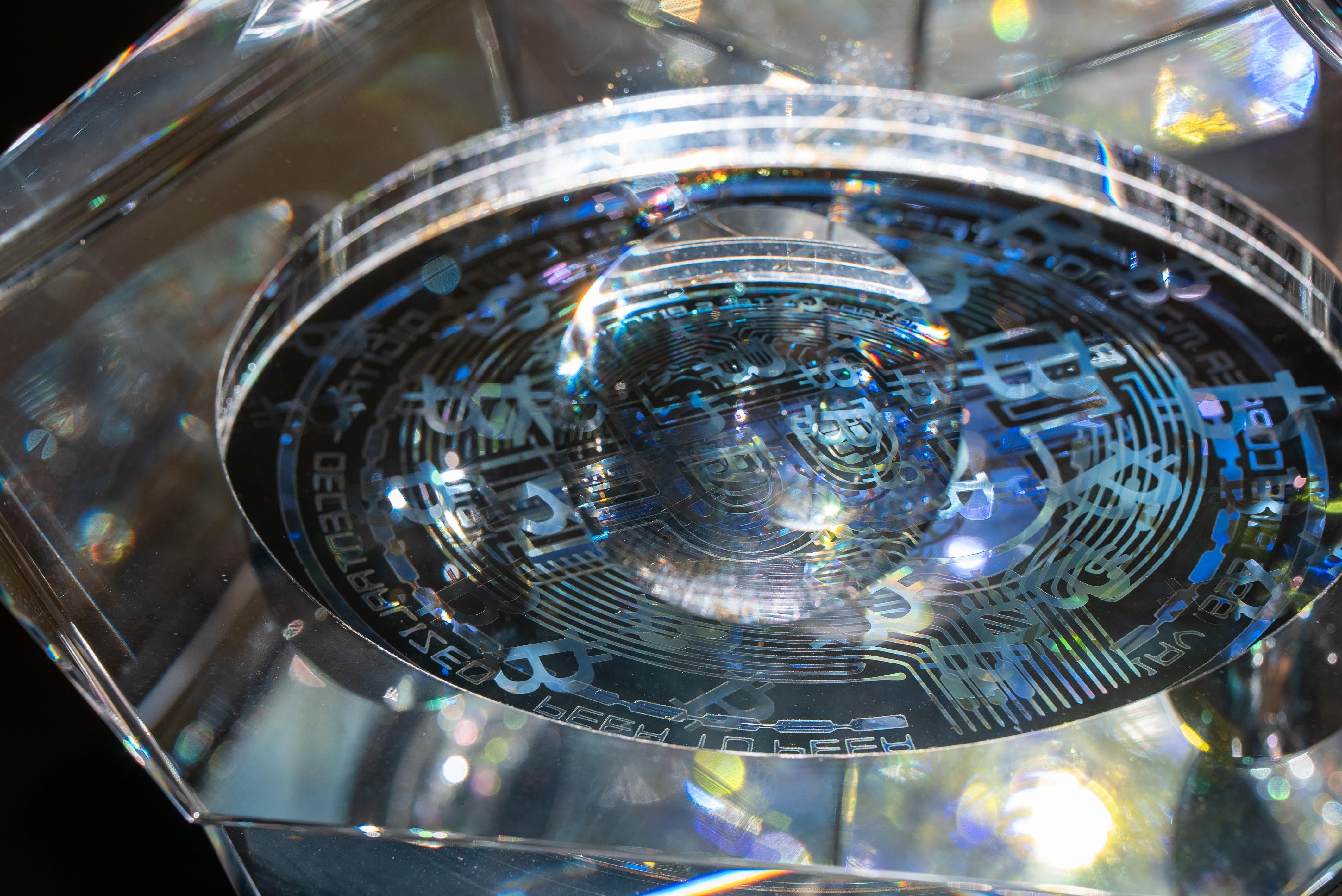 Bitcoin symbol embedded into a beautiful, artistic crystal cube. The artist used the finest NASA grade optic glass, crystal and dichroic coatings to create this piece. The rotating stand it rests on spreads reflected bitcoin symbols around the room as it turns. (The cube alone is just under 20 pounds... it's heavy!)