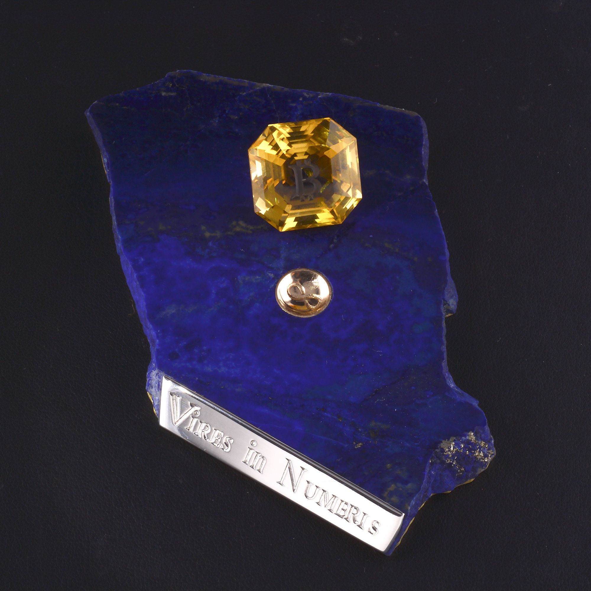Imagine the Bitcoin network in a Gemstone. A large Citrine Quartz, Gemstone engraved with the Bitcoin "B" sits on a 14k Gold cup hand engraved with the "infinity" sign. Displayed on a Lapis Lazuli base, with a solid Brass backing, engraved with my signature and the block time. A Silver plaque is hand engraved with " Vires in Numeris".