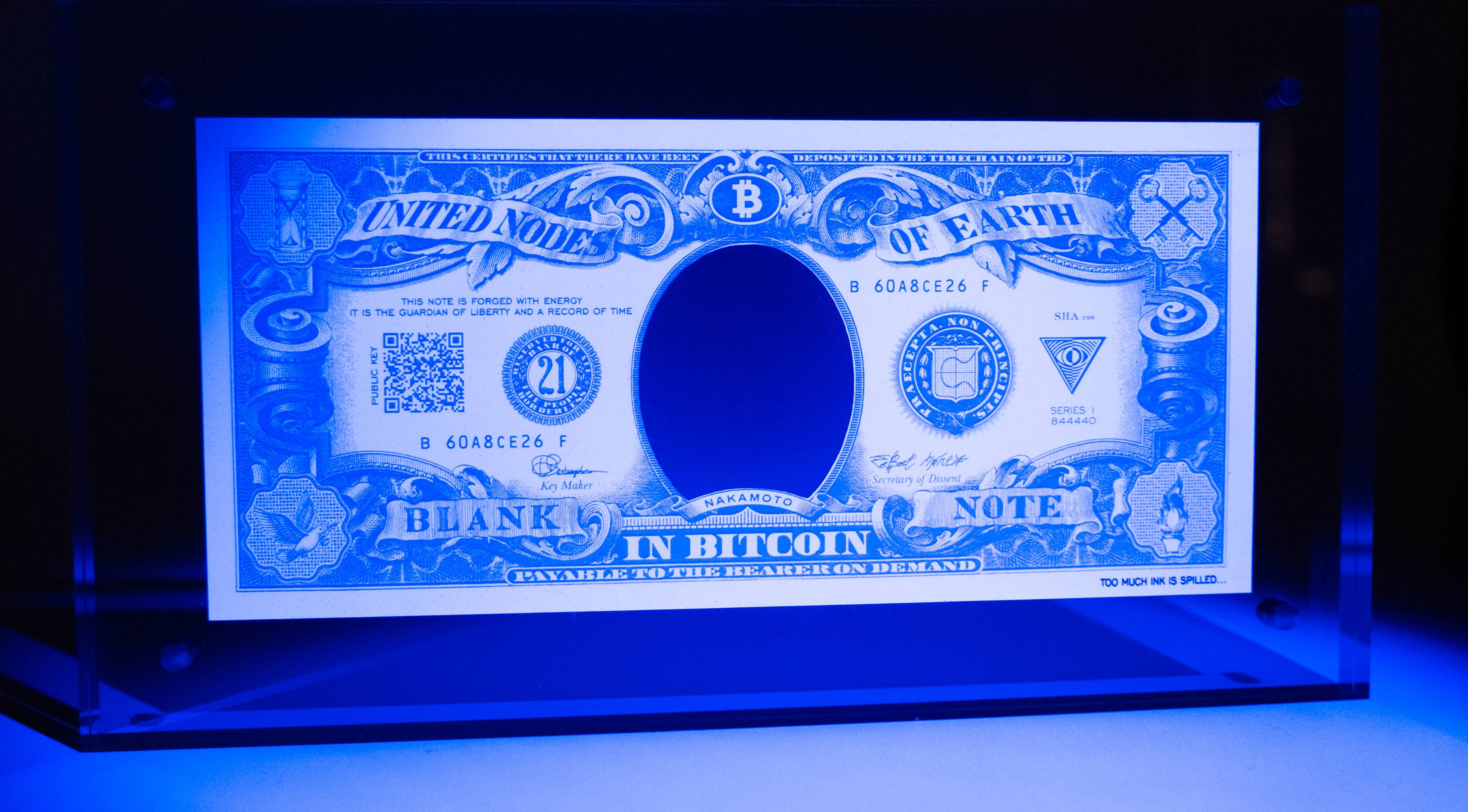 Unlike fiat banknotes, the Blank Note appears humble and offers little to the casual onlooker. Like Bitcoin, to appreciate the piece in its full glory, one must look beyond the obvious and seek the truth within. Under higher energy Ultra Violet light, the piece is revealed, allowing its message and intricacies to be explored.
