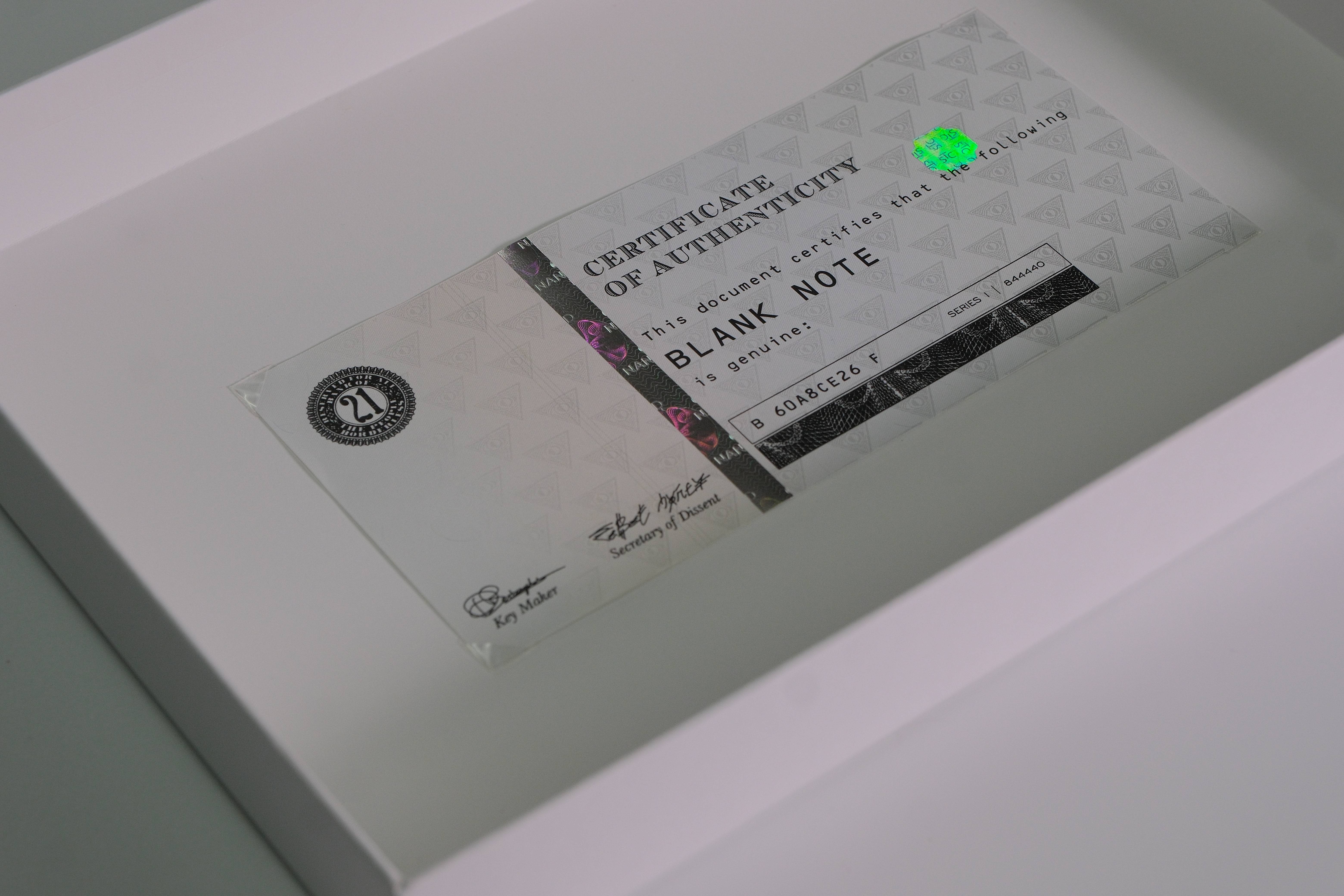 The Blank Note is a unique piece created protest against the amount of money printed by governments, surveillance and manipulation of its citizens and the resulting degradation of society.