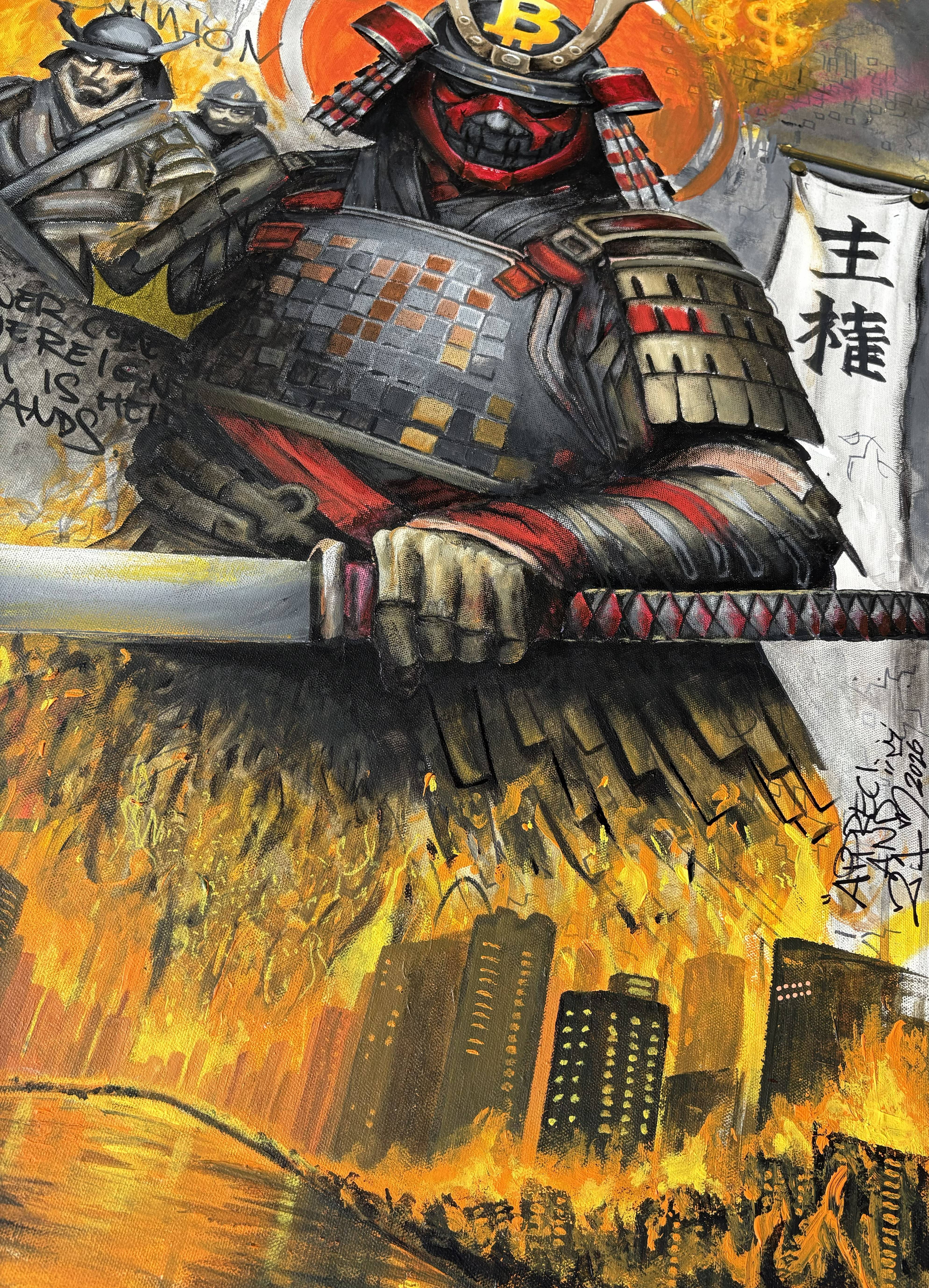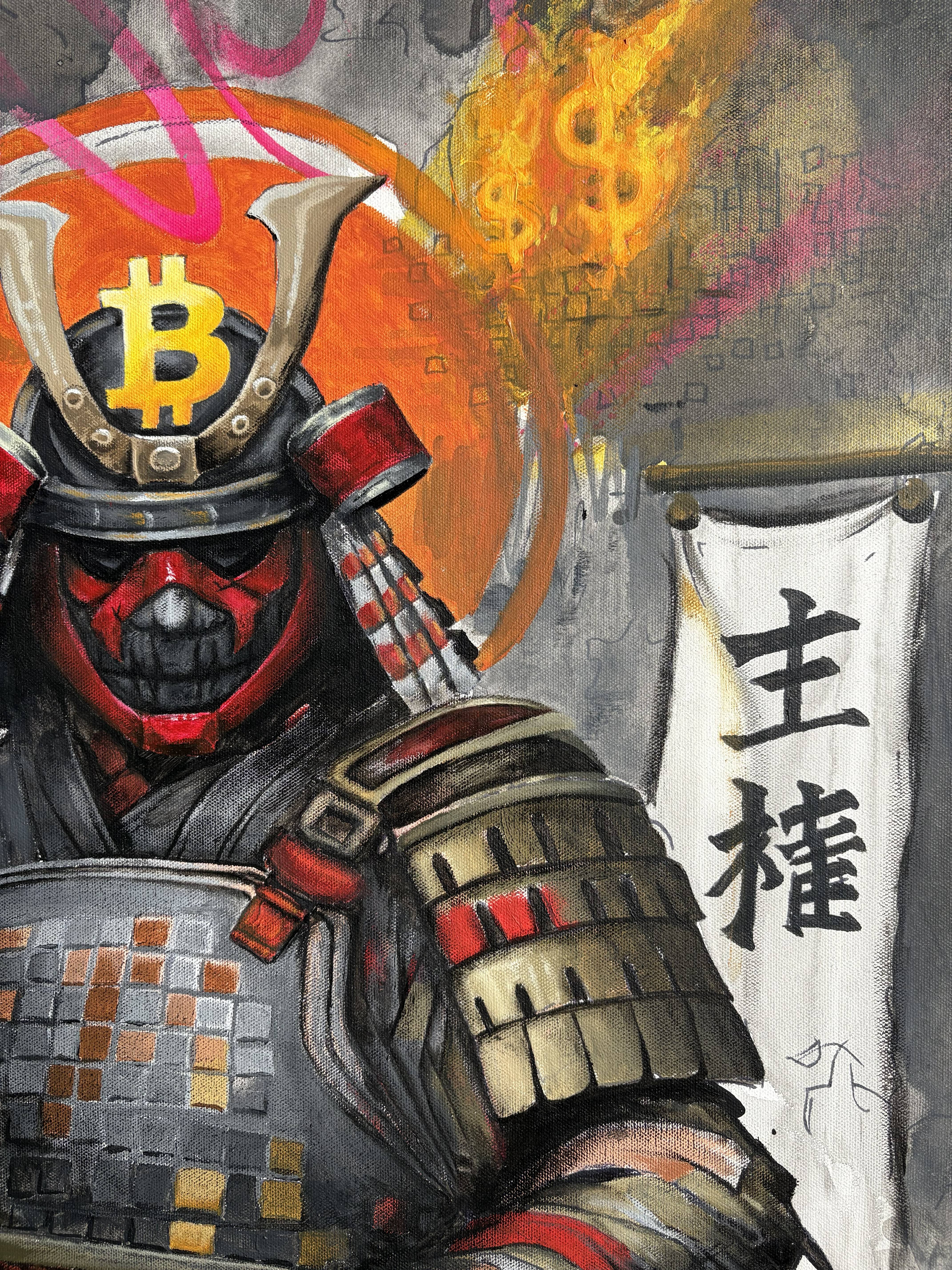 Inspired by Samourai Wallet, this 1/1 handmade piece represents sovereignty through self-custody. It captures part of Bitcoin history through art. The samurai can be seen as a figure of autonomy and independence. The armor brings a sense of protection and preparedness, while the surrounding fire suggests resistance and confrontation. Crowned with the Bitcoin crest, the warrior carries an ideology that extends beyond the battlefield and noise. This is not just a warrior; it is financial autonomy. Acrylic on canvas. 36" x 24". (2026).