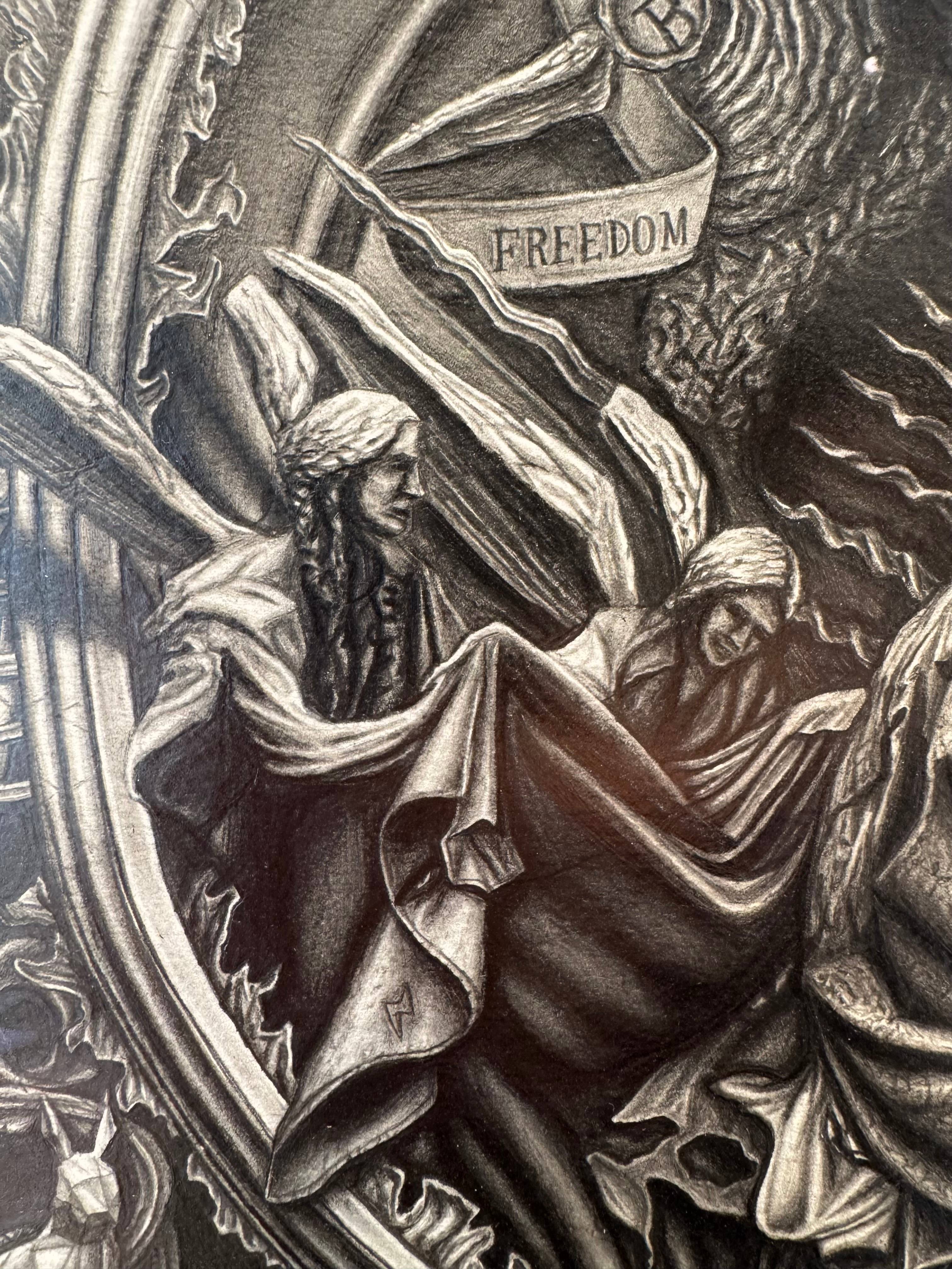 The surface of this pencil drawing is treated with original Hahnemuehle protective spray to prevent yellowing and smudging, however the drawing should still be handled with the utmost care.